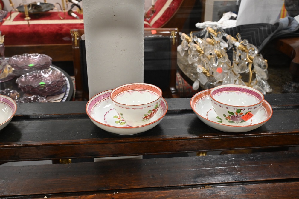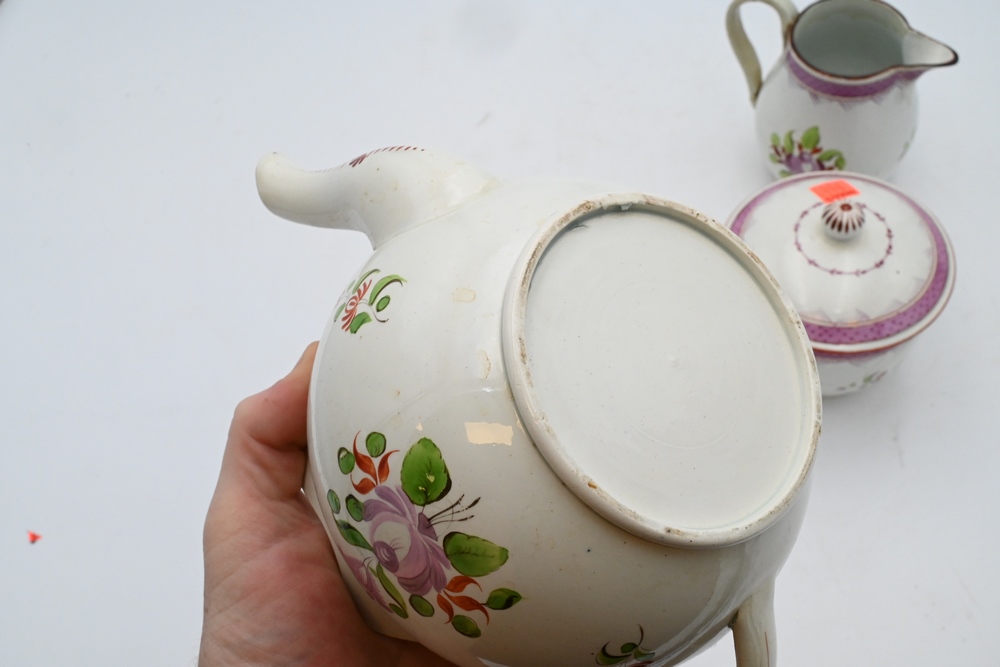 Lot 483: 22 Piece Set of Soft Paste to include teapot, creamer, covered sugar bowl, ten saucers, and nine cups, damage to creamer handles, sugar, several cups with chips repaired teapot height 5 1/2 inches
