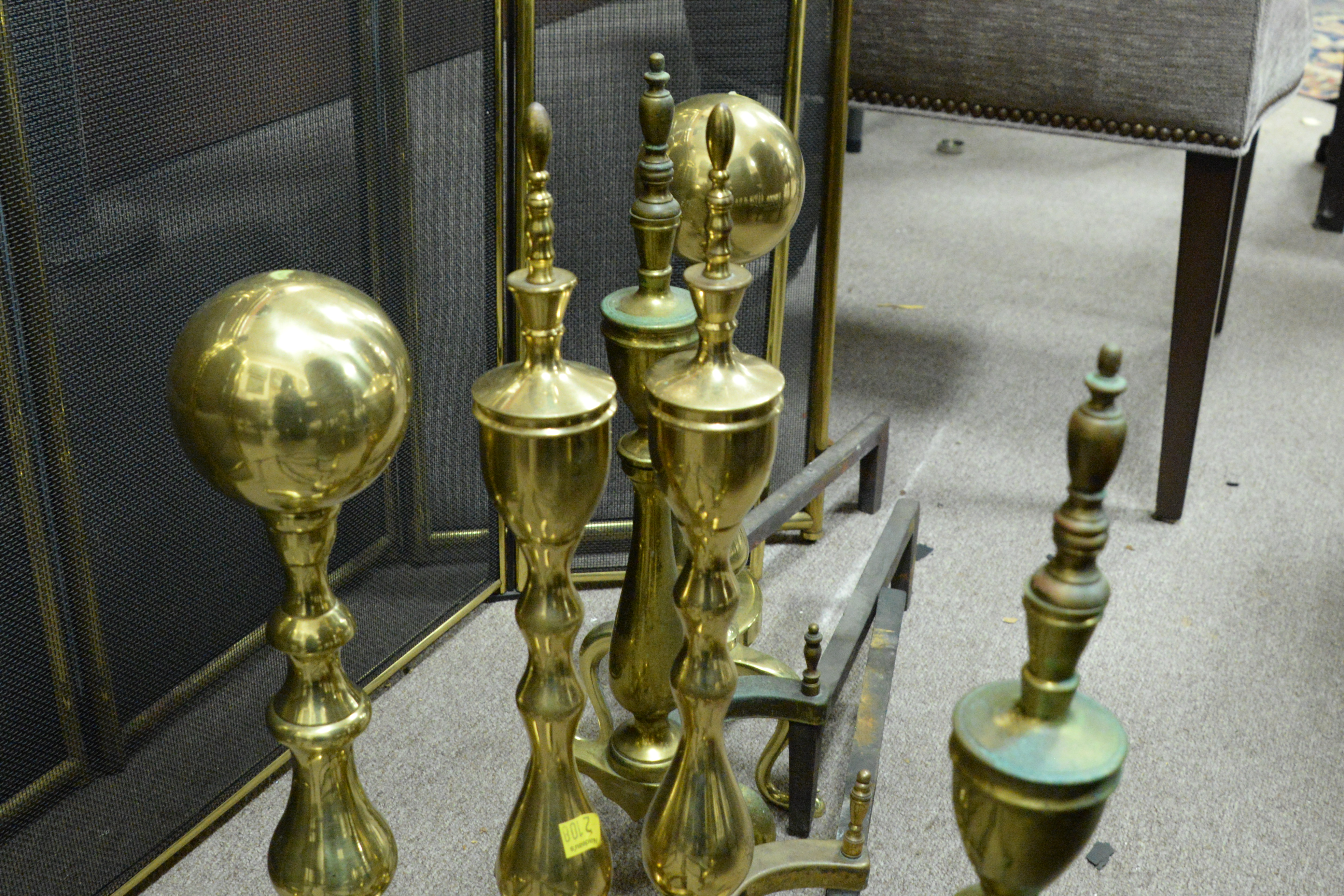 Brass Fireplace Grouping, to include, two fire screens, along with three pairs of andirons, tallest pair of andirons 22 inches