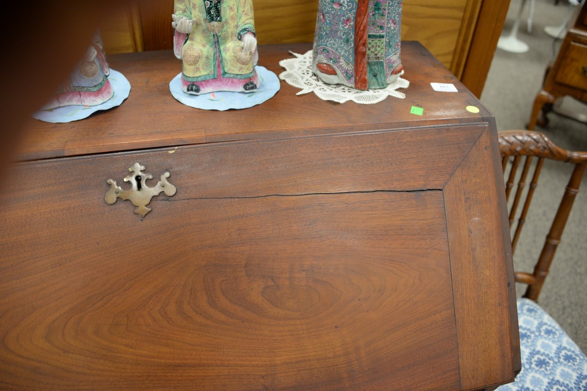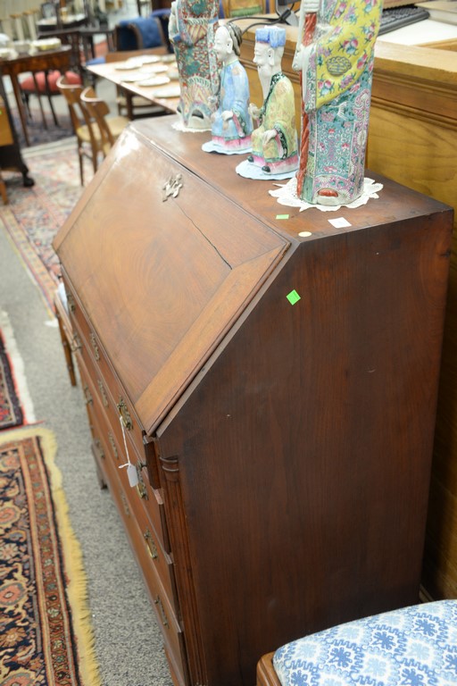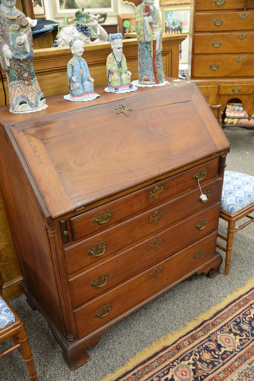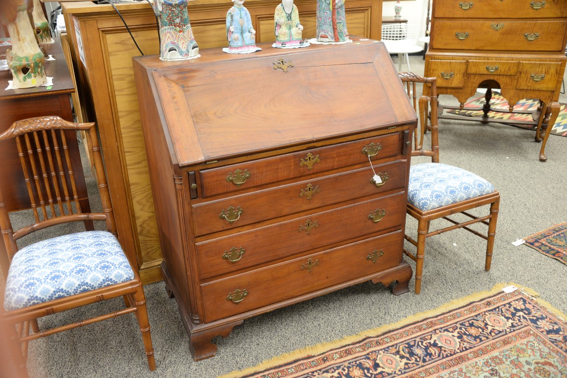 Lot 483: Chippendale walnut desk having slant lid over four drawers flanked by fluted quarter columns, set on ogee feet, interior with serpen…