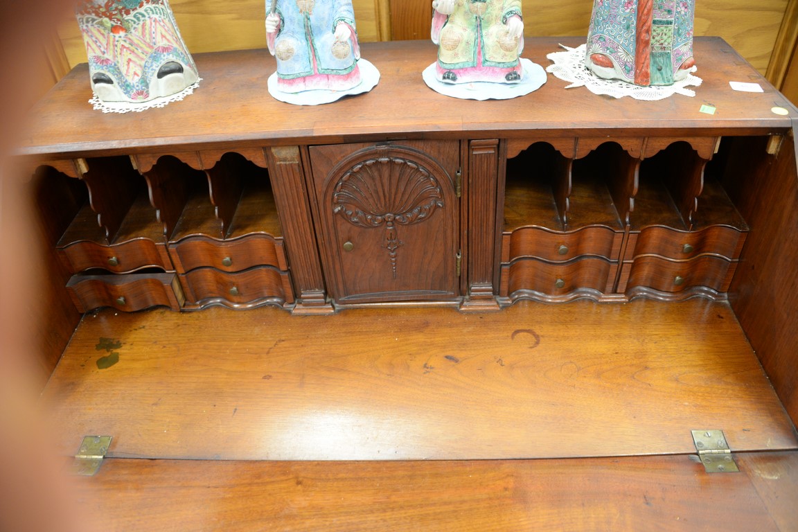 Chippendale walnut desk having slant lid over four drawers flanked by fluted quarter columns, set on ogee feet, interior with serpentine drawers and a shell carved center door, circa 1780. height 44 inches, width 40 inches, depth 21 inches Provenance: Estate of R. Donald Bassette