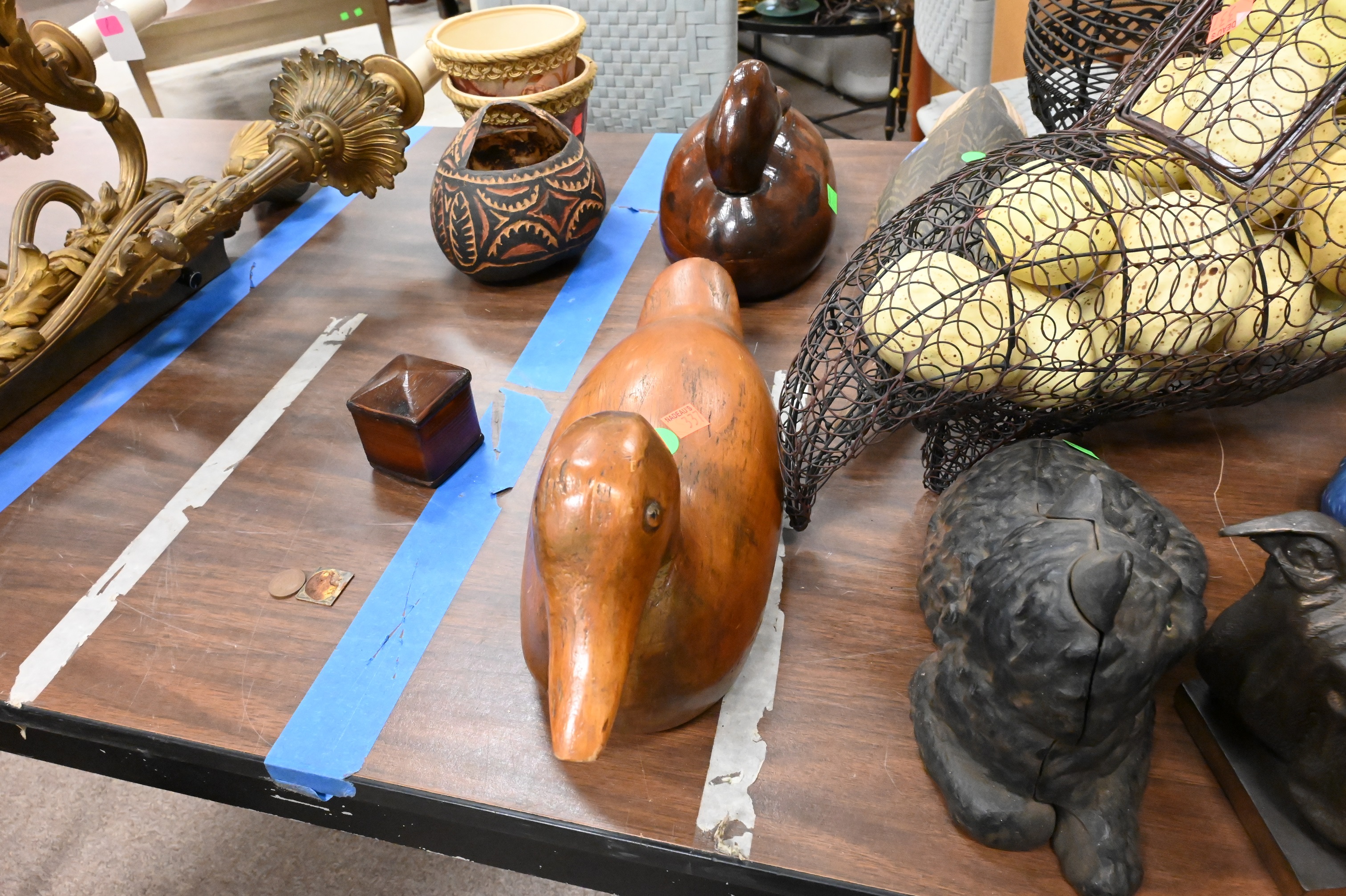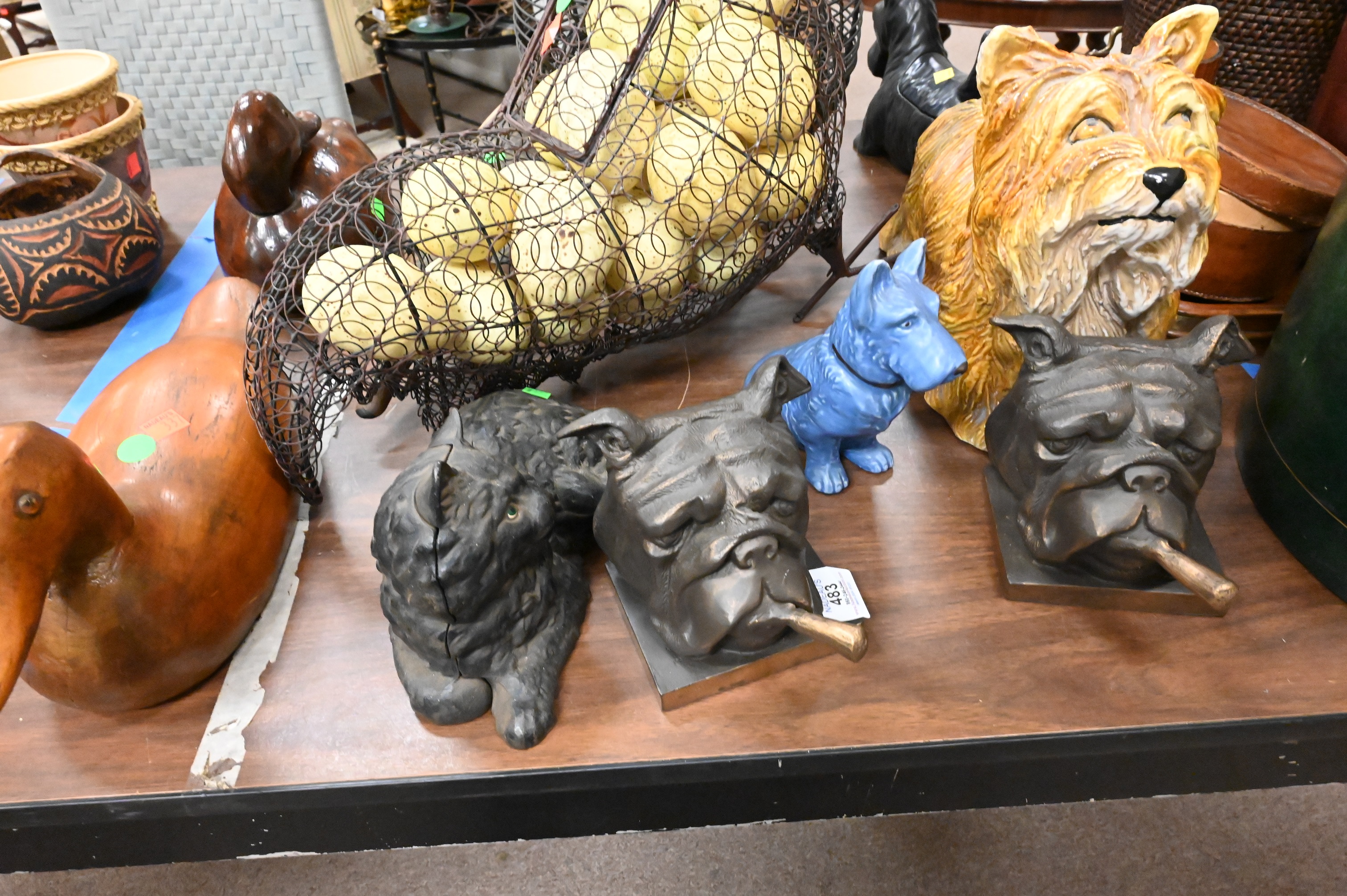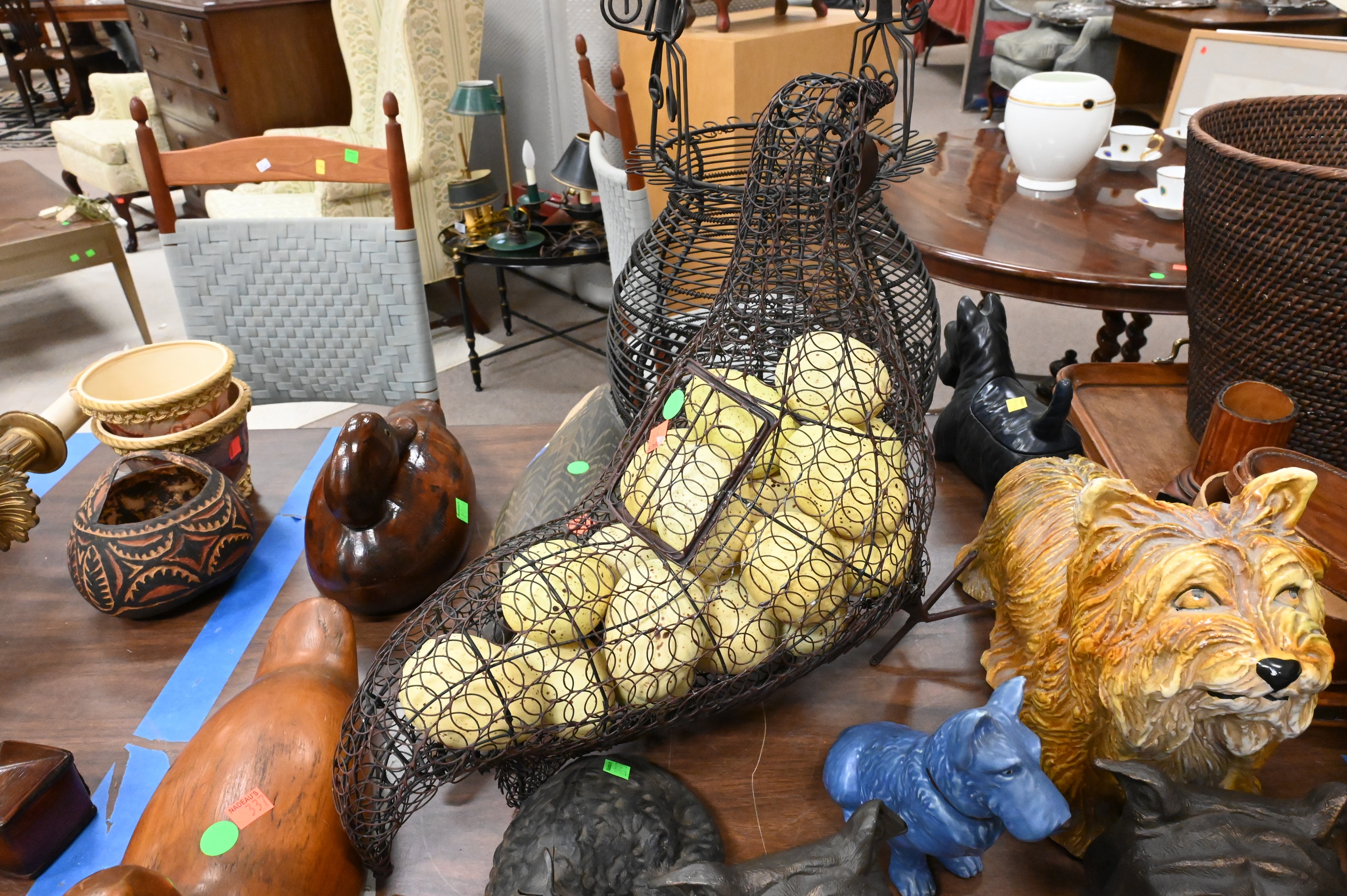 to include Italian ceramic yorkie, Will Kirkpatrick carved duck, wire chicken with urn, along with additional dog/yorkie sculptures
