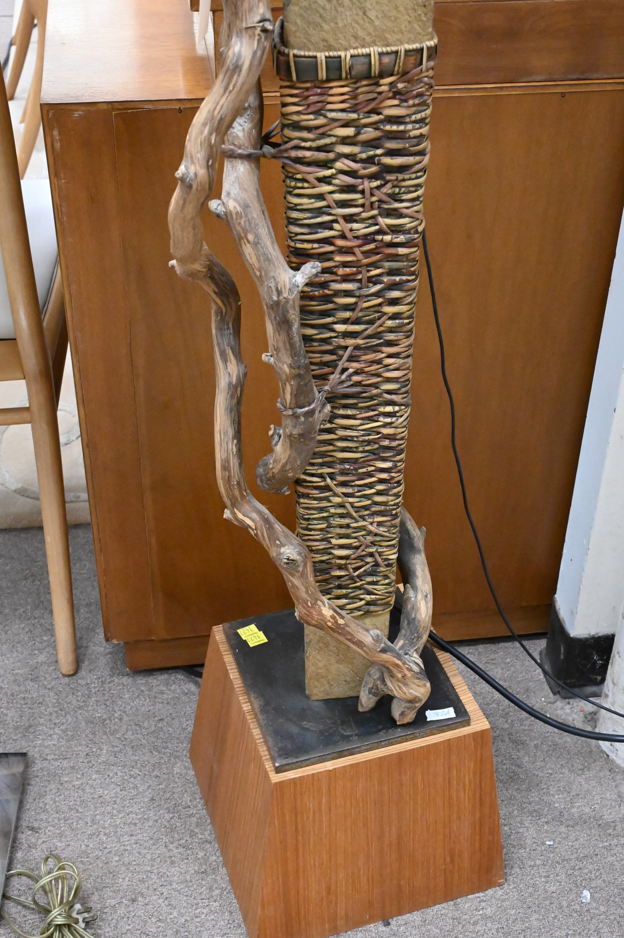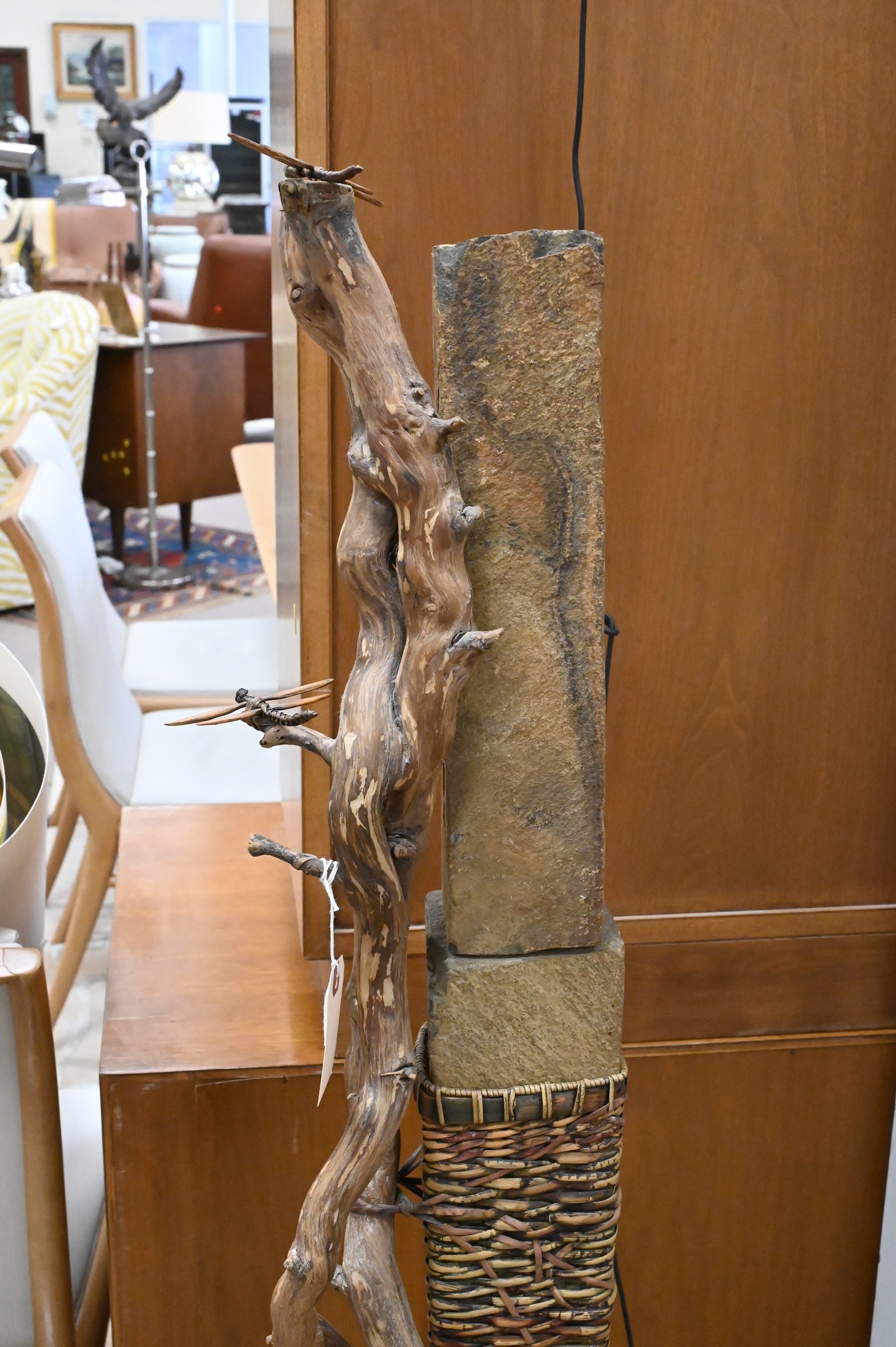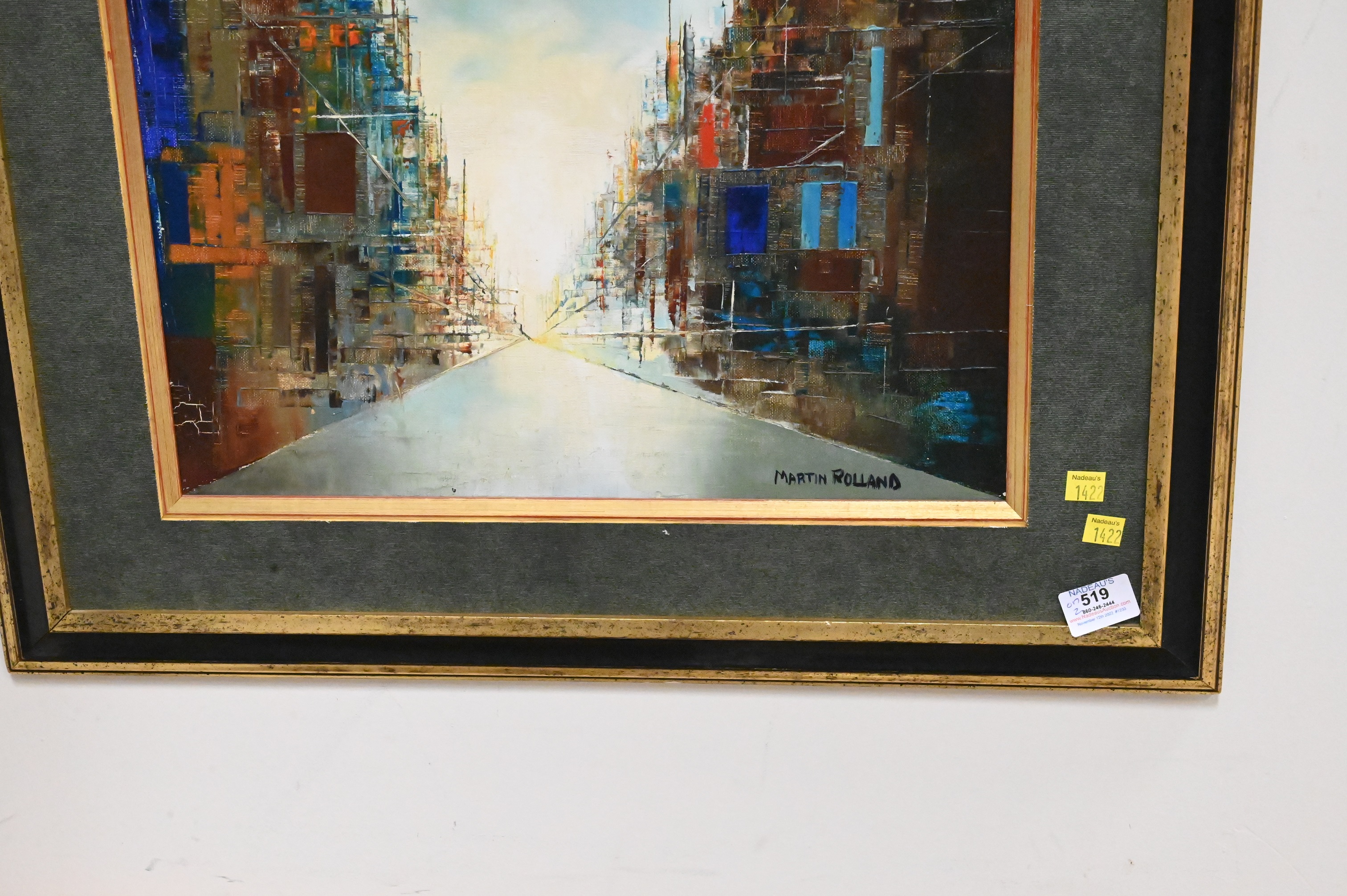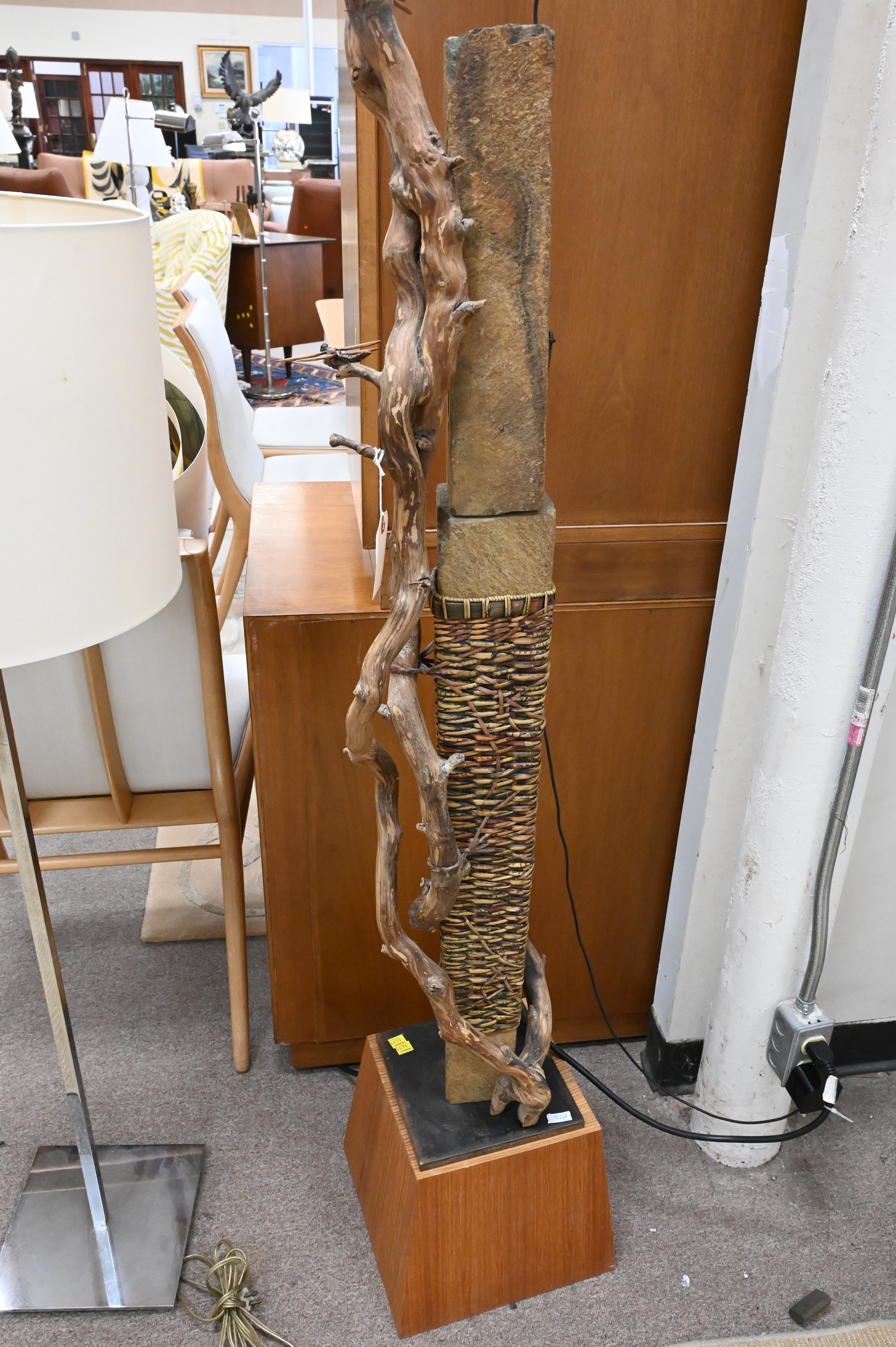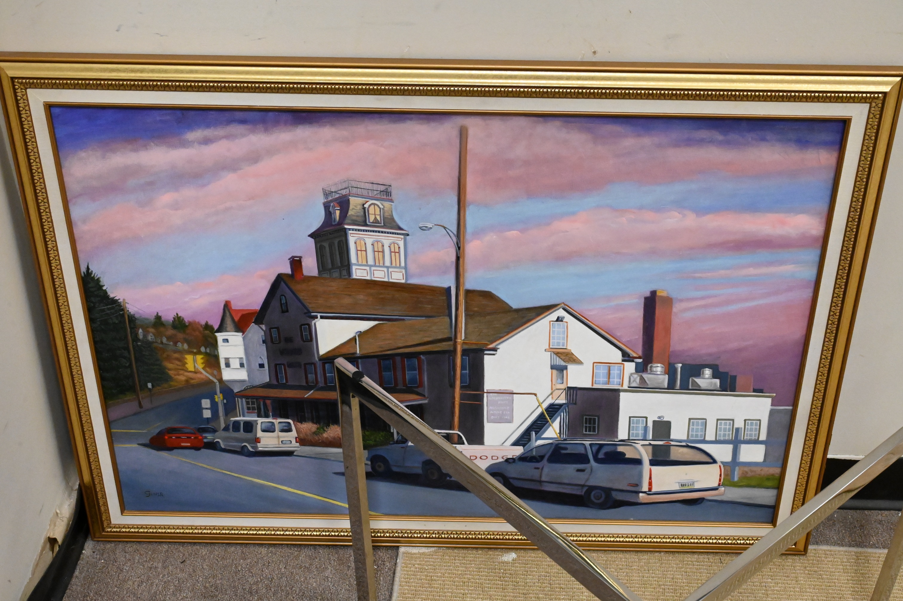 Five Piece Lot, to include Thomas McNickle (b. 1944), Barn with Two Corn Cribs, 2022, watercolor, signed lower right, Jerald Melberg Gallery label on back, 14 1/4″ x 21 1/4″; two framed paintings, to include Jim Gunning, The Washington House, Sellersville, PA”, 2002, oil on canvas; Martin Rolland, abstract cityscape, oil on canvas, 23 1/2″ x 35″ and 20 1/2″ x 17 1/4″, along with a Deloss Webber stone and fiber sculpture, having decorative dragonflies throughout, height 54 inches; along with a 3′ x 4′ 7″ Native American style throw rug.