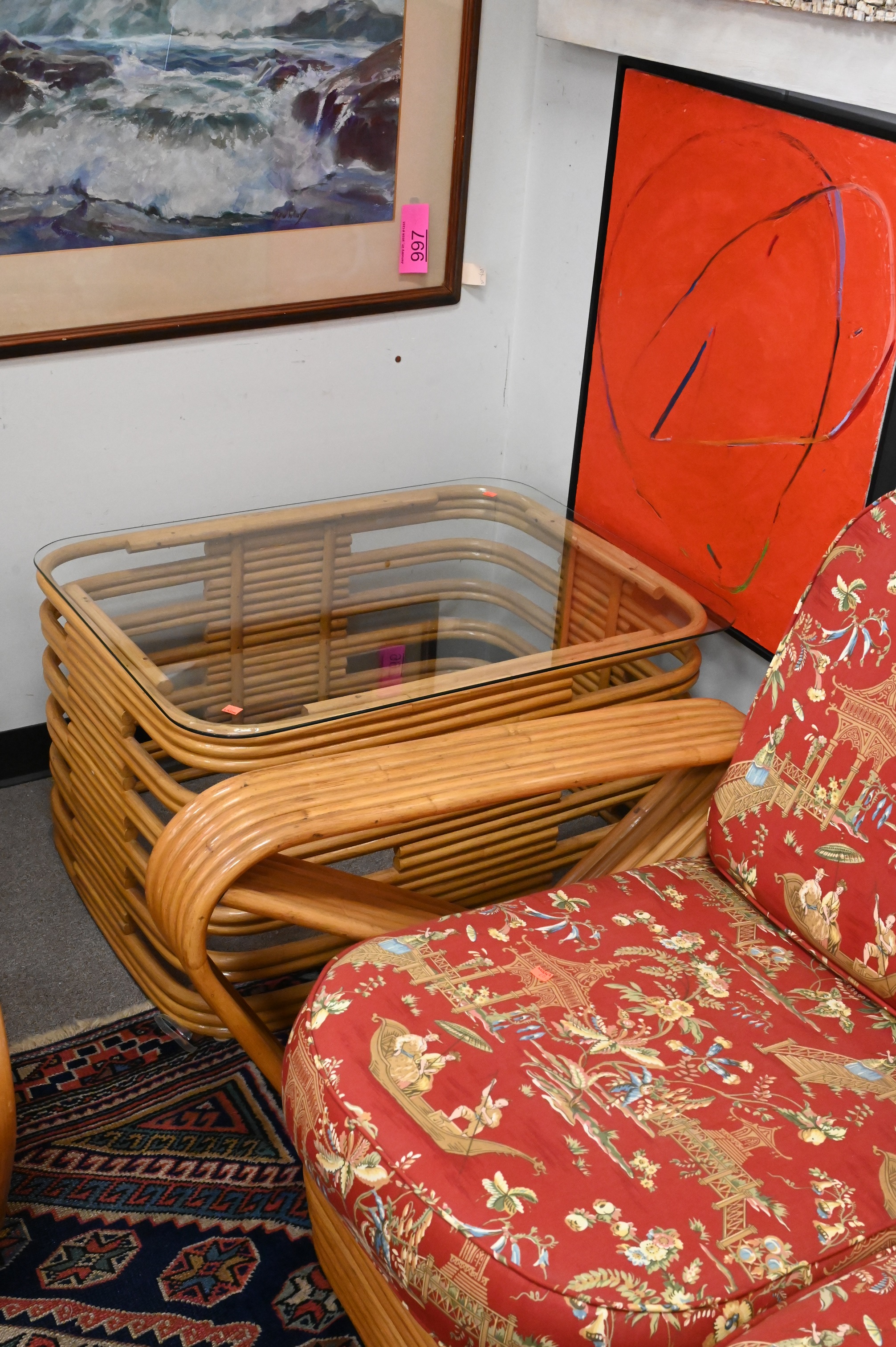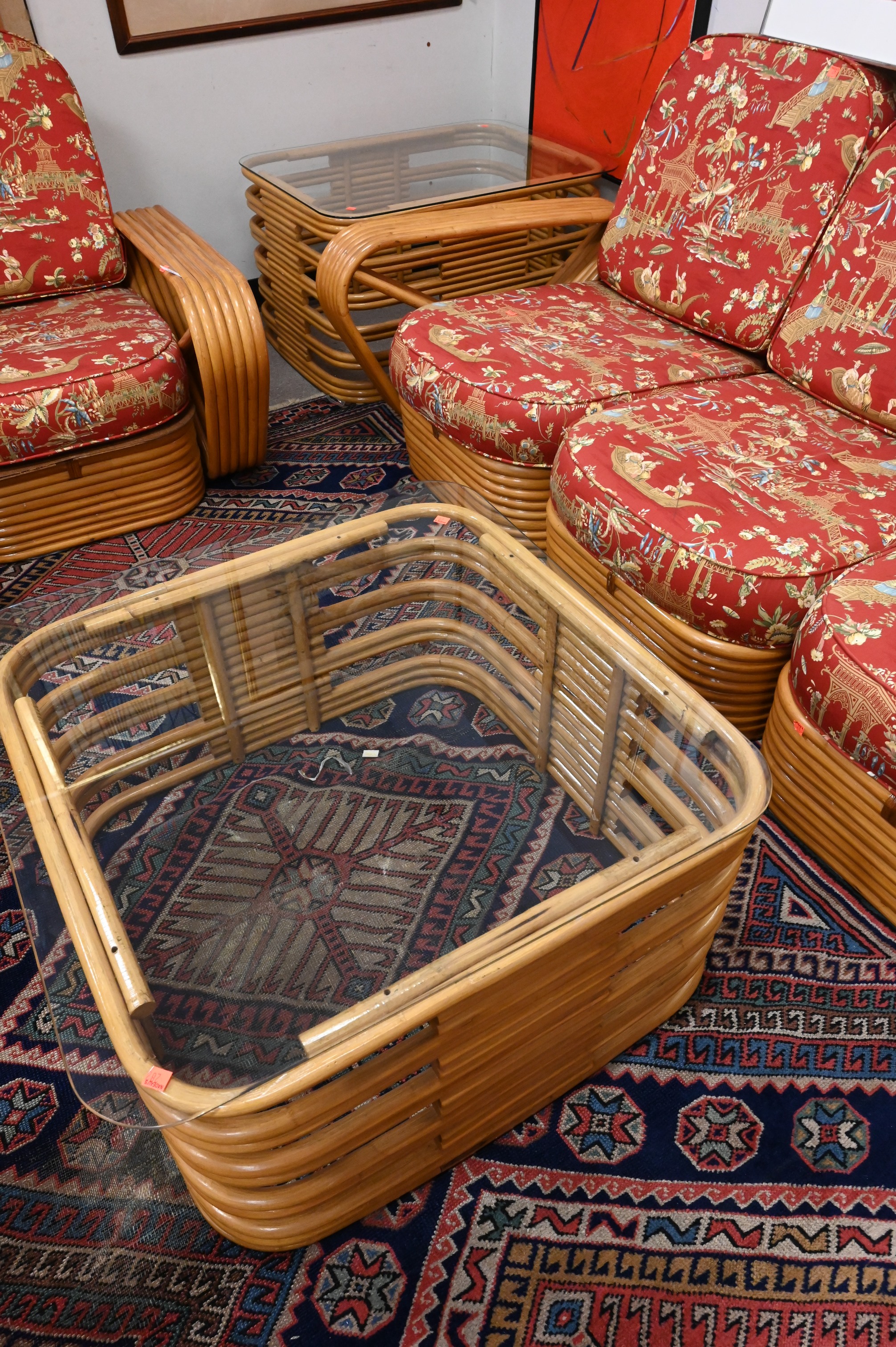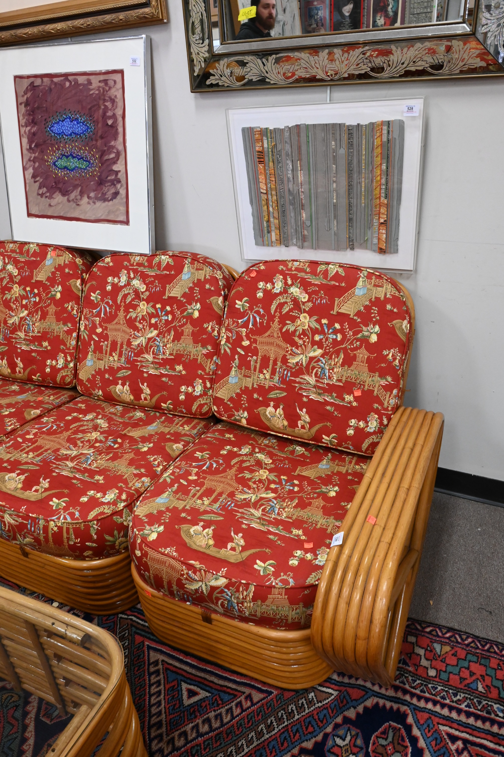 to include a Paul Frankl rattan bamboo streamline three part sofa along with a pair of Paul Frankl rattan end tables and one coffee table