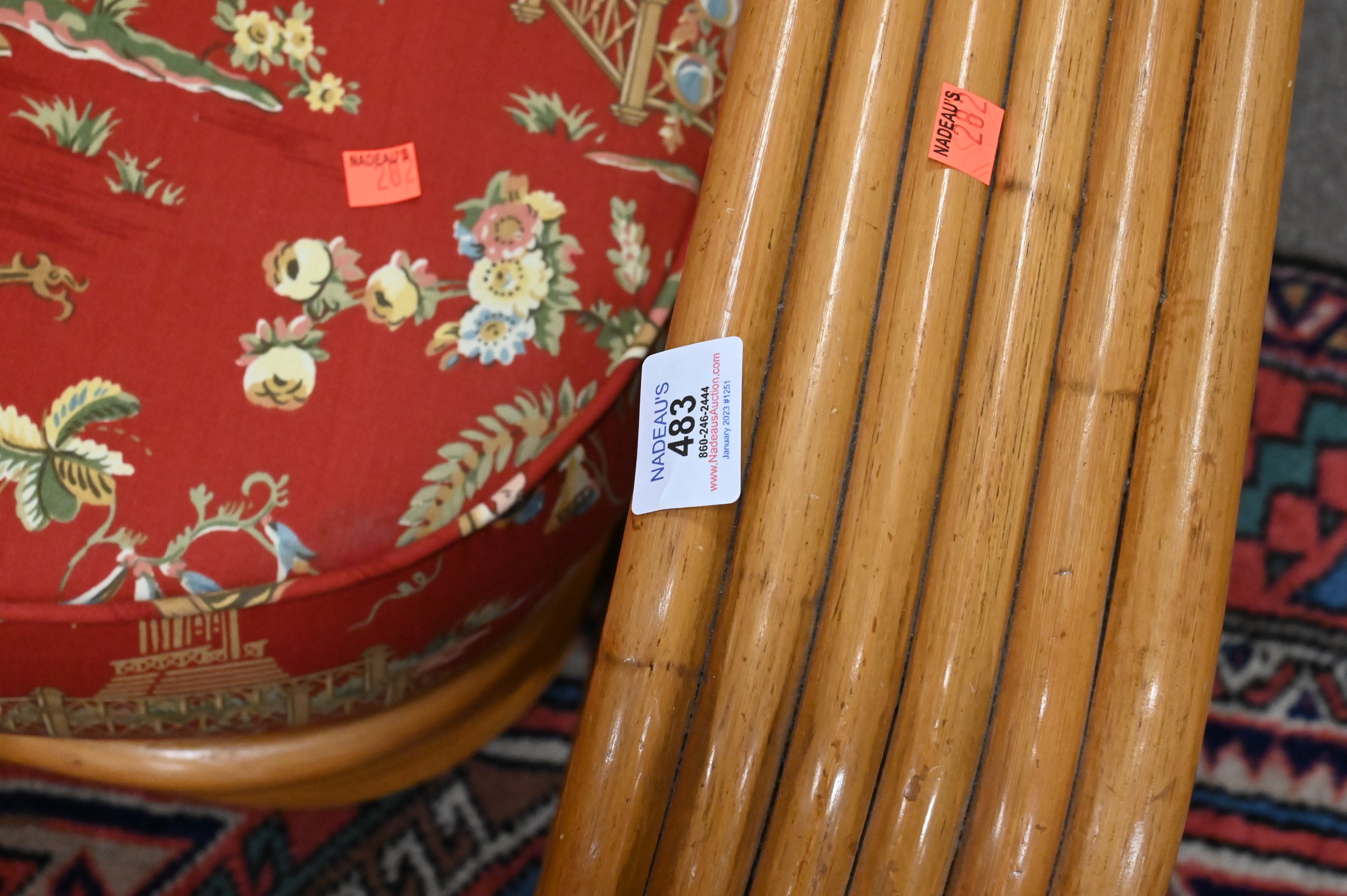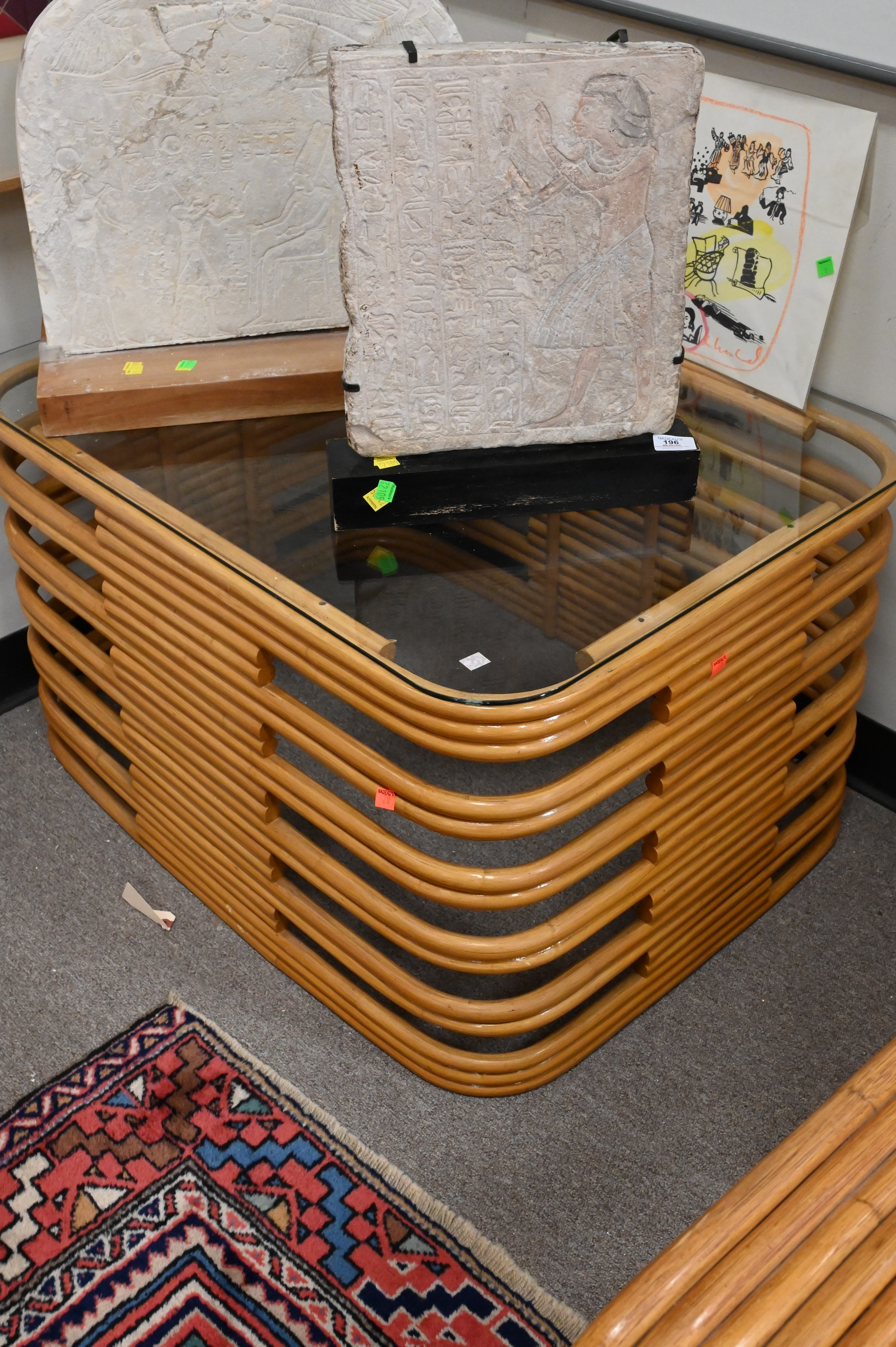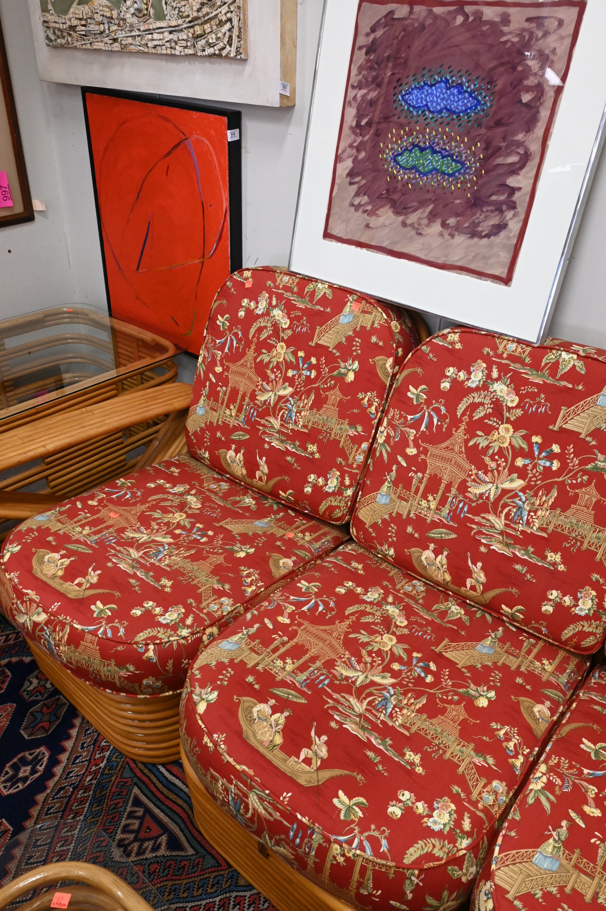 to include a Paul Frankl rattan bamboo streamline three part sofa along with a pair of Paul Frankl rattan end tables and one coffee table