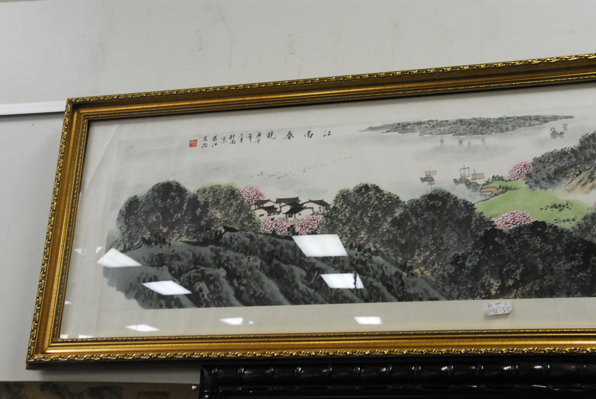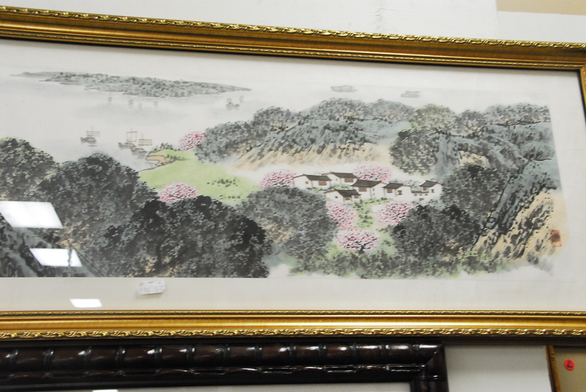 Lot 483: Group of three framed Oriental paintings watercolor on paper framed landscape 13 x 53, watercolor on paper of lily pond at dusk, …