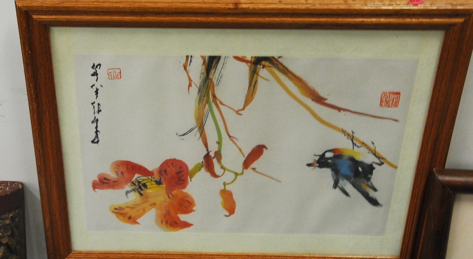 Group of three framed Oriental paintings watercolor on paper framed landscape 13 x 53, watercolor on paper of lily pond at dusk, and watercolor on paper with flowers and bird.