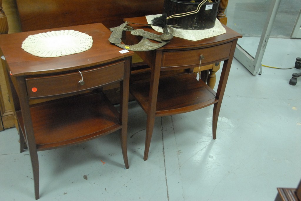 Lot 483: Pair of Margolis mahogany bedside tables with one drawer, bowed front, and remedial shelf on flared tapered legs. ht. 28in. wd. 20i…