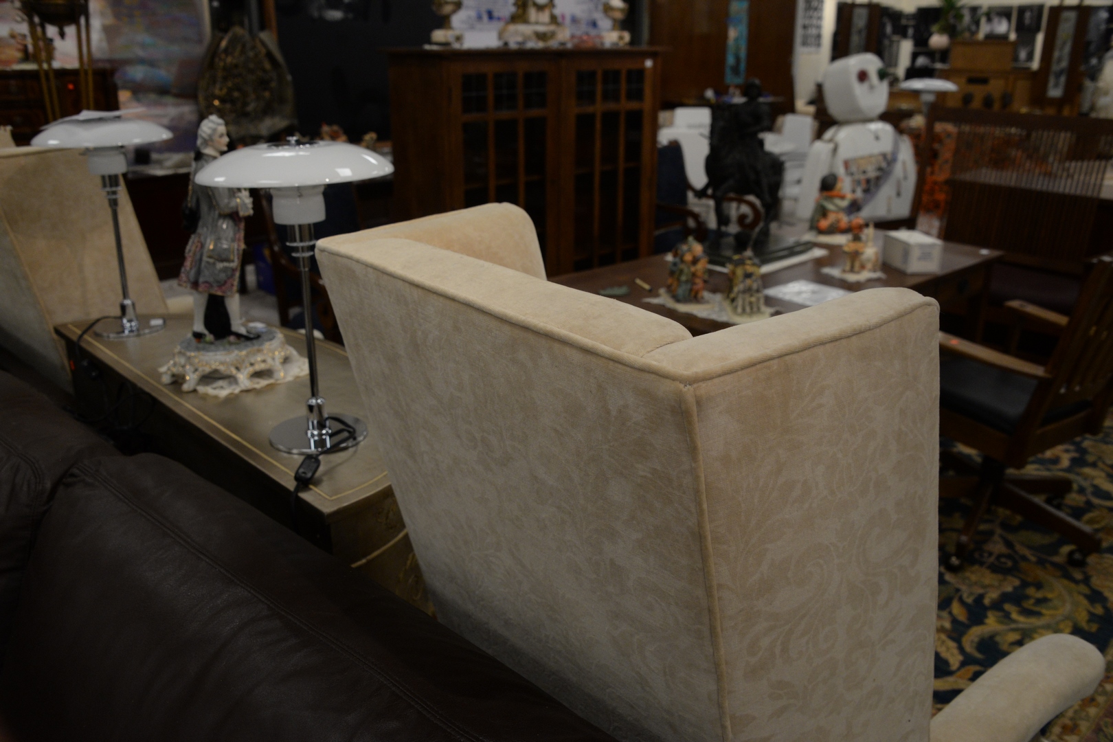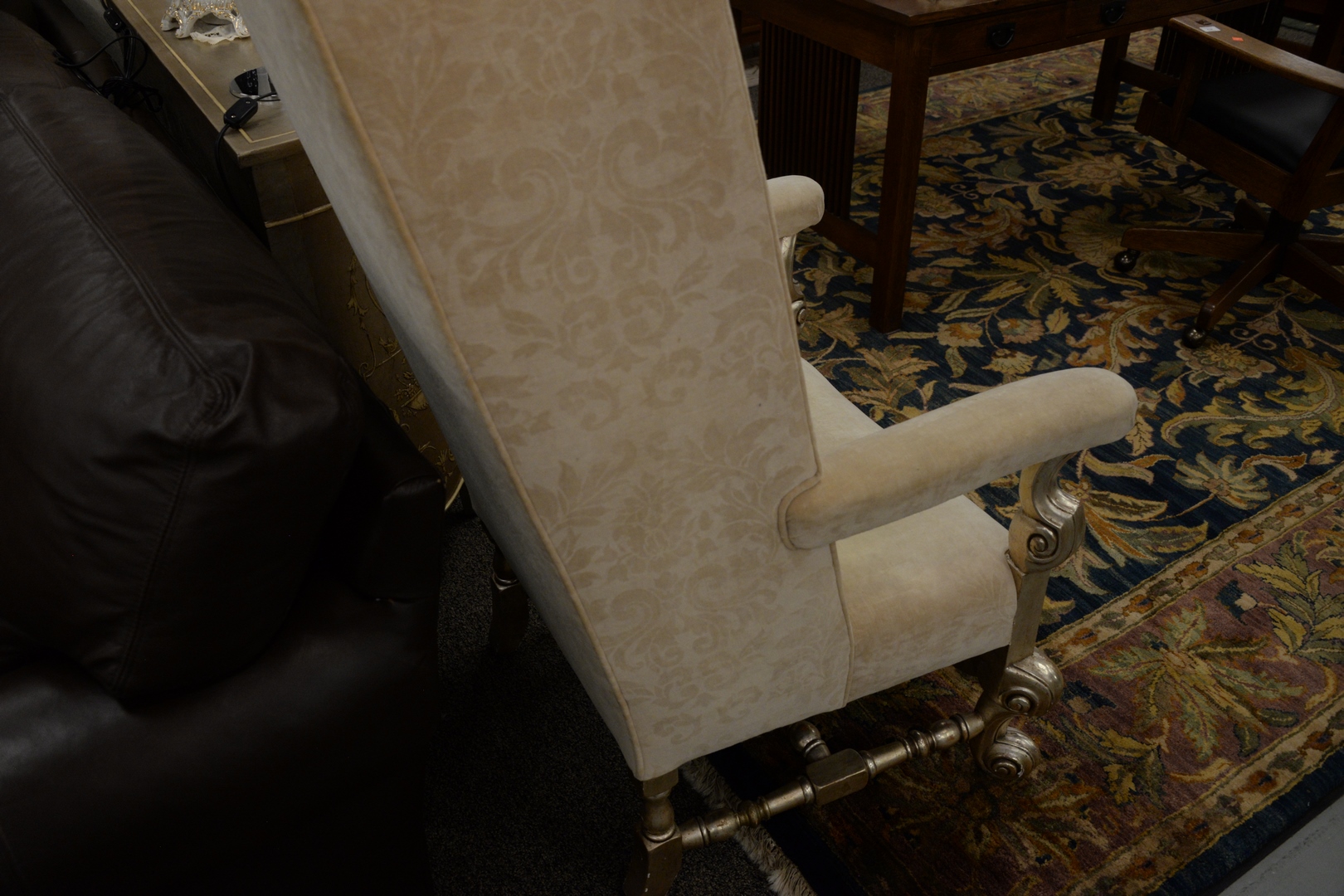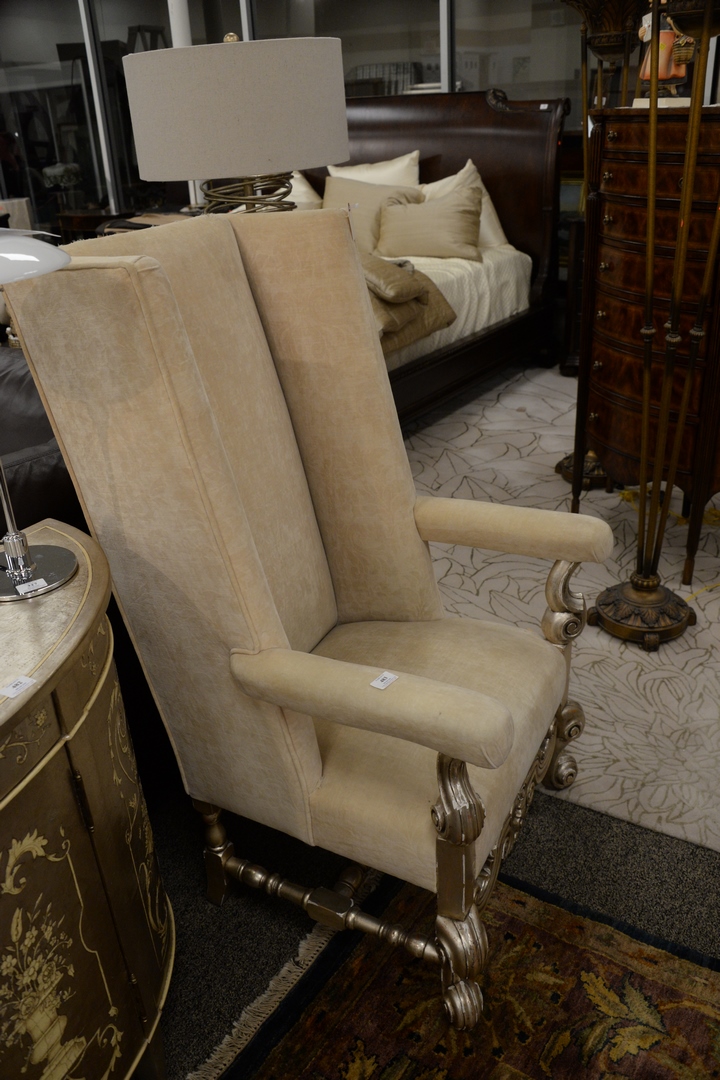 Lot 483: Pair of Upholstered Open Armchairs, with silvered frames, slight imperfections to top of one chair, height 51 inches, width 29 inches.