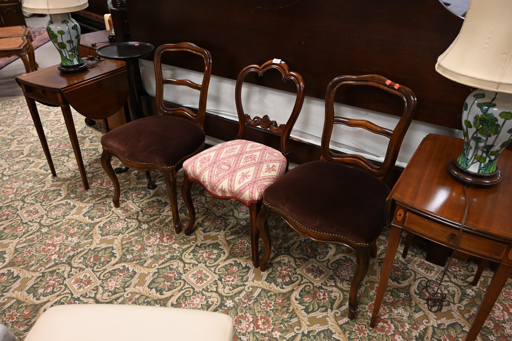 Six Piece Lot, to include three Louis XV style side chairs, one round stand ending in ball and claw feet, along with a pair of bande…