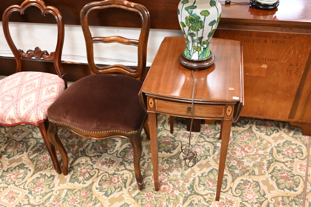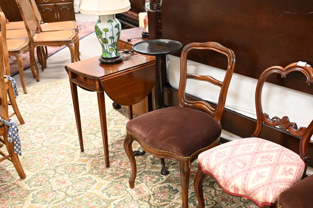 Lot 483: Six Piece Lot, to include three Louis XV style side chairs, one round stand ending in ball and claw feet, along with a pair of banded inlay drop leaf tables, each having one drawer, table height 26 inches,