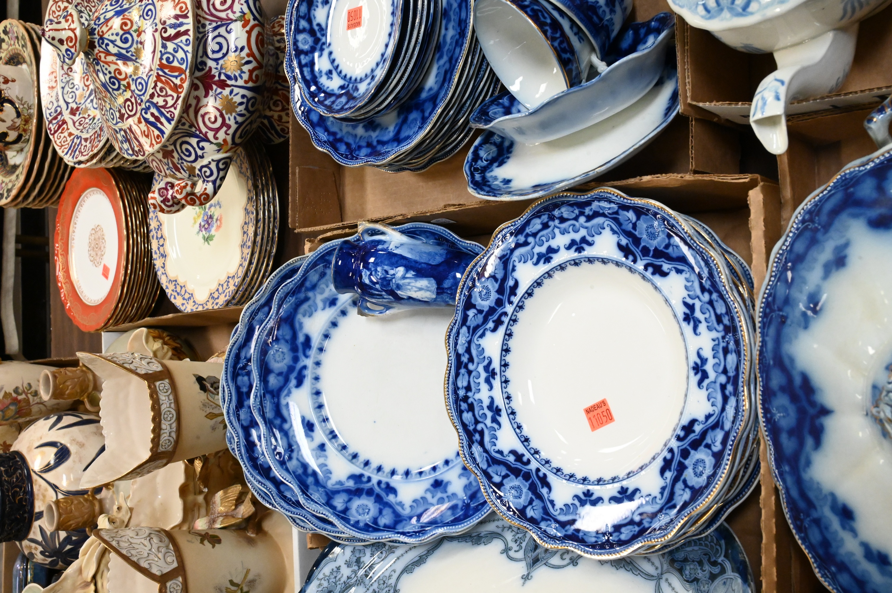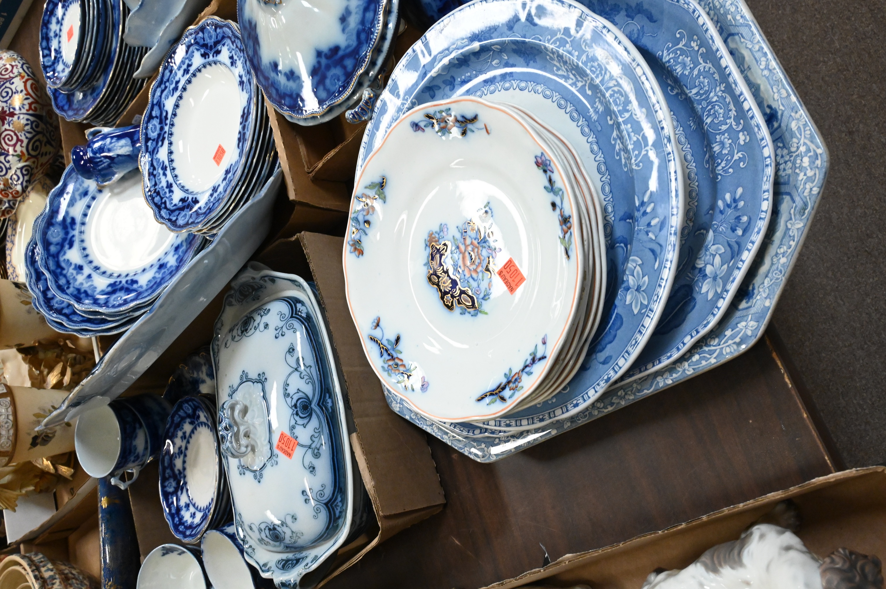 Six Tray Lots of Staffordshire Blue and White Transferware and Flow Blue
