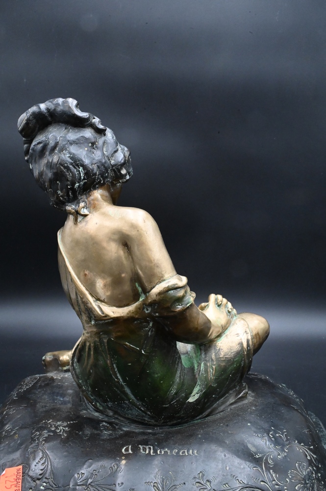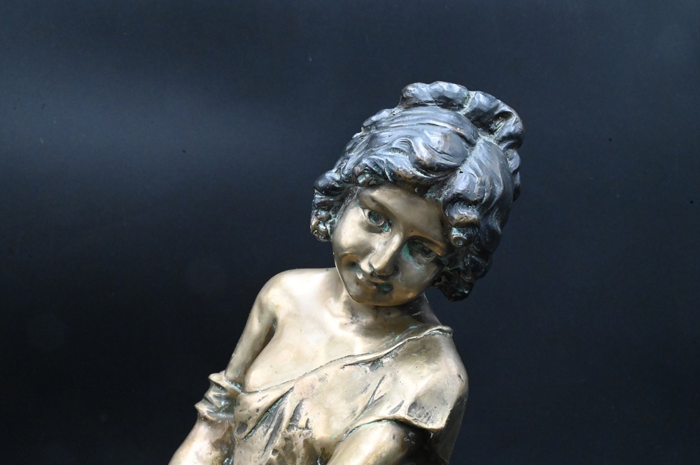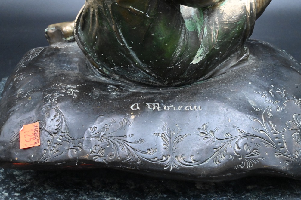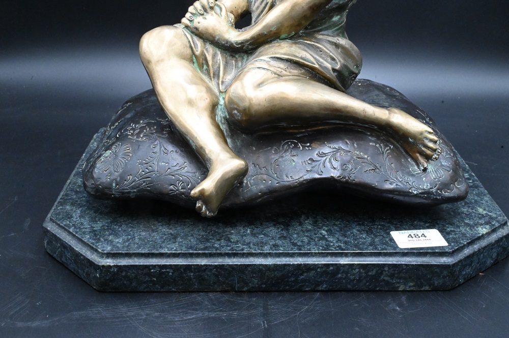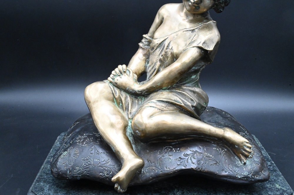 After A. Morceau Bronze, girl on pillow on marble base, late 20th century, height 14 1/2 inches.