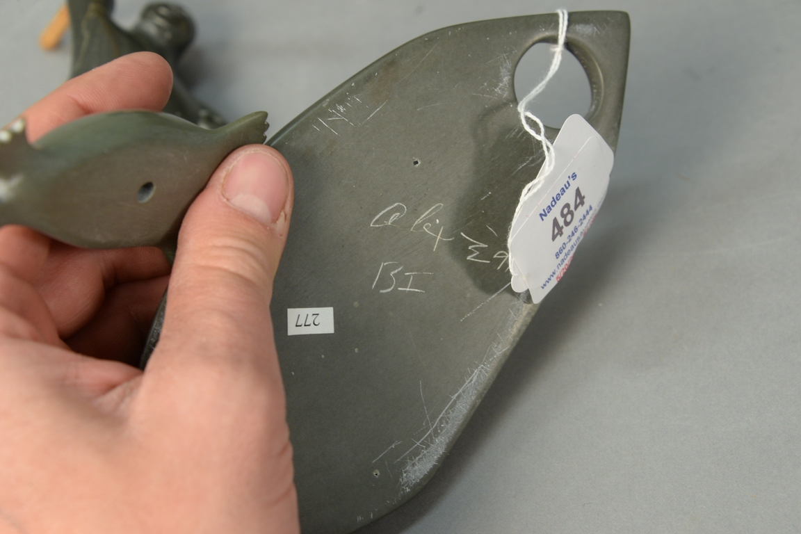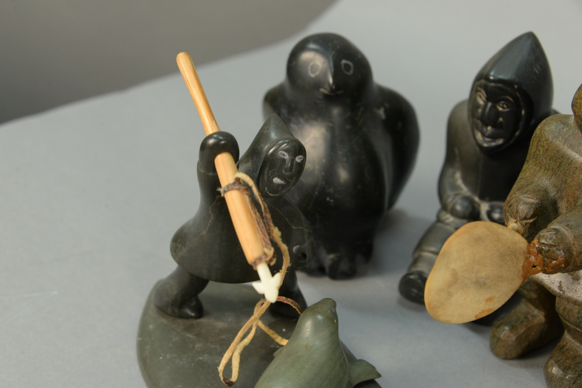 Lot 484: Five Inuit Eskimo figural carvings including dark green serpentine Drum Dancer Provenance: Gallerie Elca London Montreal, Canada,…