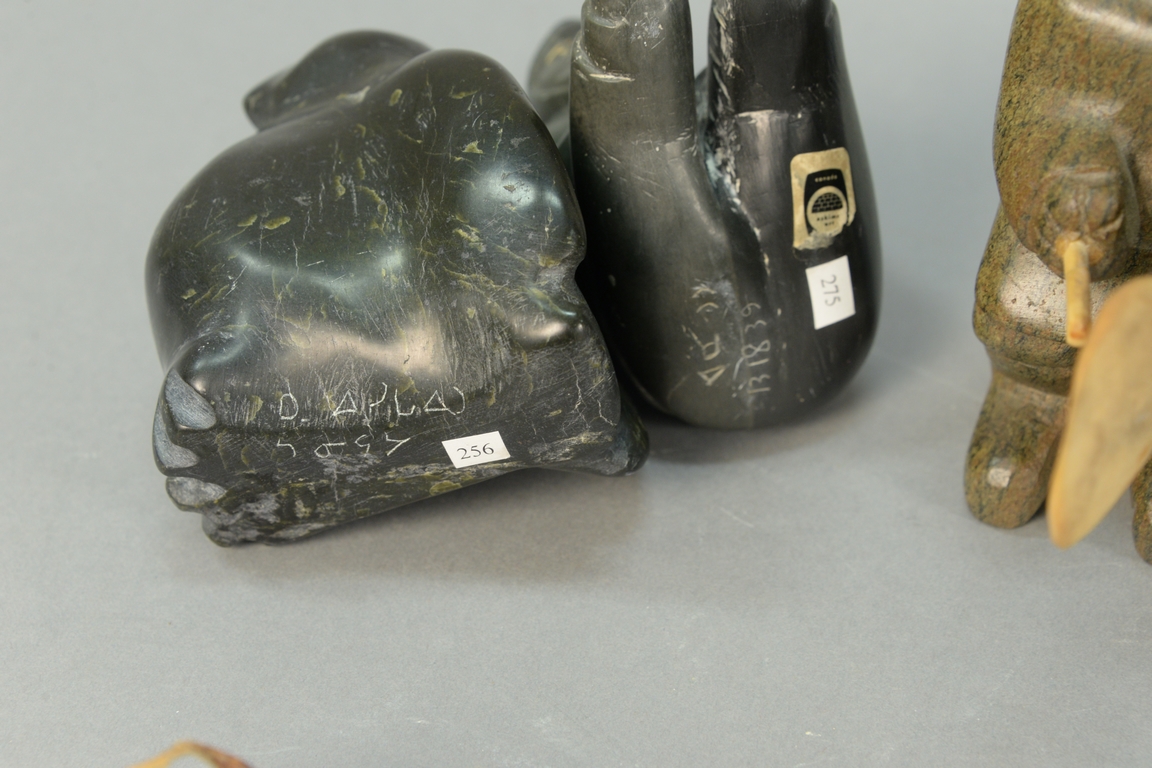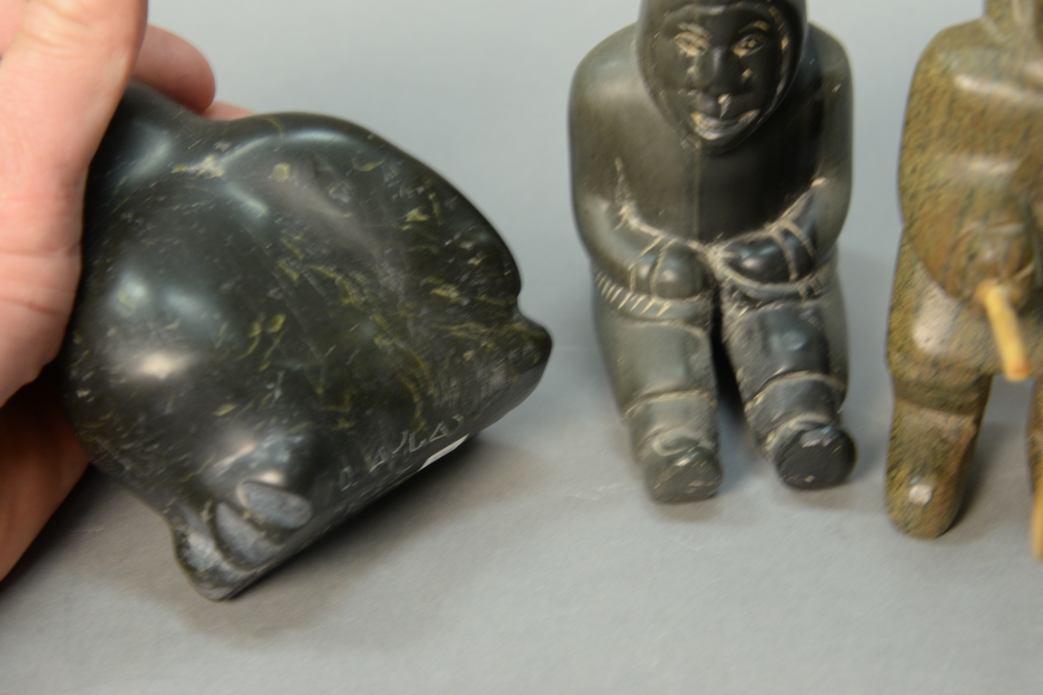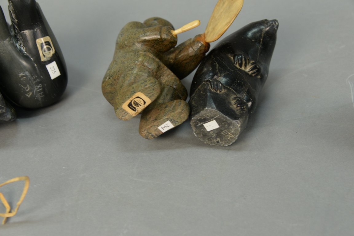 Five Inuit Eskimo figural carvings including dark green serpentine Drum Dancer Provenance: Gallerie Elca London Montreal, Canada, Allie Appaqaq Jr. 1943 Sanikiluaq green soapstone Bird Spirit Hunter with Seal 7 1/2 x 5 1/2, Mina Tooktoo Great Whale River dark green soapstone Sitting Man 4 3/4, Peter HM Cape Dorset black serpentine Standing Beaver, and David Issigaitok 1936 Hall Beach black serpentine Bird 4 lengths smallest to largest 4in. to 5in.