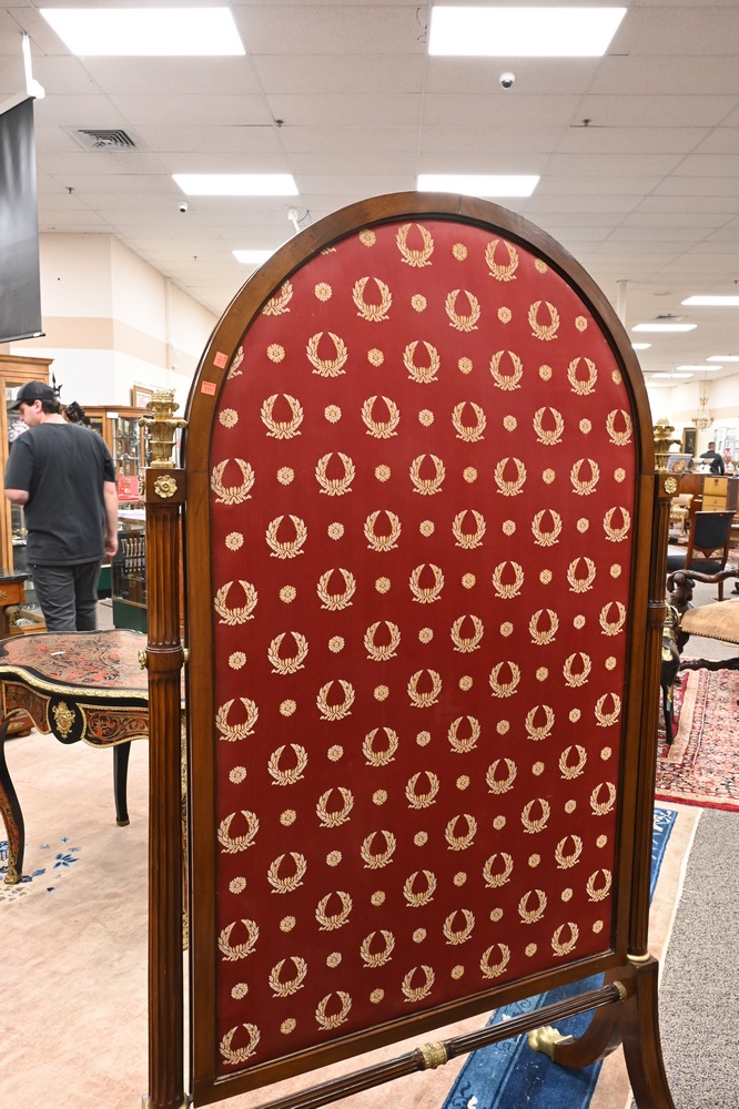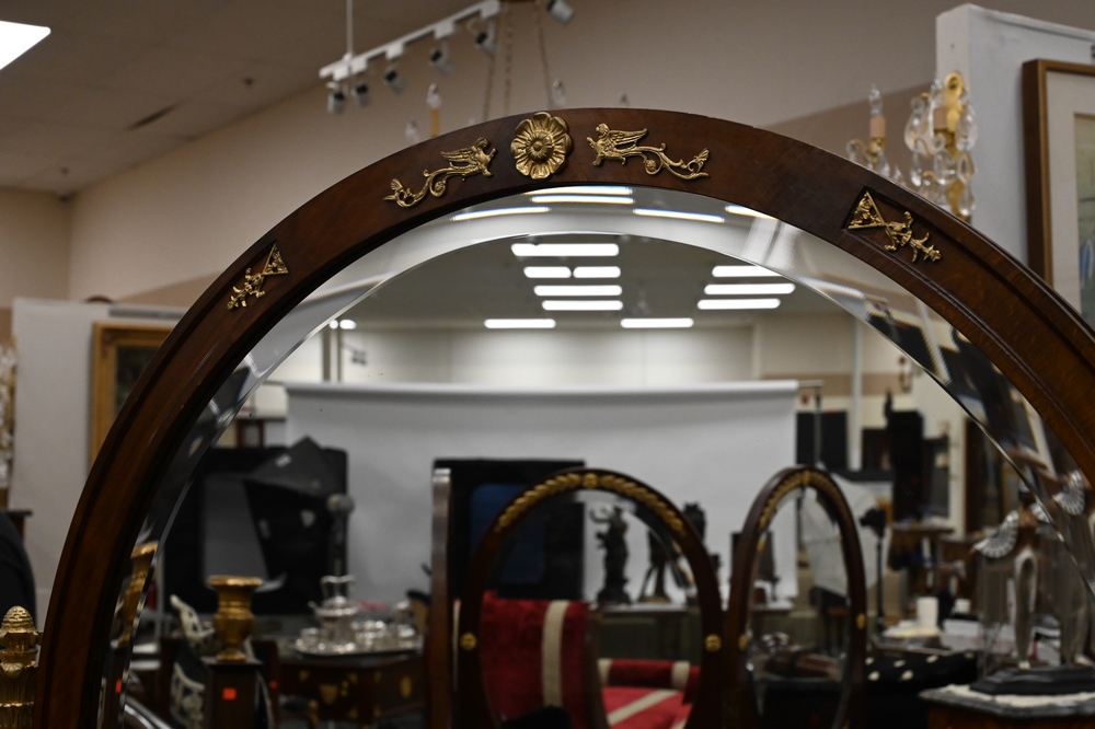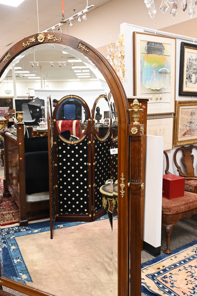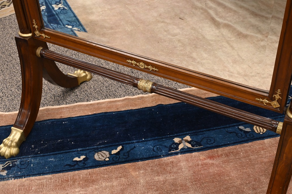 Lot 484: French Empire Style Mahogany Cheval Mirror, having pediment and bronze two-sided female faces, all set on square posts ending in gol…