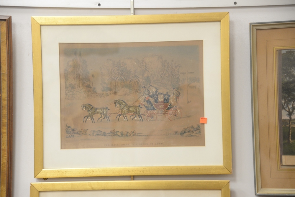 Lot 484: Group of Five Framed Prints, to include “Hold Hard! You have Forgot the Lady” by J. Watson; “A View of Foots” by W. Woollett; “The Mail Couch in a Drift of Snow” by James Pollard; “The Sleepy Gate Keeper” by C.B. Newhouse along with “The Mail Coach in a Storm of Snow” by James Pollard, largest 11″ x 16″.