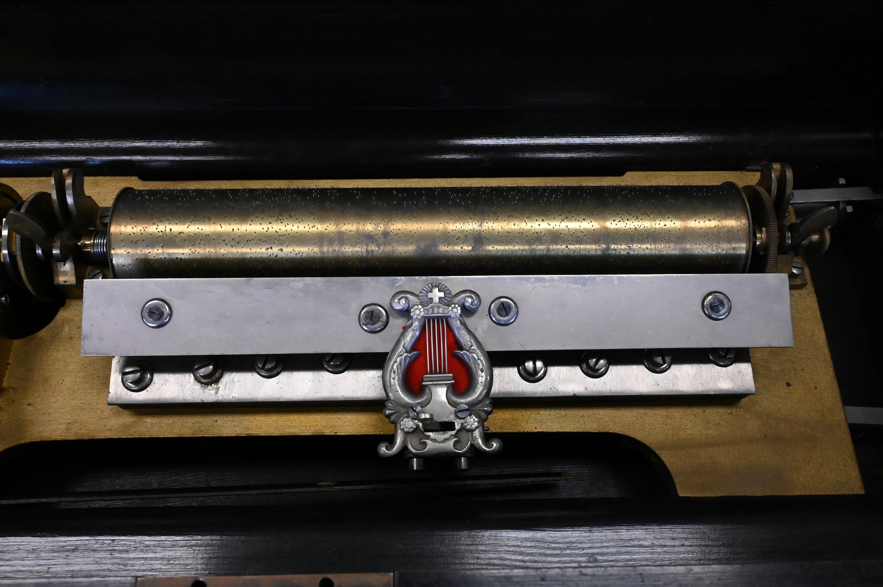 having fine inlay, ebonized borders and gilt handles, along with extra cylinder in ebonized box