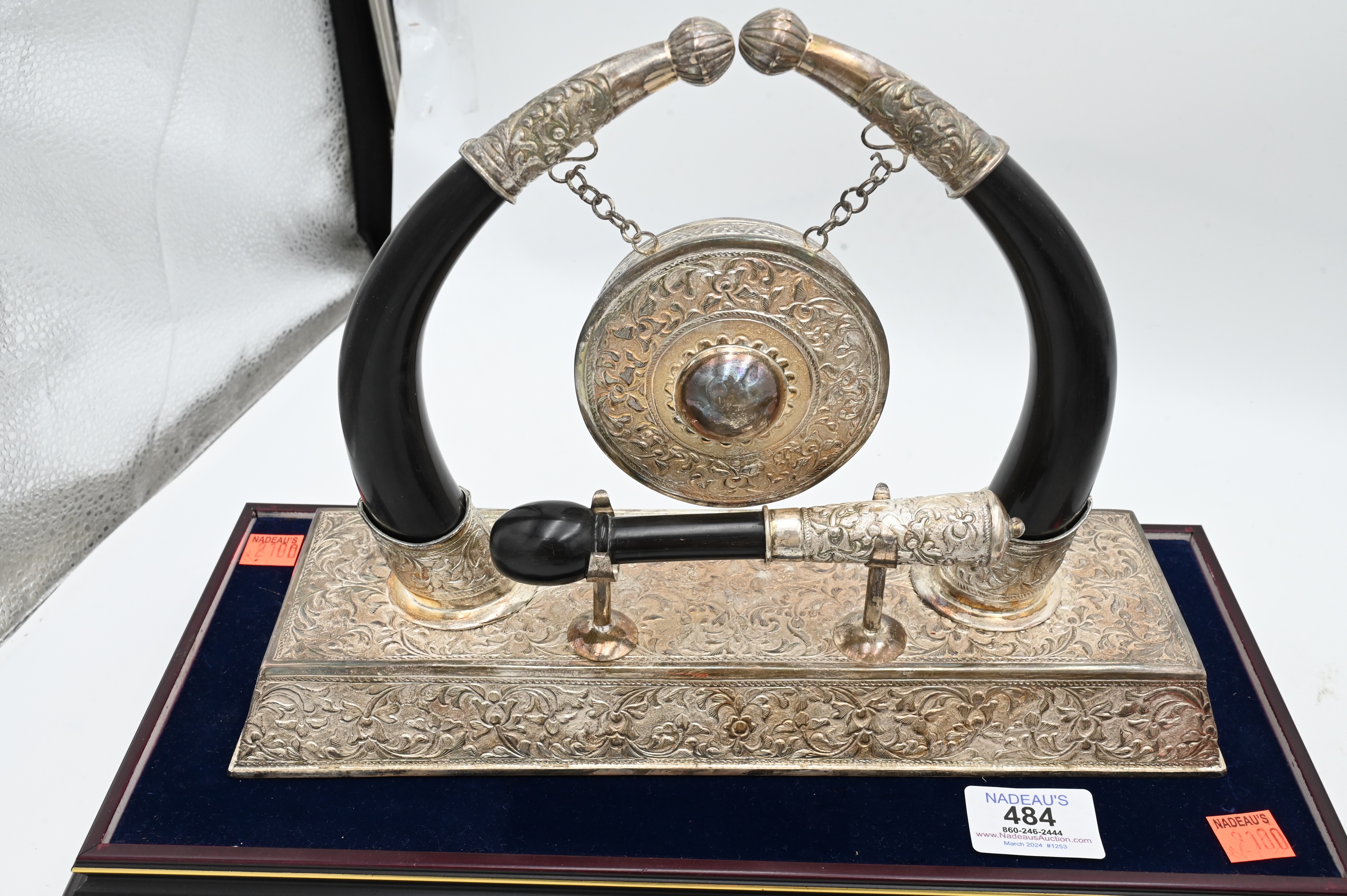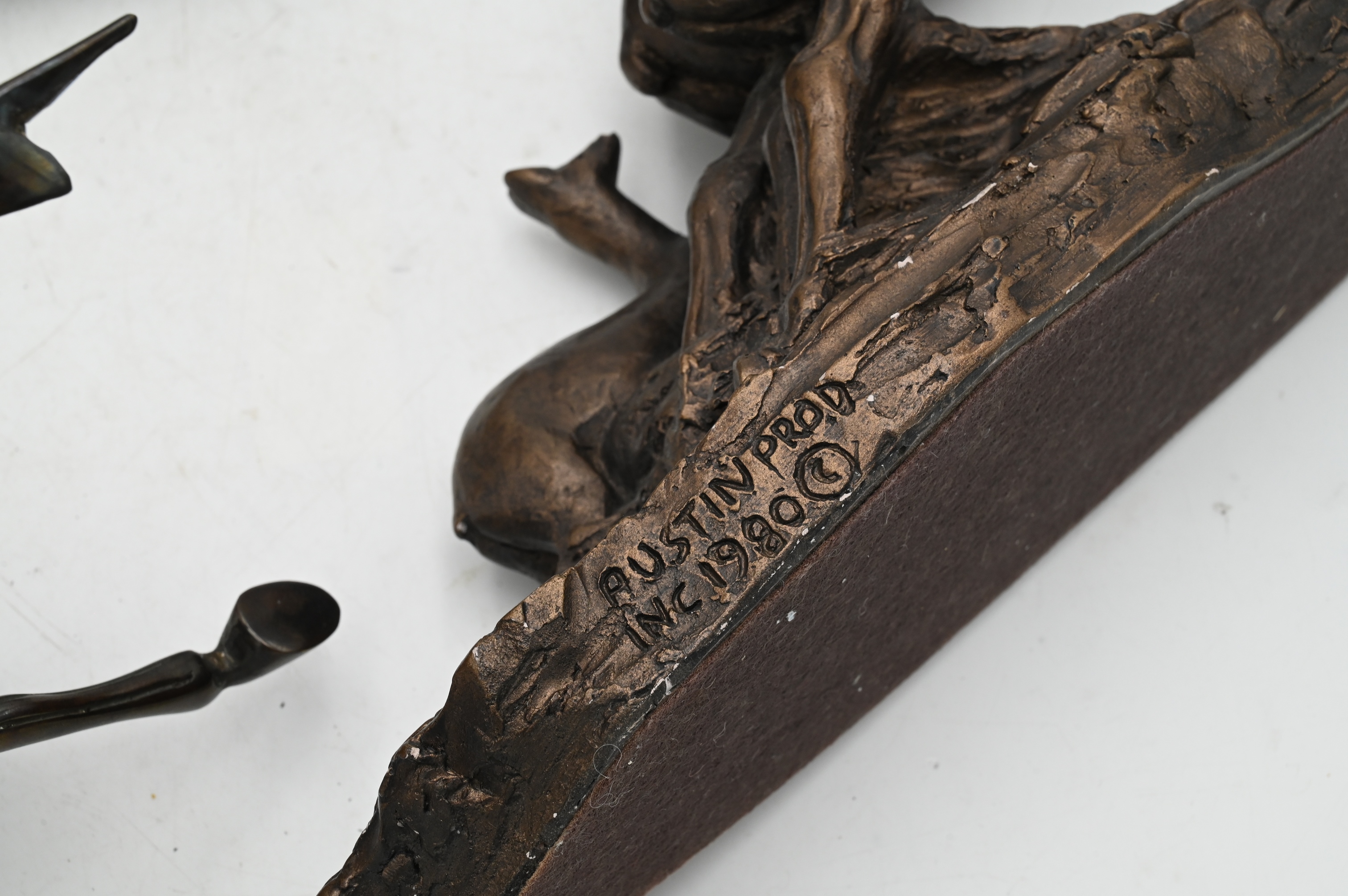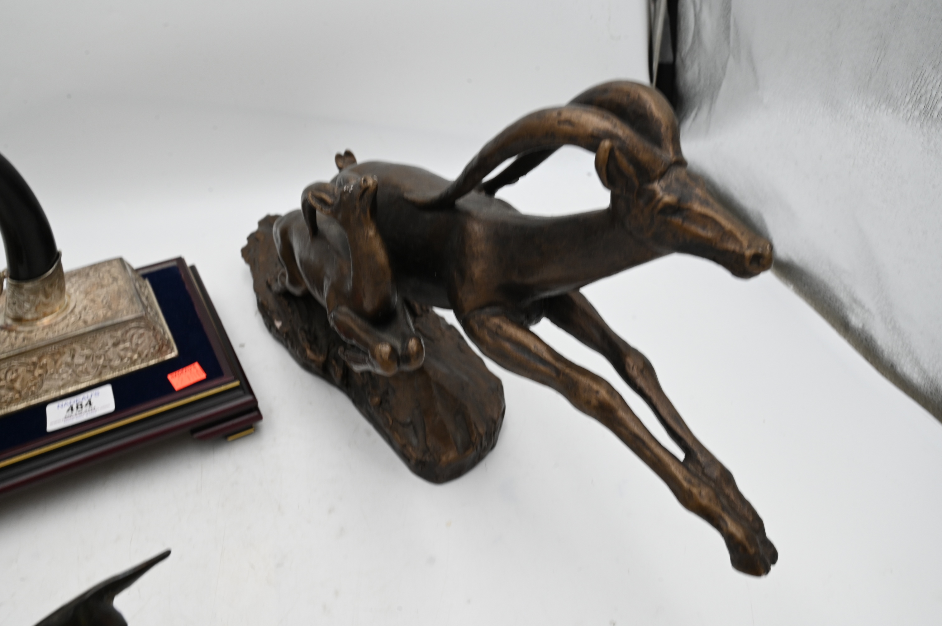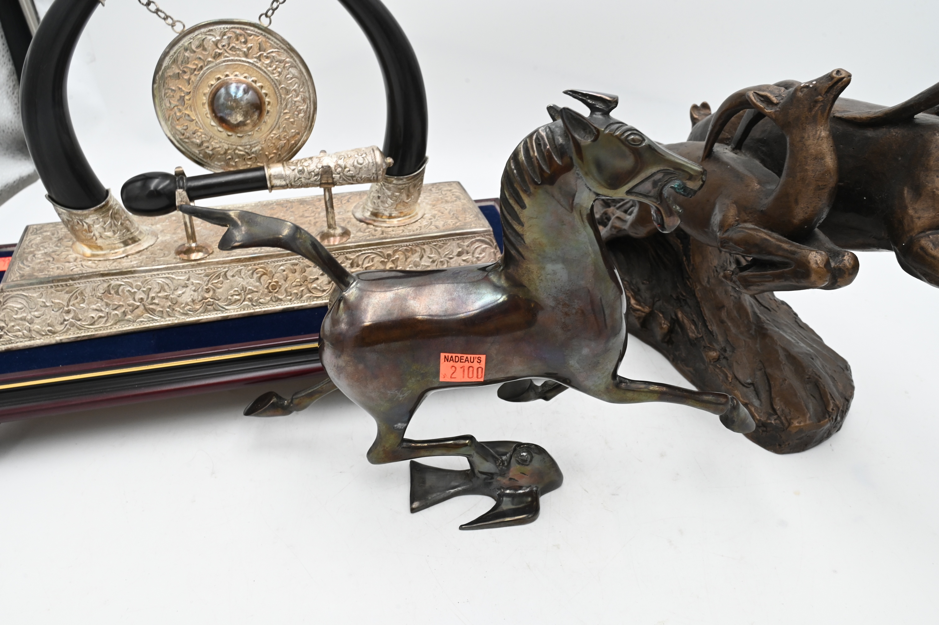to include three metal sculptures of gazelles by Austin Prod. INC 1980, a contemporary bronze sculpture of a running horse crushing a bird, along with a silver plate and lacquered table gong having black horns covered in silvered caps and mounted on an ornate silvered pedestal of floral design