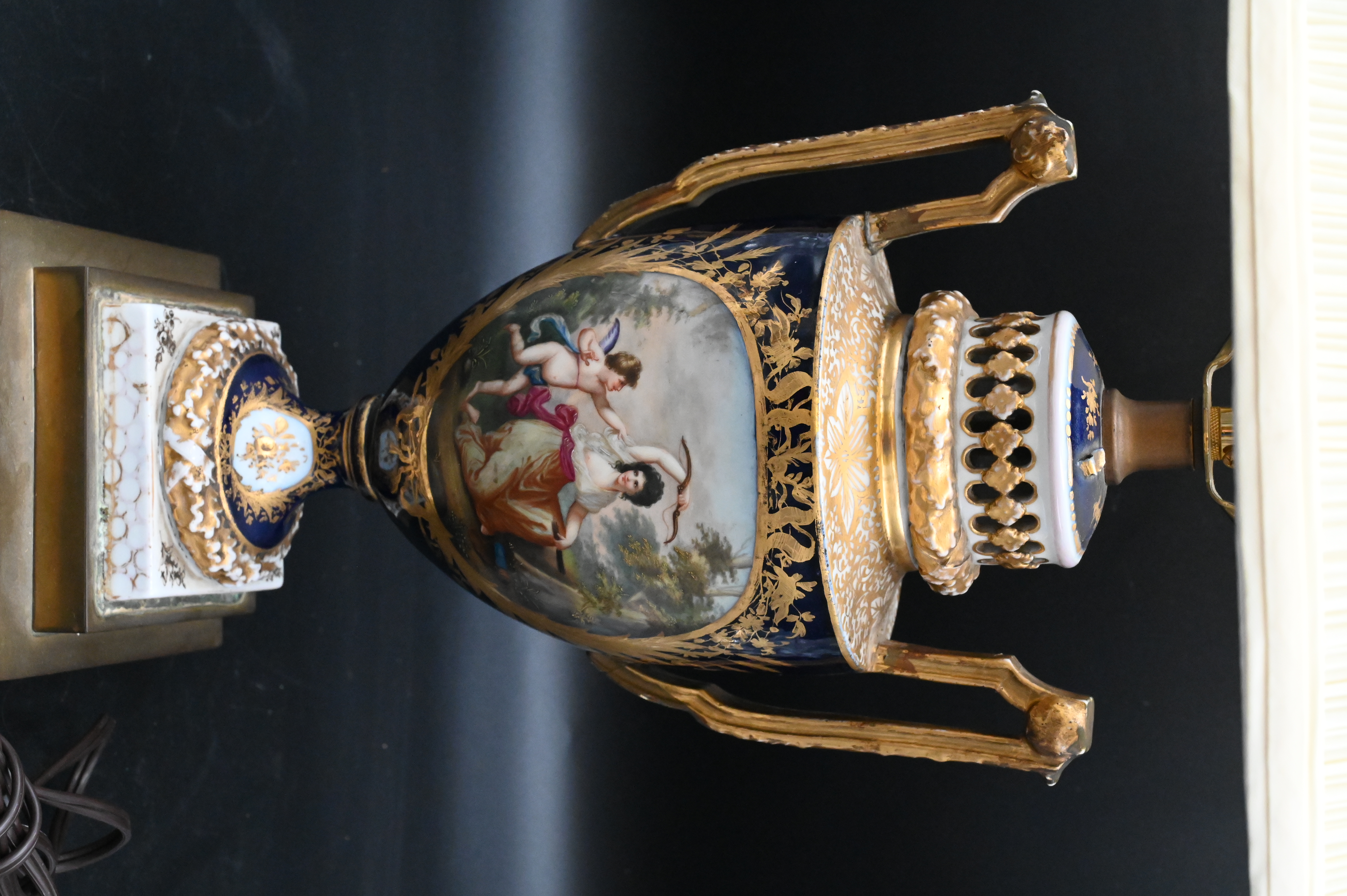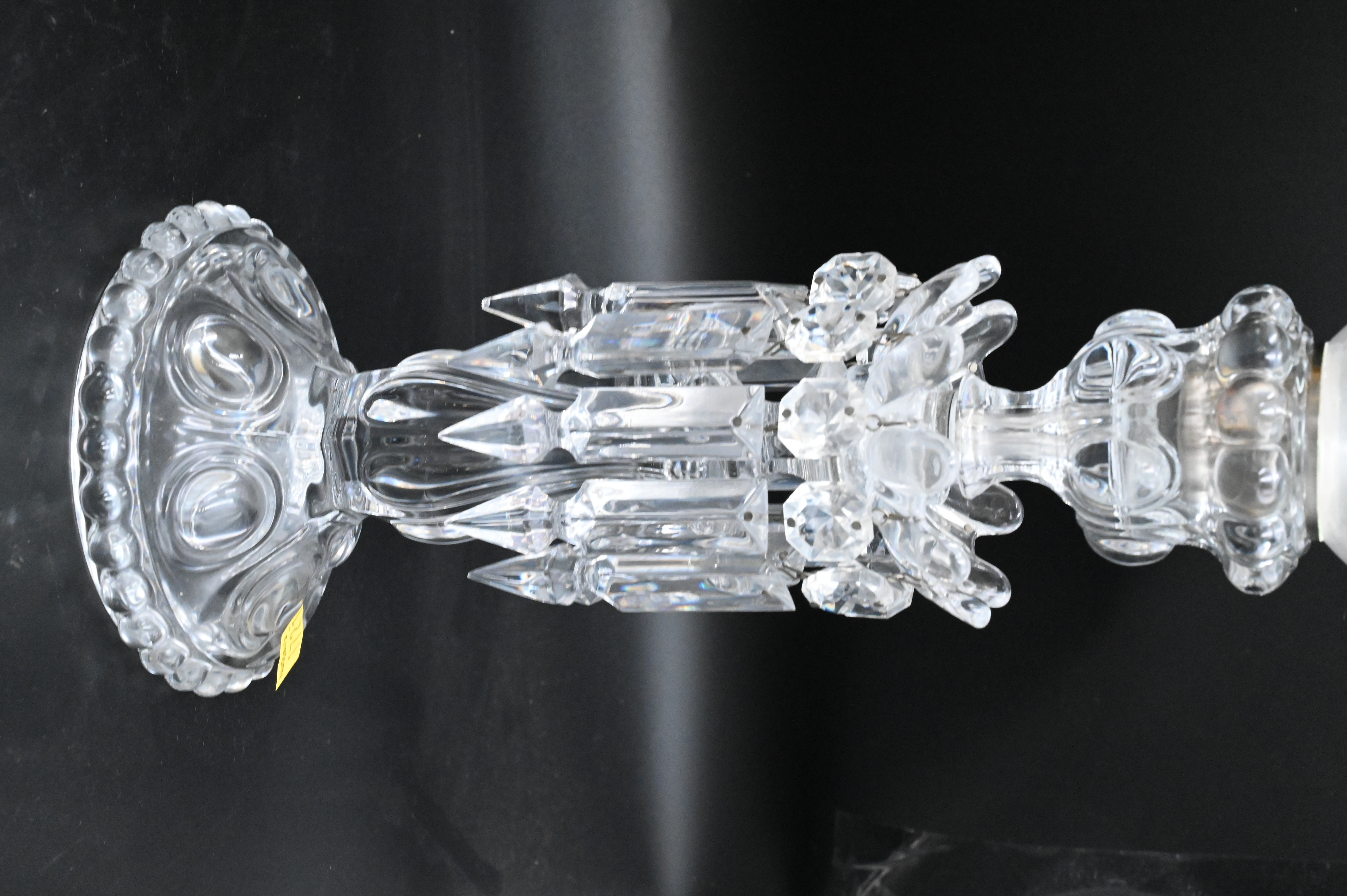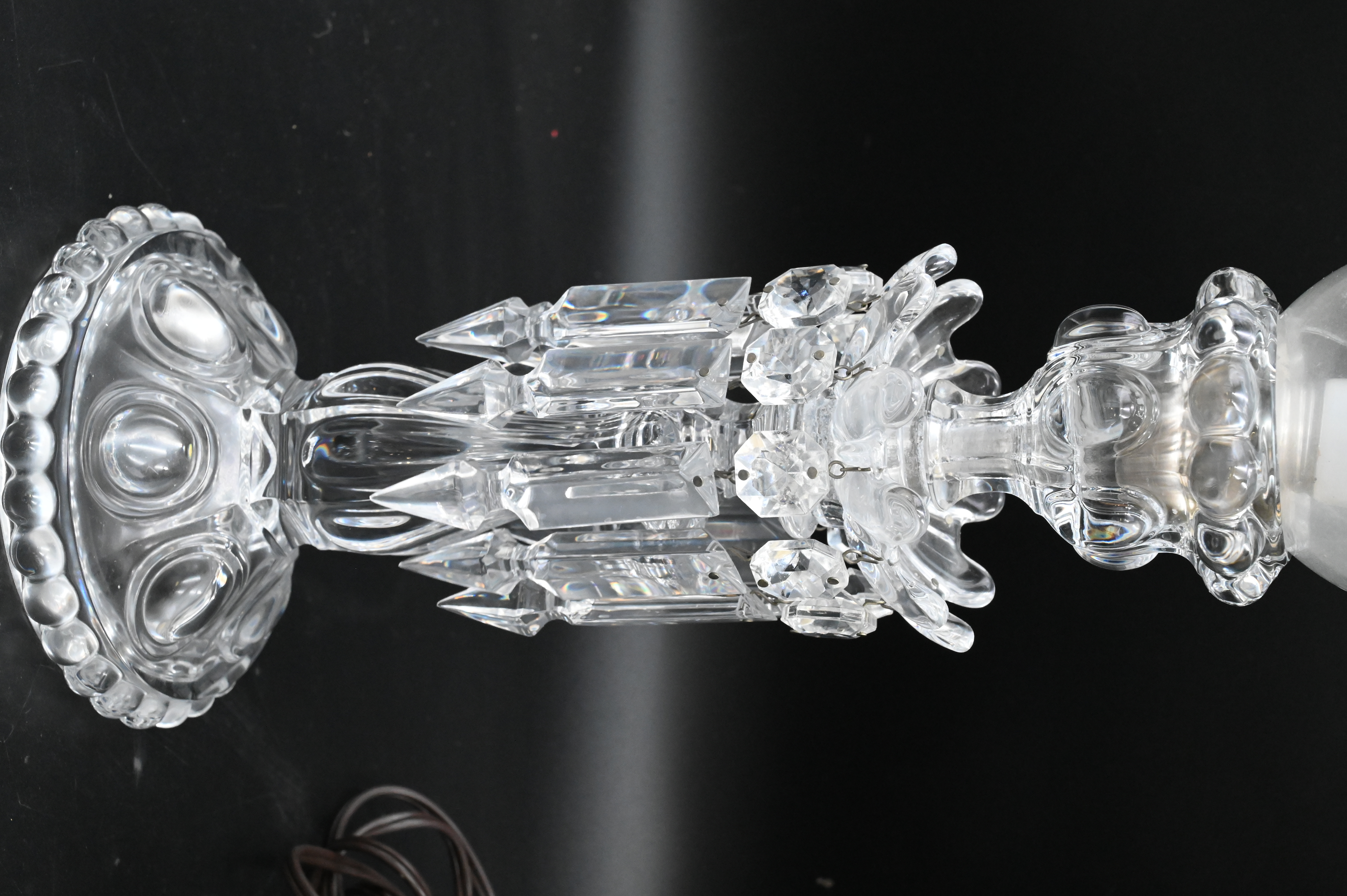 Three Table Lamps, to include a Sevres style porcelain double handled urn mounted as a lamp (as is), along with a pair of glass Baccarat style lusters, tallest height 21 1/2 inches.