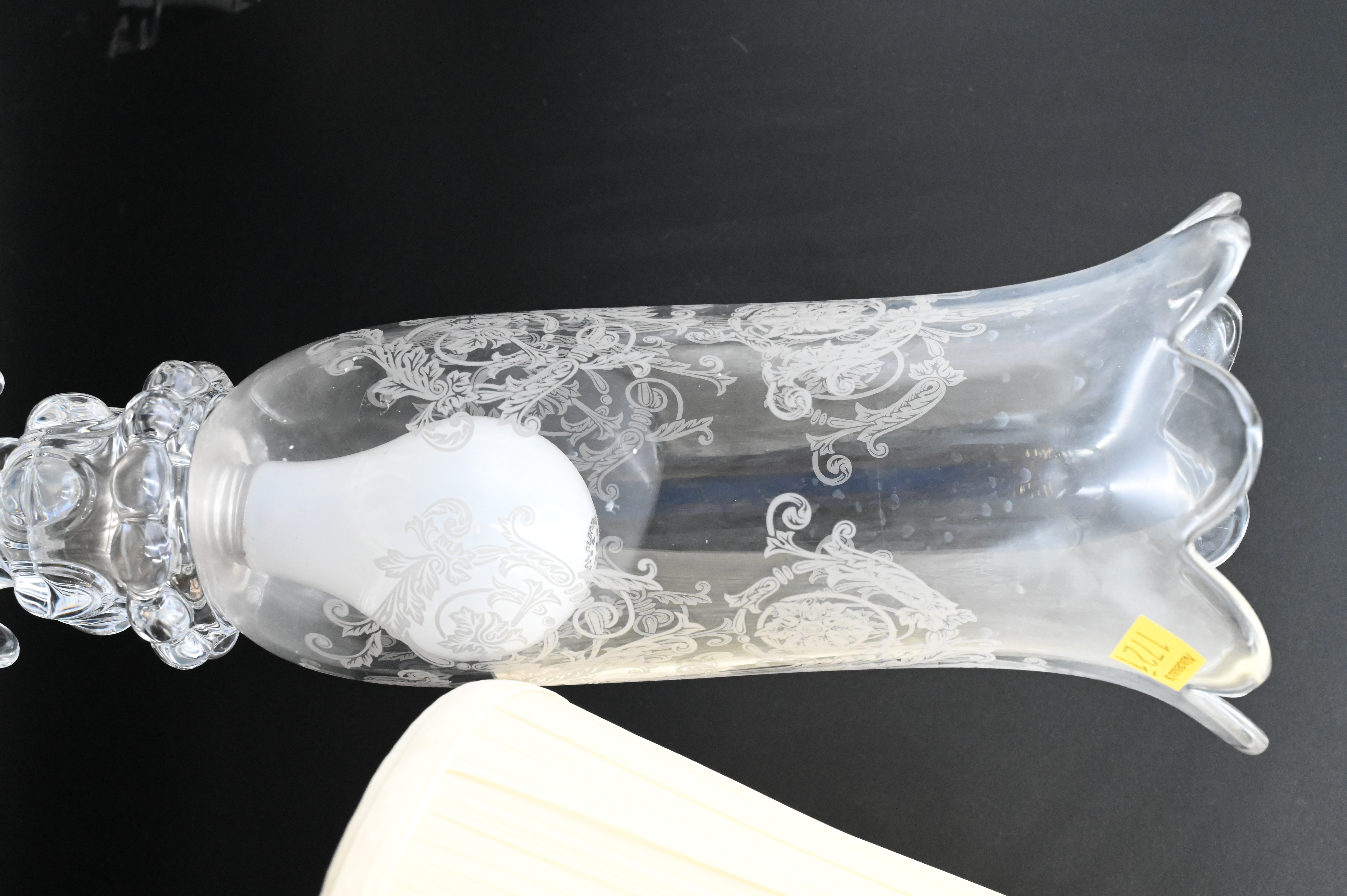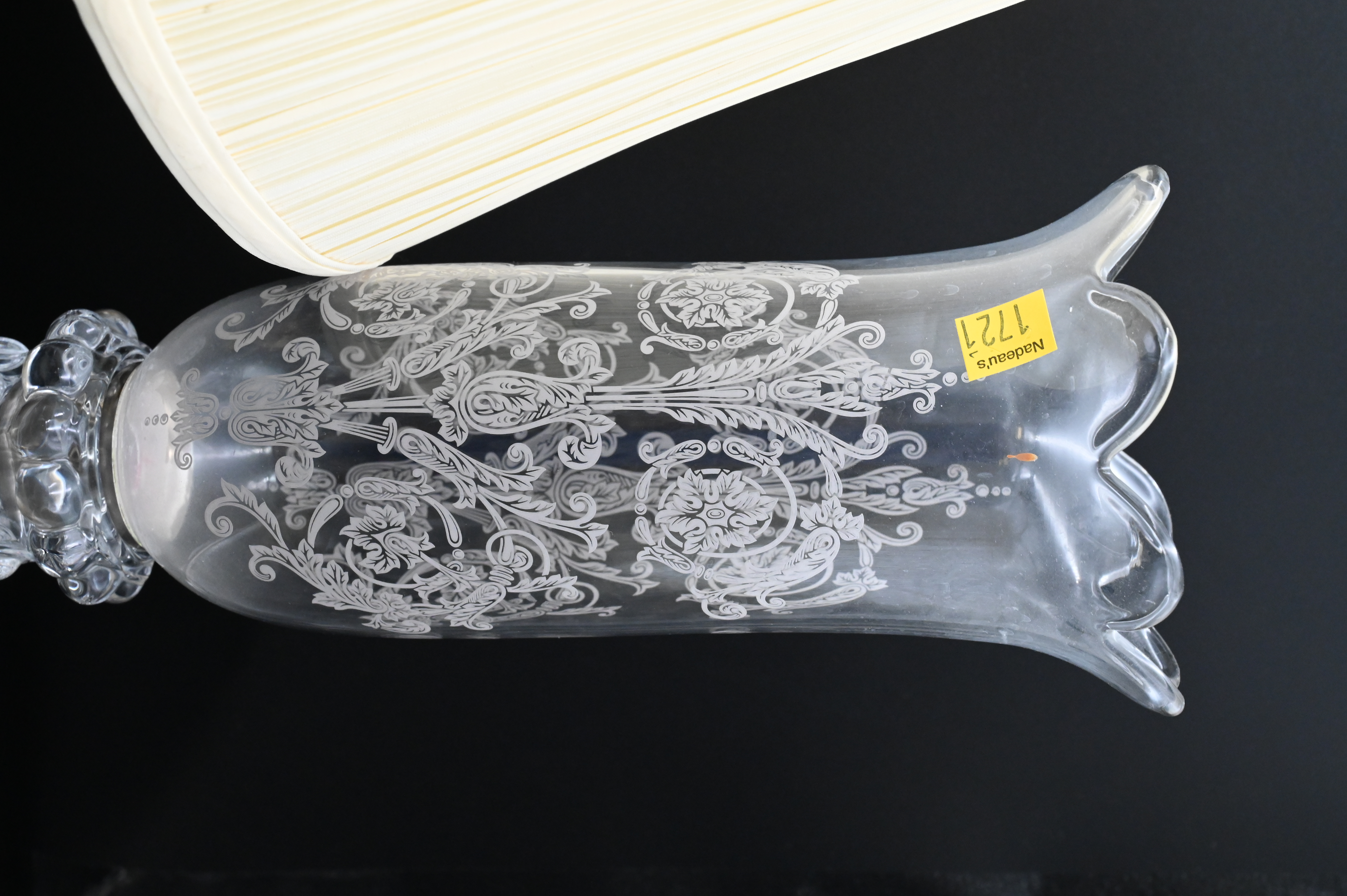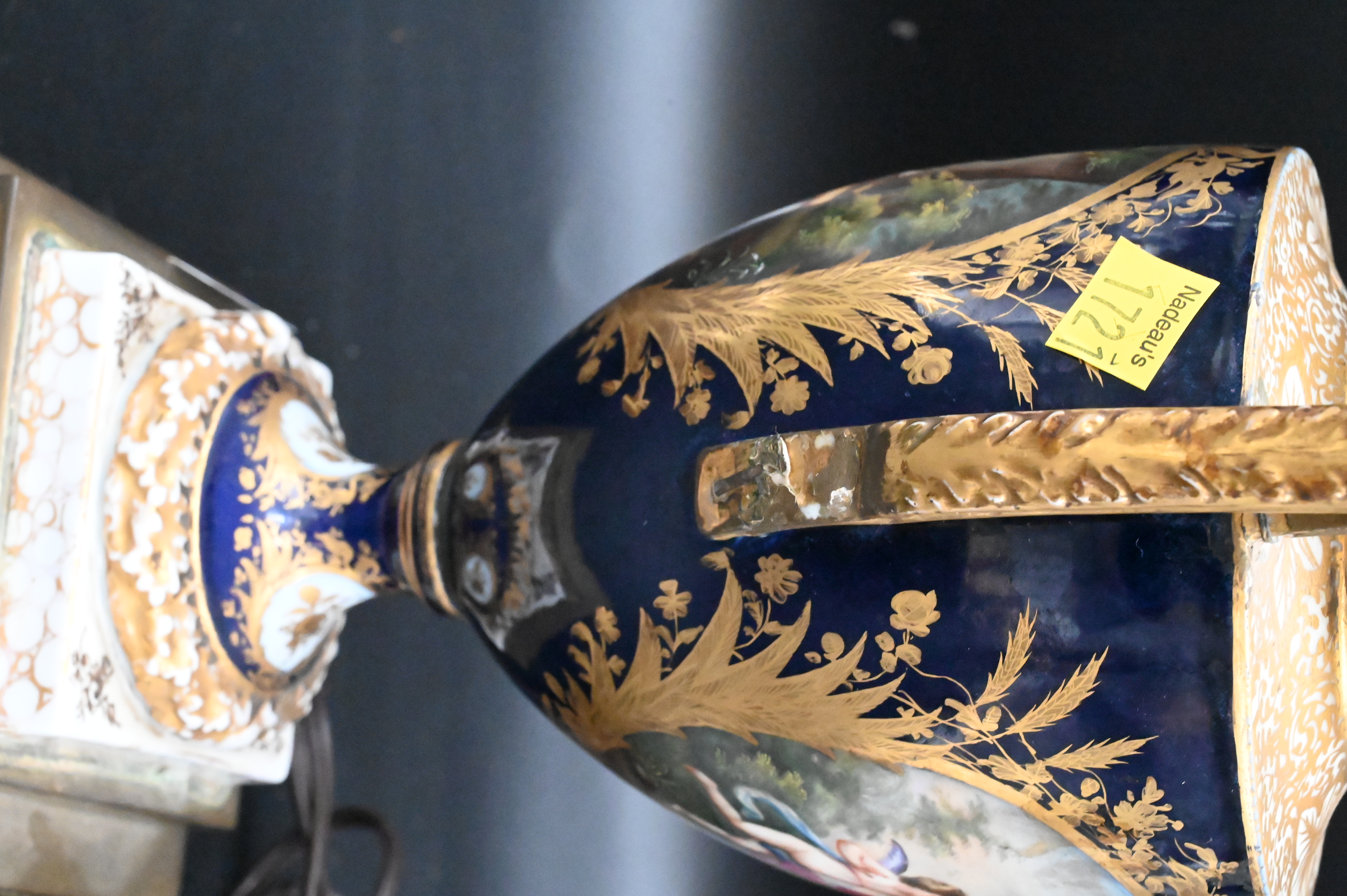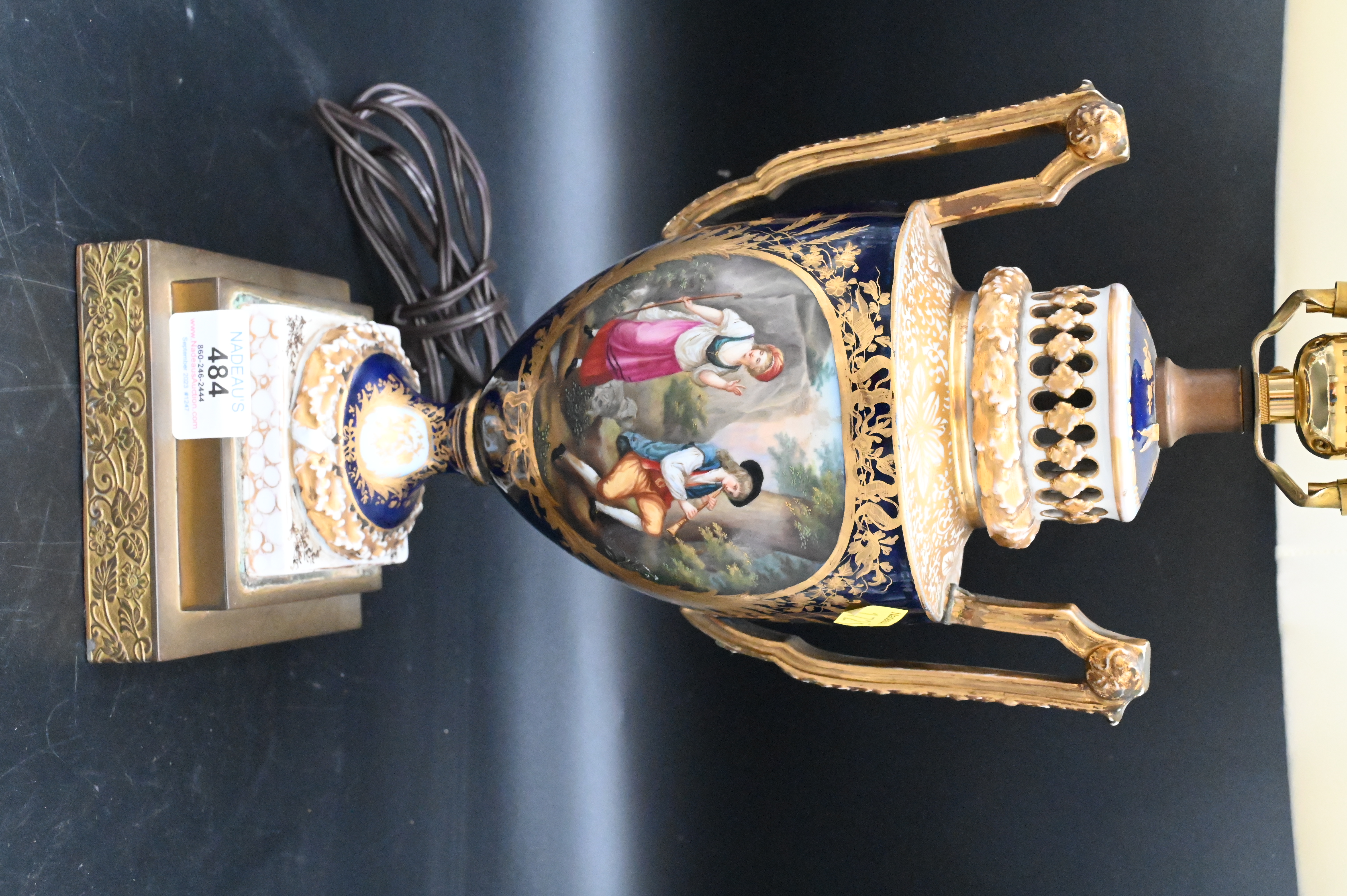 Three Table Lamps, to include a Sevres style porcelain double handled urn mounted as a lamp (as is), along with a pair of glass Baccarat style lusters, tallest height 21 1/2 inches.