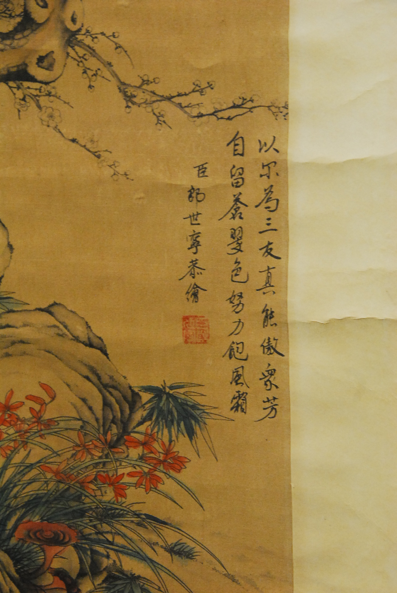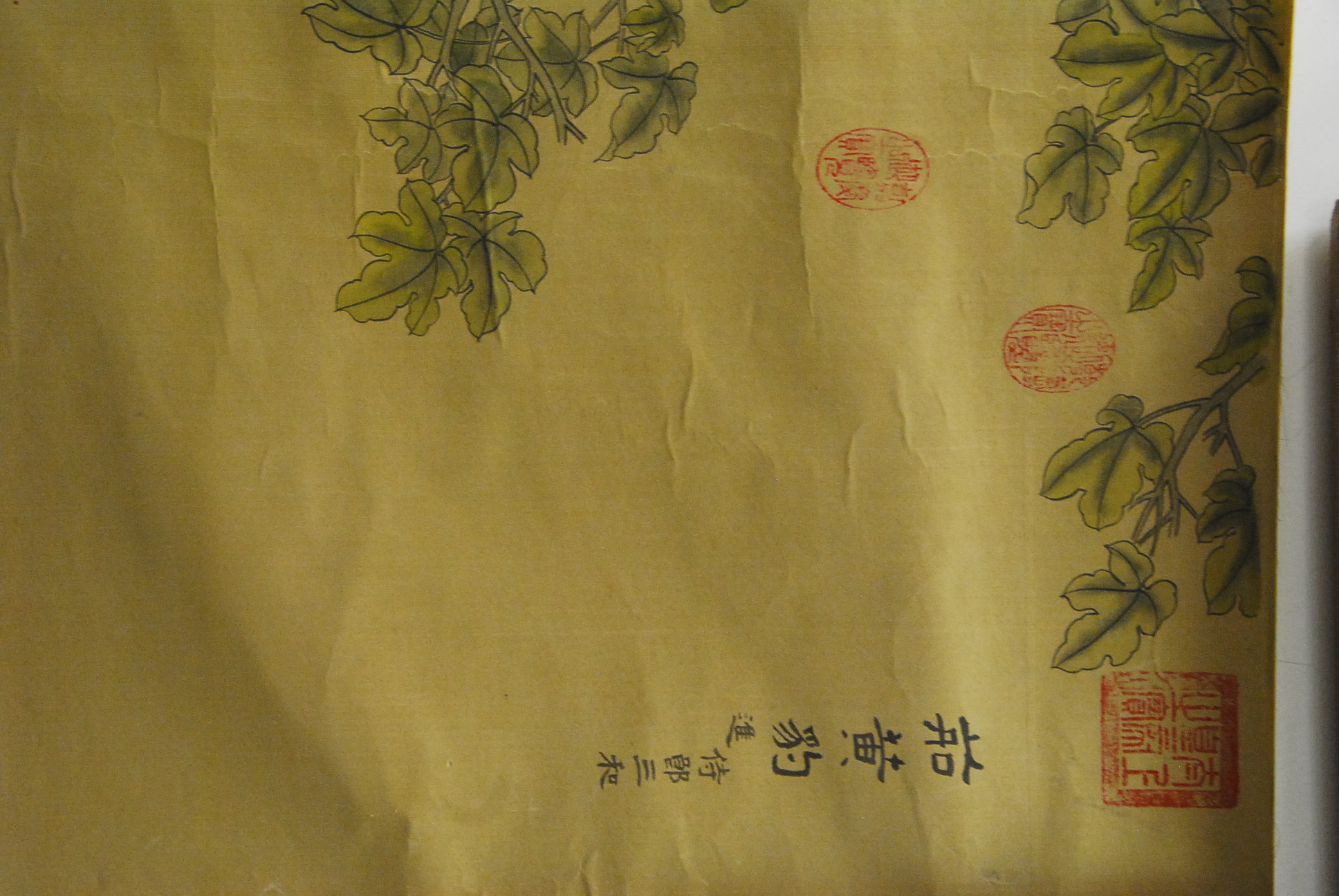 Two oriental silk scrolls one having painting of a dog playing by a tree with birds and the other landscape with a stream.