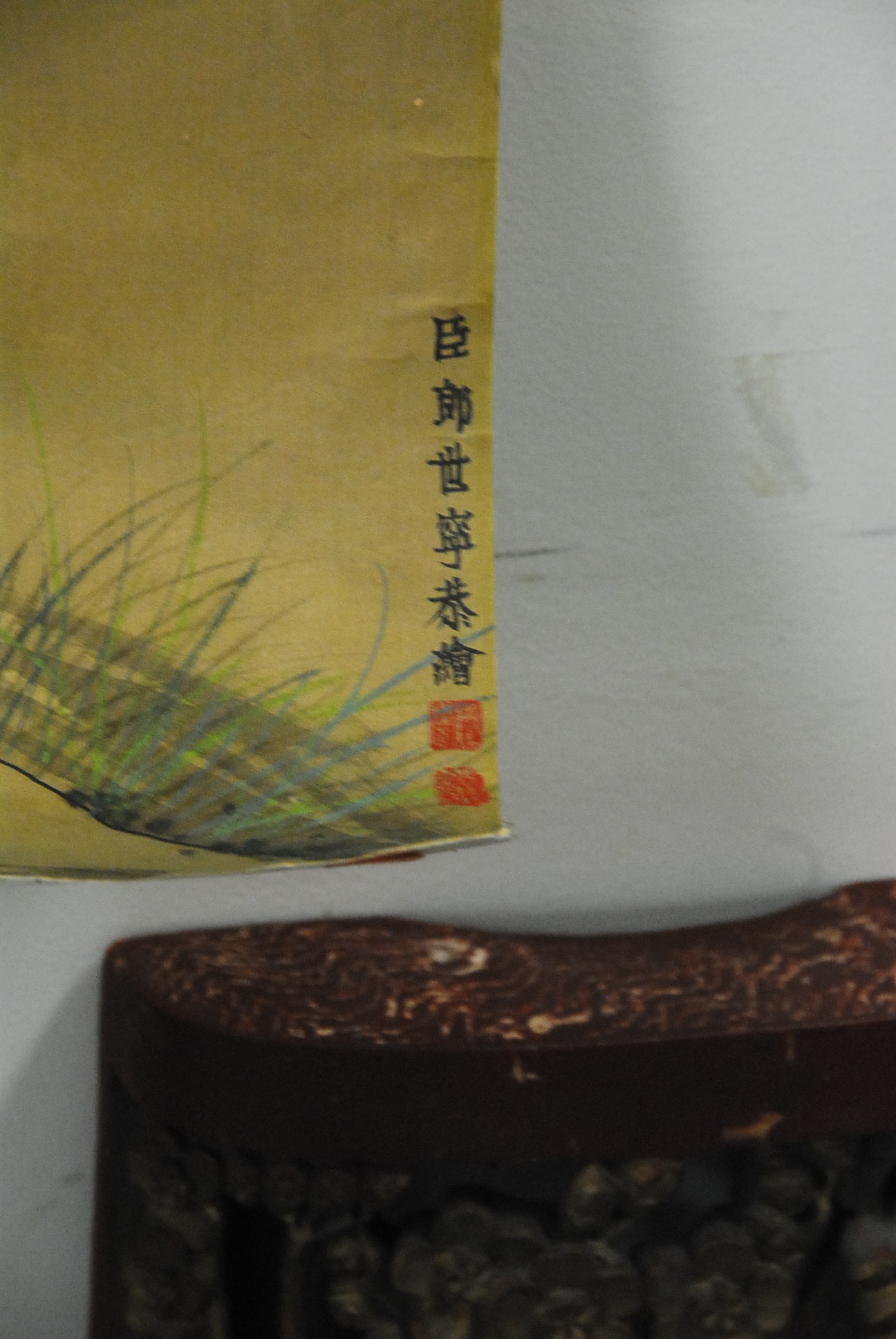 Lot 484: Two oriental silk scrolls one having painting of a dog playing by a tree with birds and the other landscape with a stream.