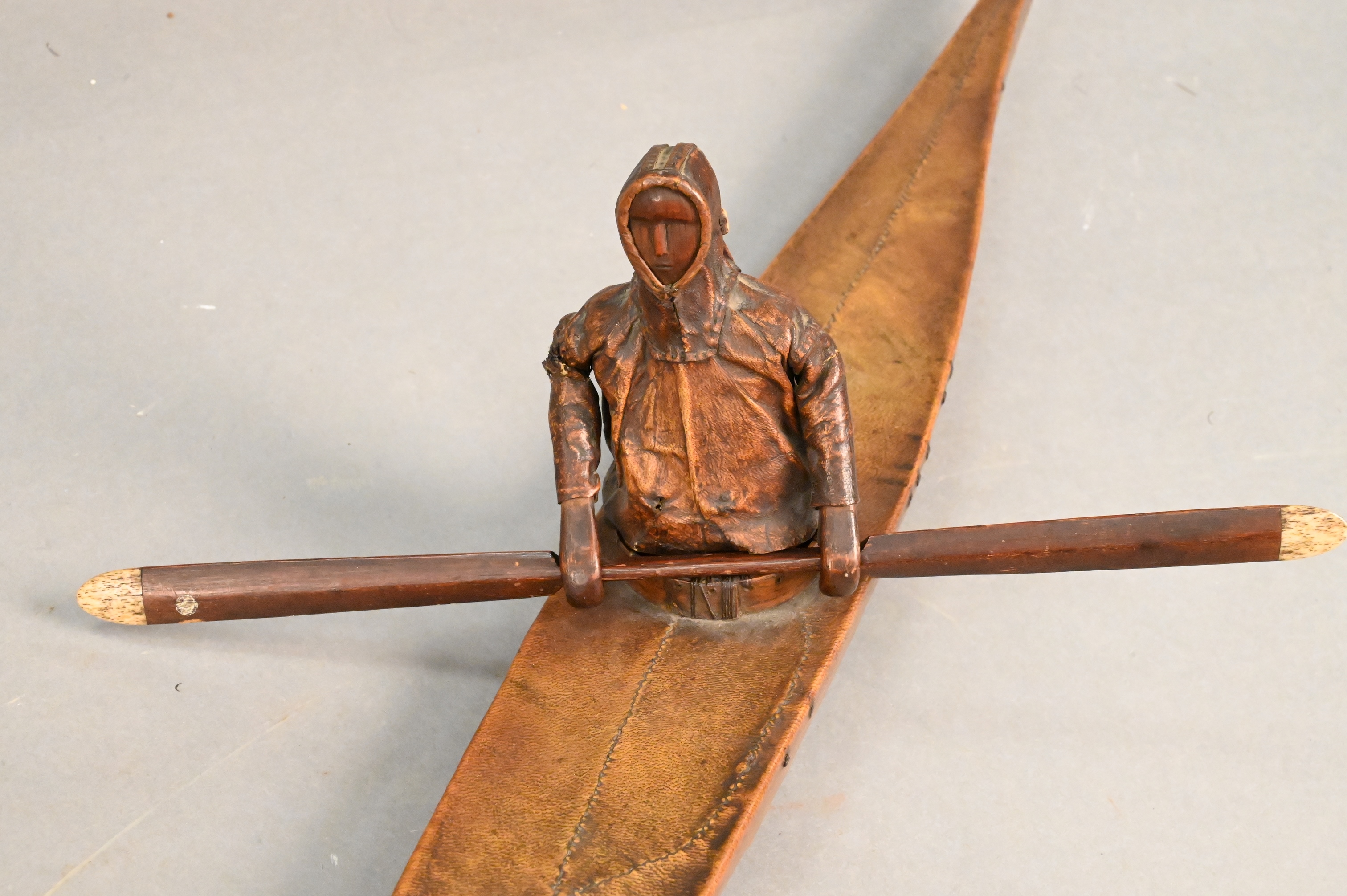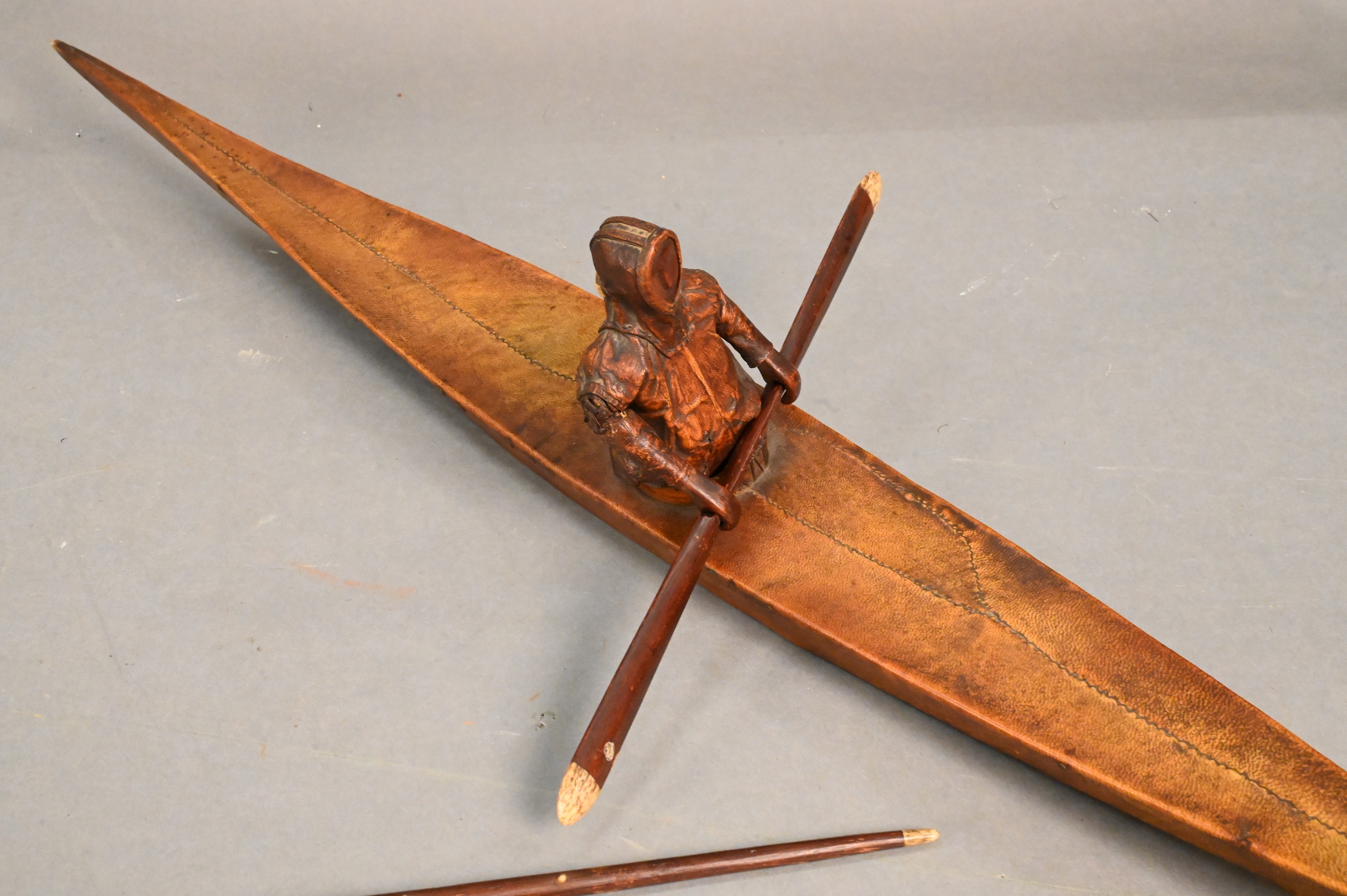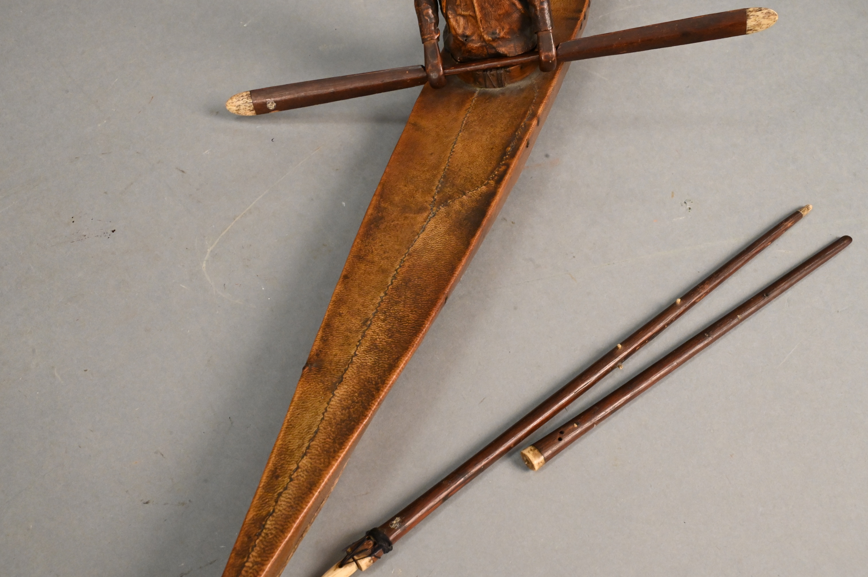 featuring a carved and painted Inuit/Yupik man in leather parka sitting in a wooden and seal leather kayak with fine bone inlay, he holds a spear, along with a double paddle and additional long stick, Pacific Northwest, circa 1860