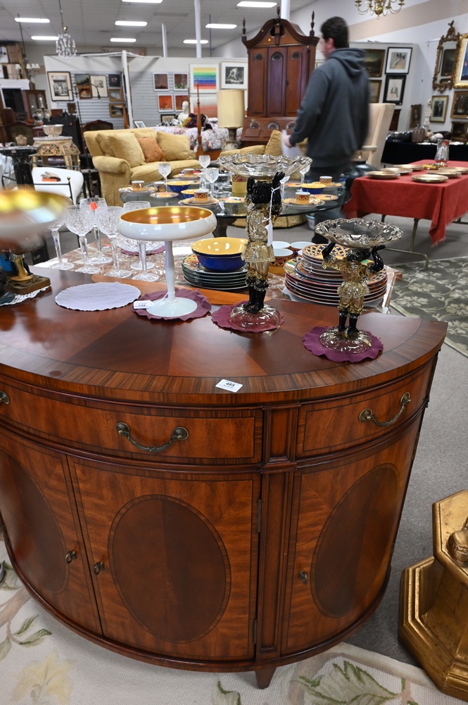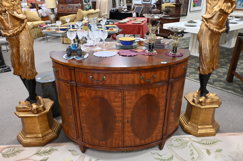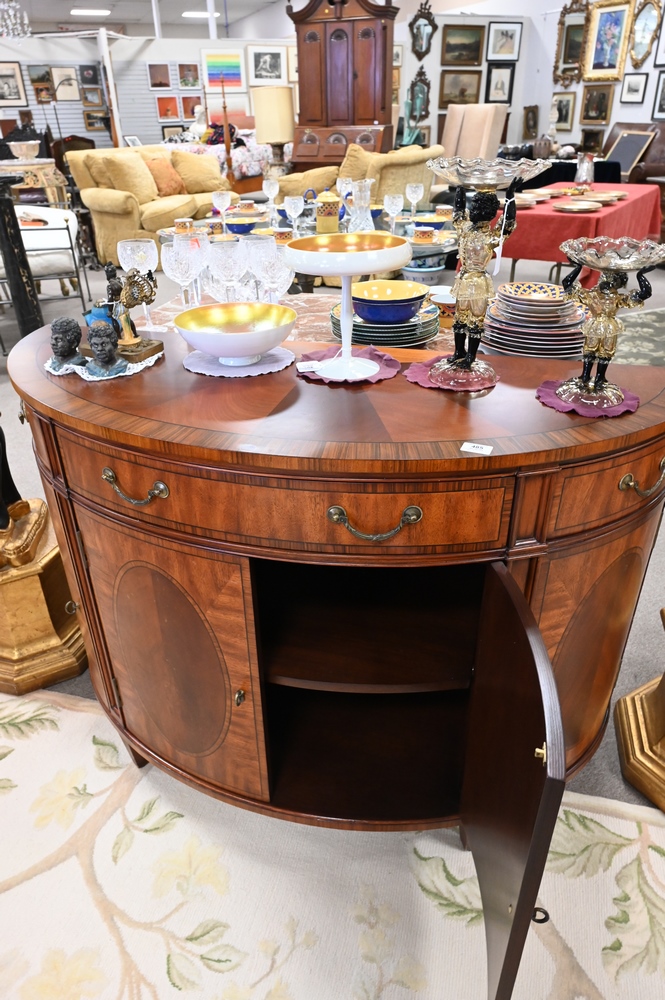 Lot 485: Ethan Allen Demilune Server, having drawers, doors, and inlaid top, height 35 1/2 inches, top 19″ x 50″.