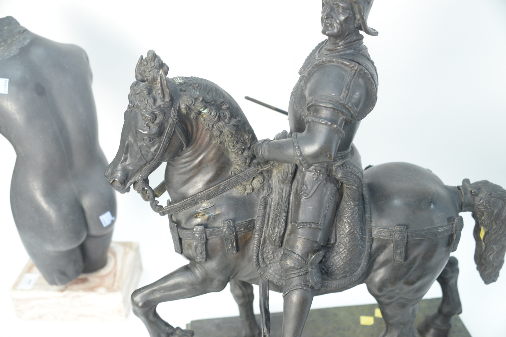 Lot 485: Large Bronze Roman Soldier on Horseback, brown patina on a green marble base, not marked,height 25 inches, width 18 1/4 inches, depth 10 1/2 inches.