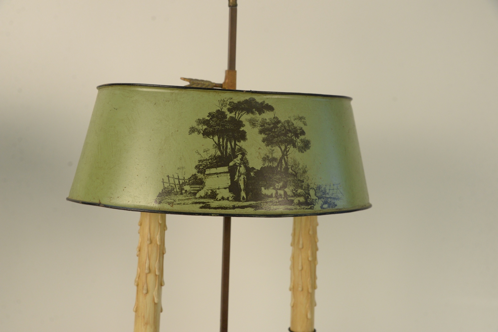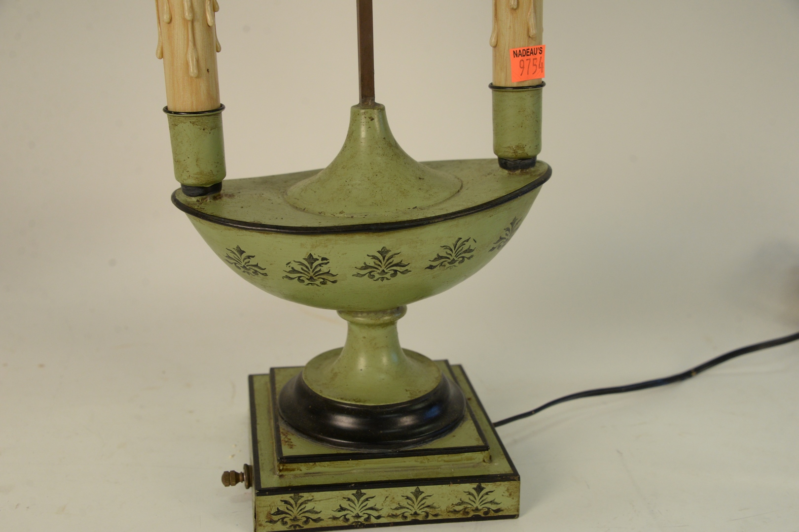 Lot 485: Louis XVI Style Green Painted Tole Bouillotte Lamp, having landscape scene on adjustable shade, along with stenciled details, over u…