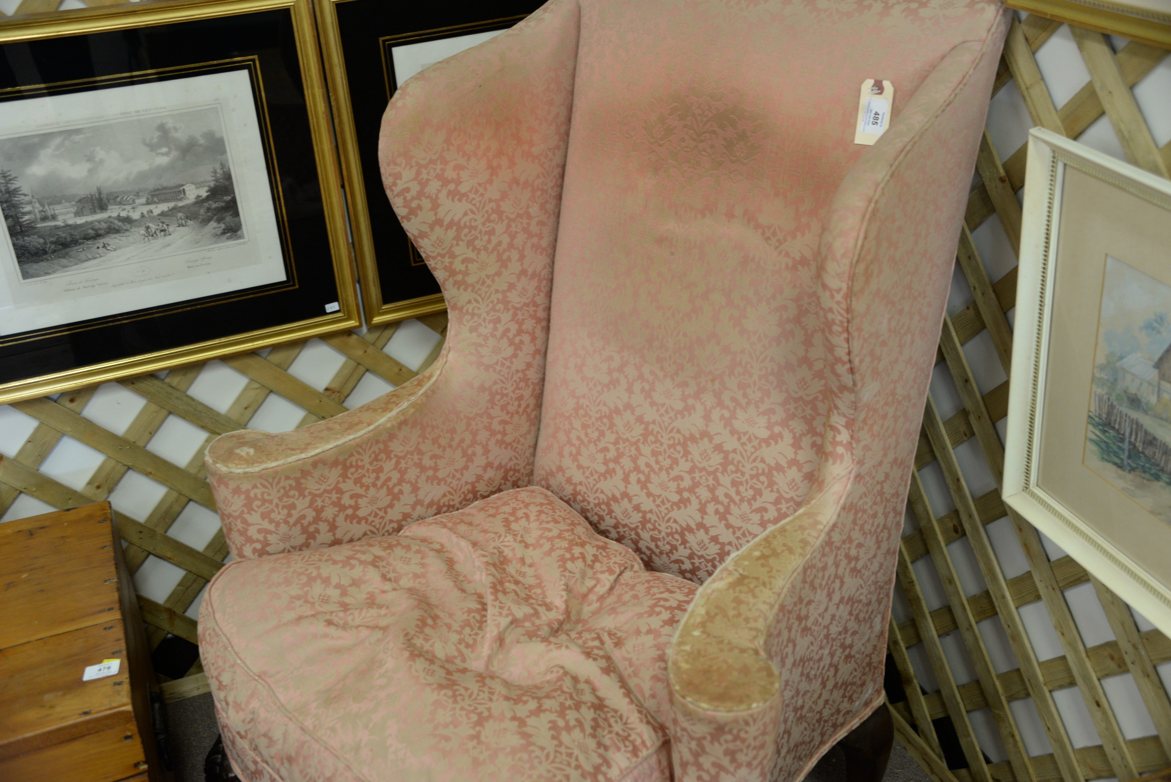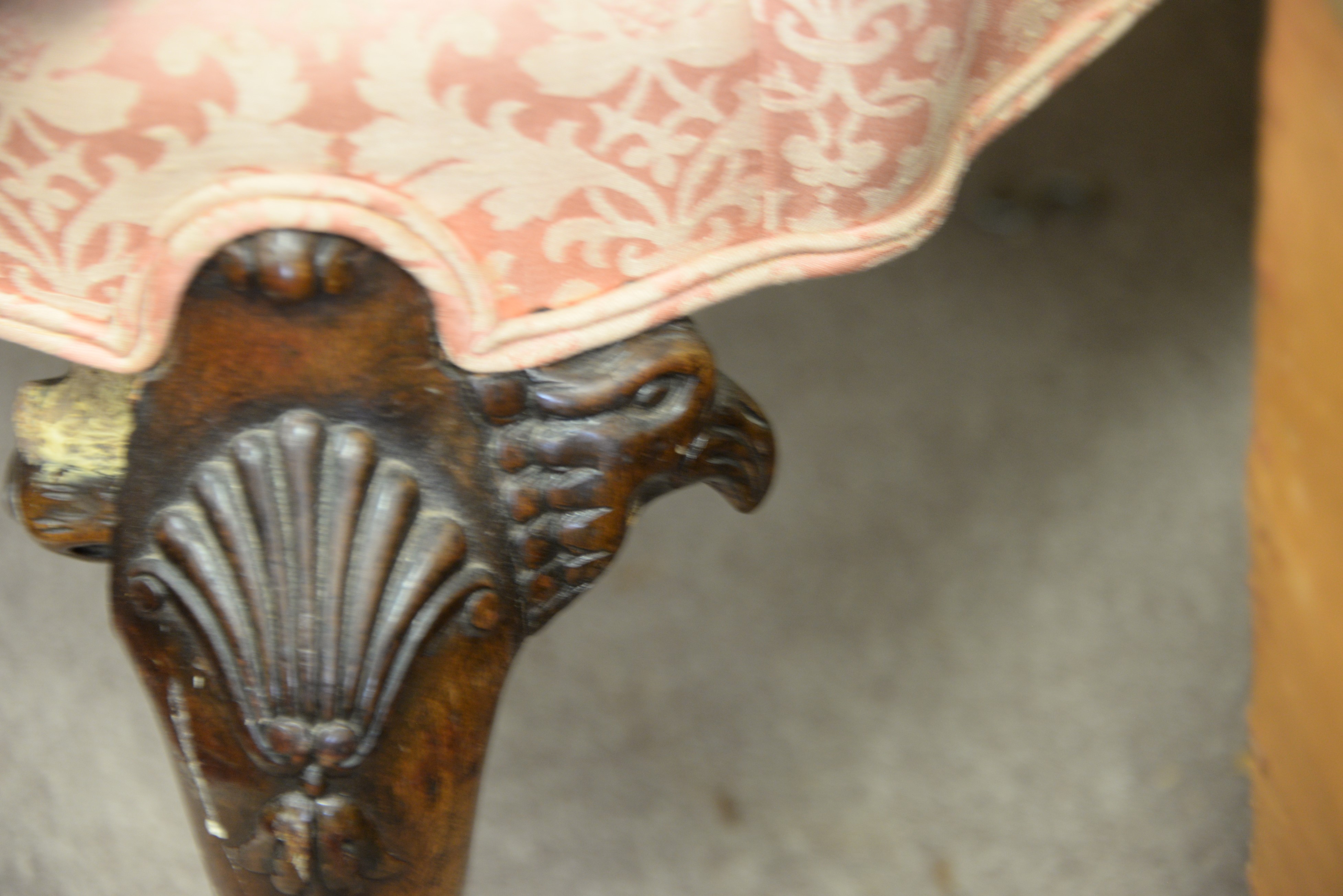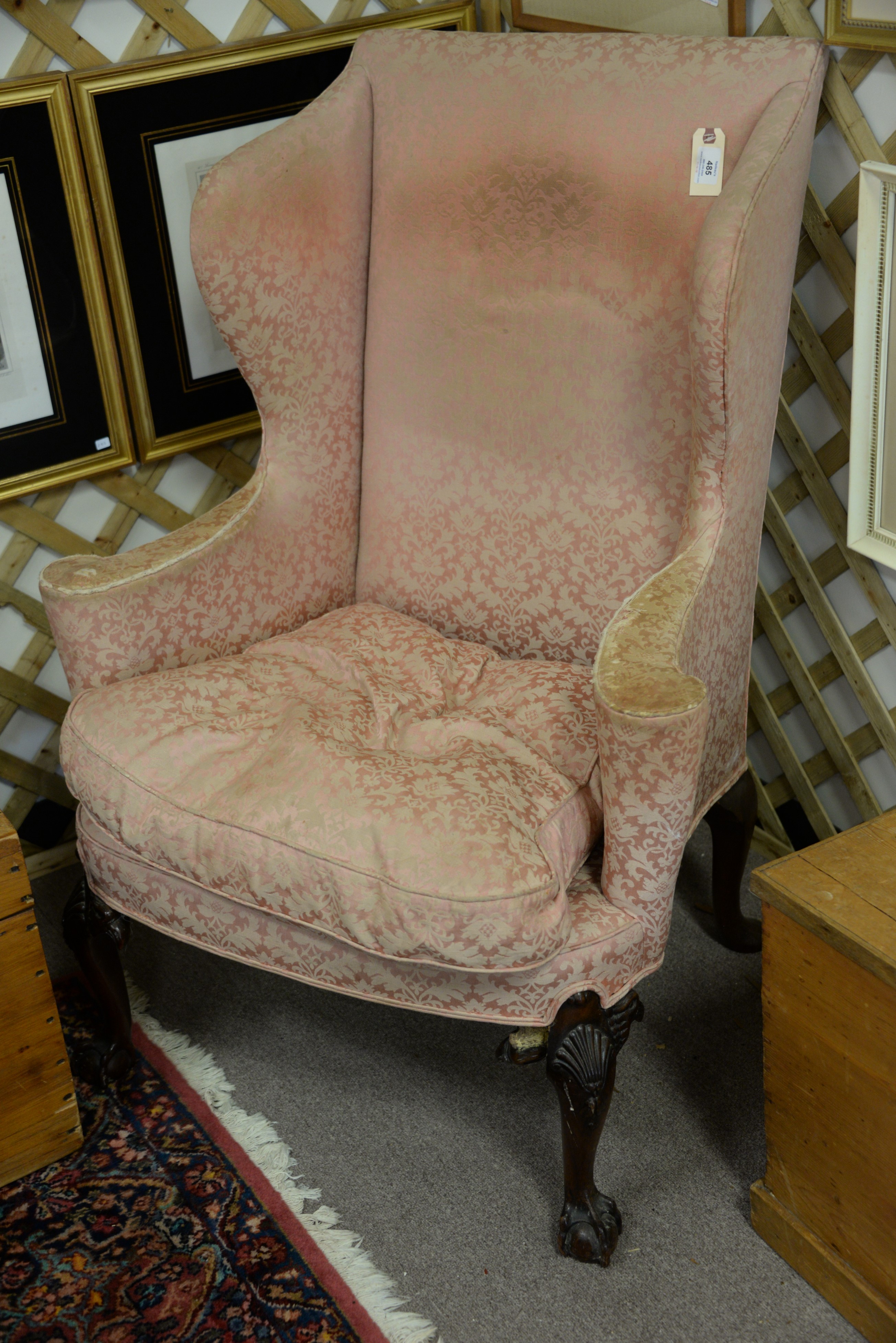 Lot 485: Mahogany Chippendale style upholstered wing chair with bird’s heads on legs and ball and claw feet, early 20th century.