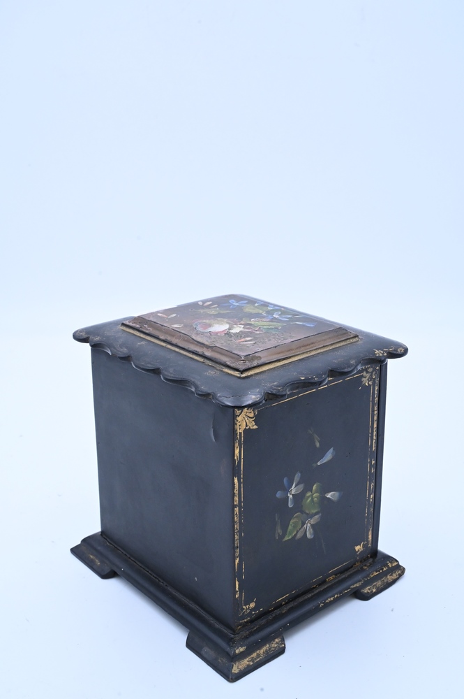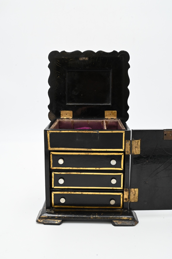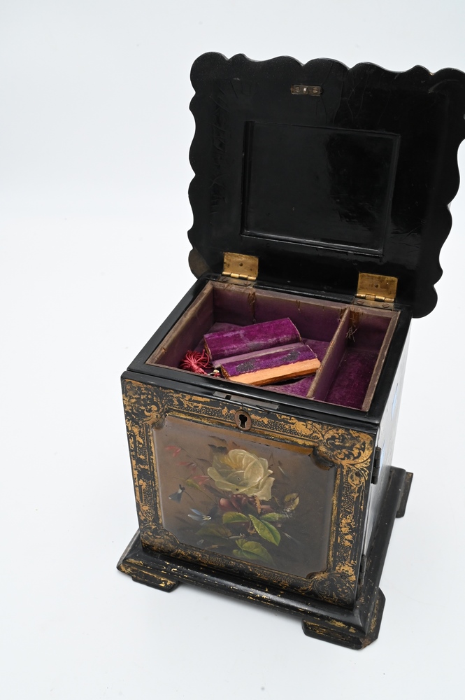 Lot 485: Papier Mache Vanity Box, having painted flowers, lift top opening, and silk fitted interior, door opening to three drawers, height 7 1/4 inches.