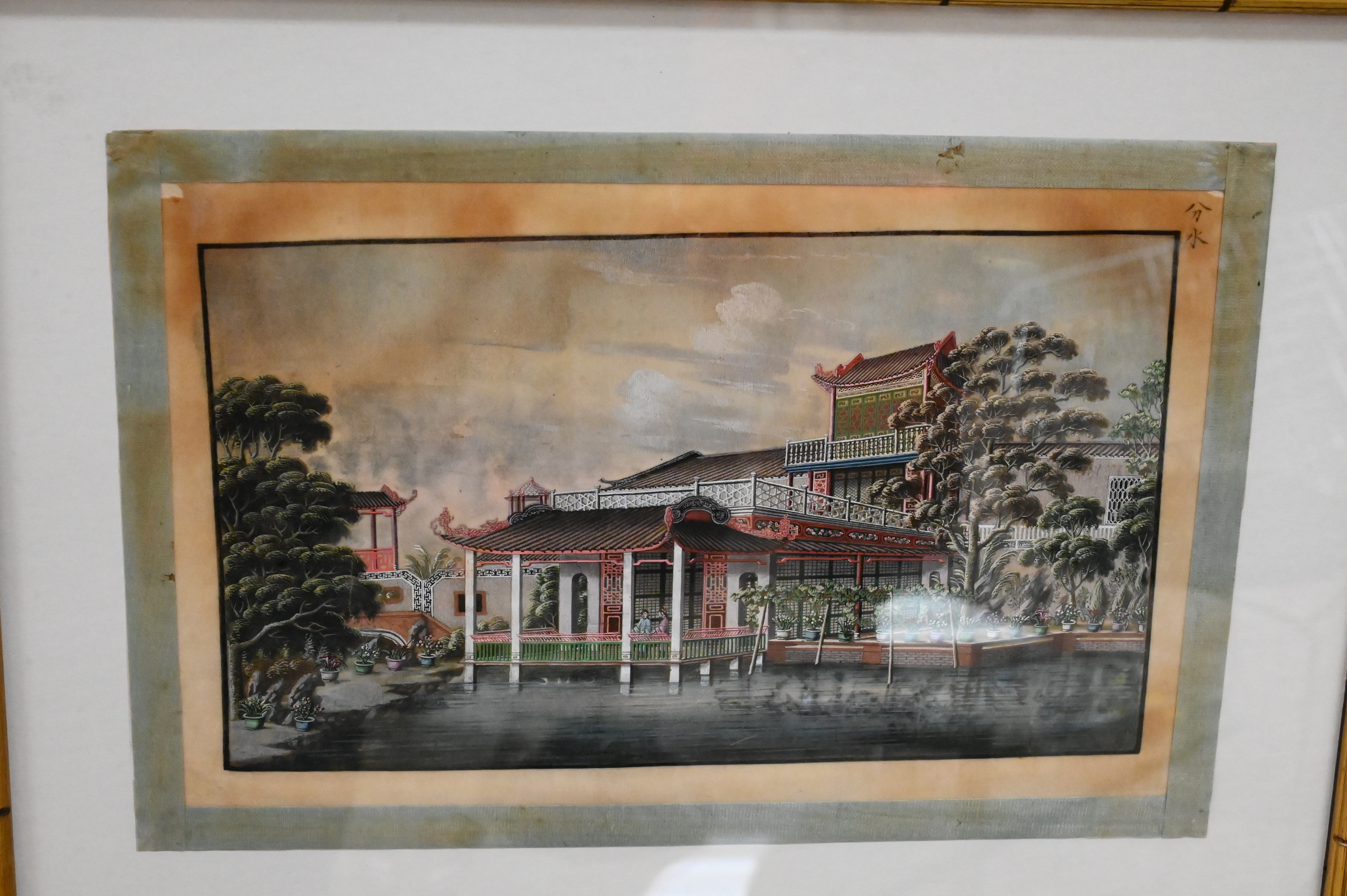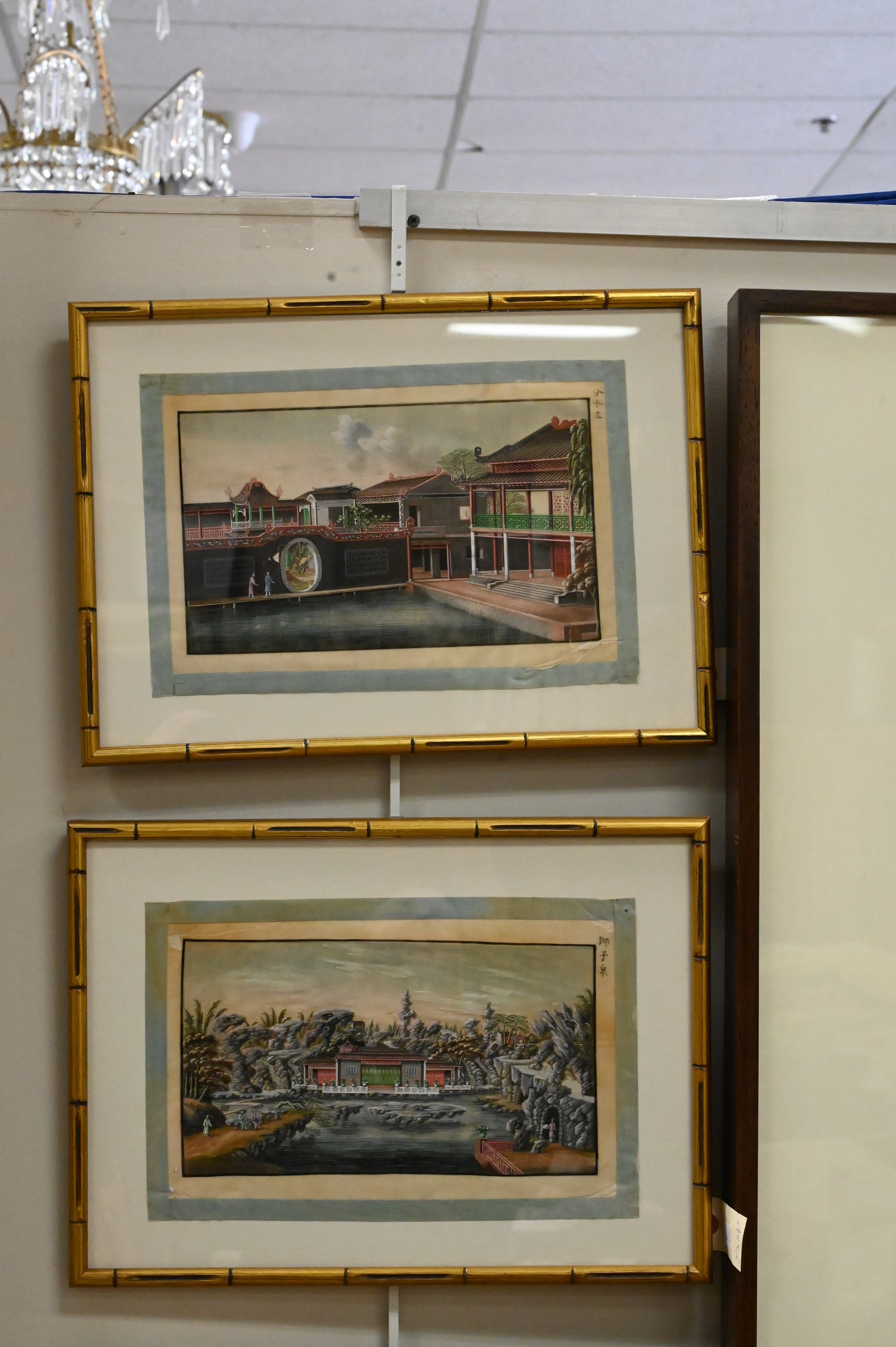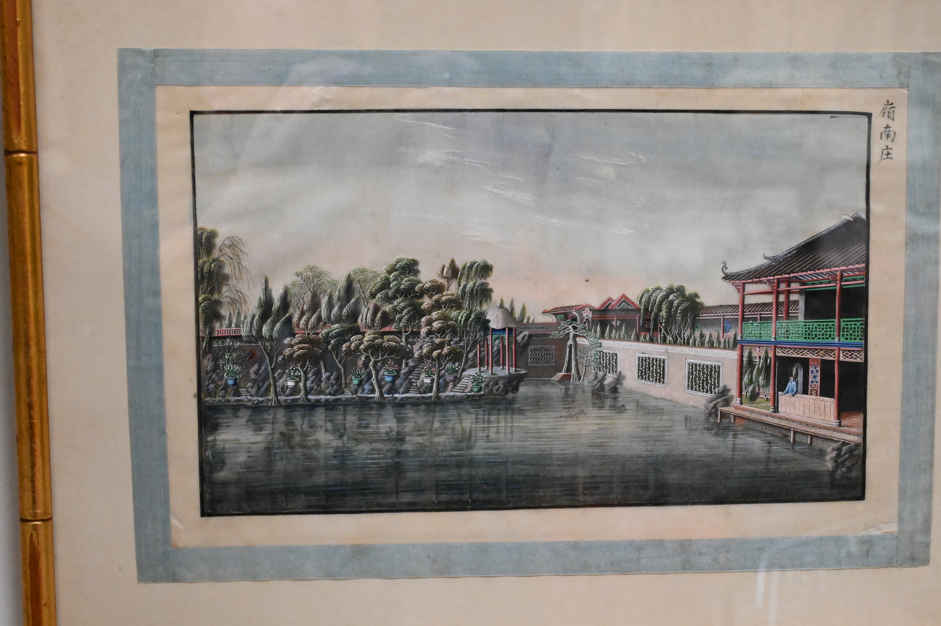 Set of Four Chinese Paintings, finely painted on tissue paper, courtyard and mountainous landscape with figures, signed to right corner, 7″ x 11 1/2″.