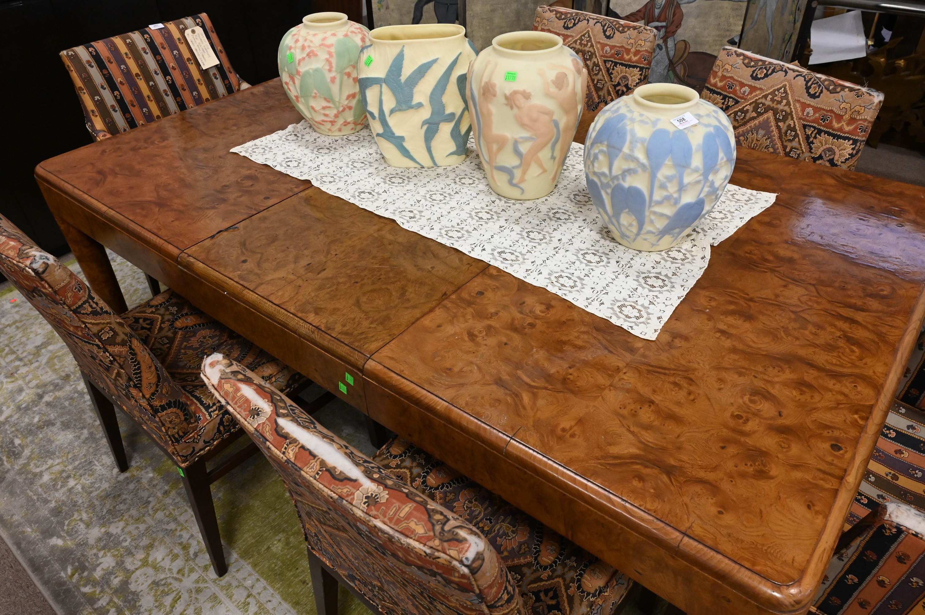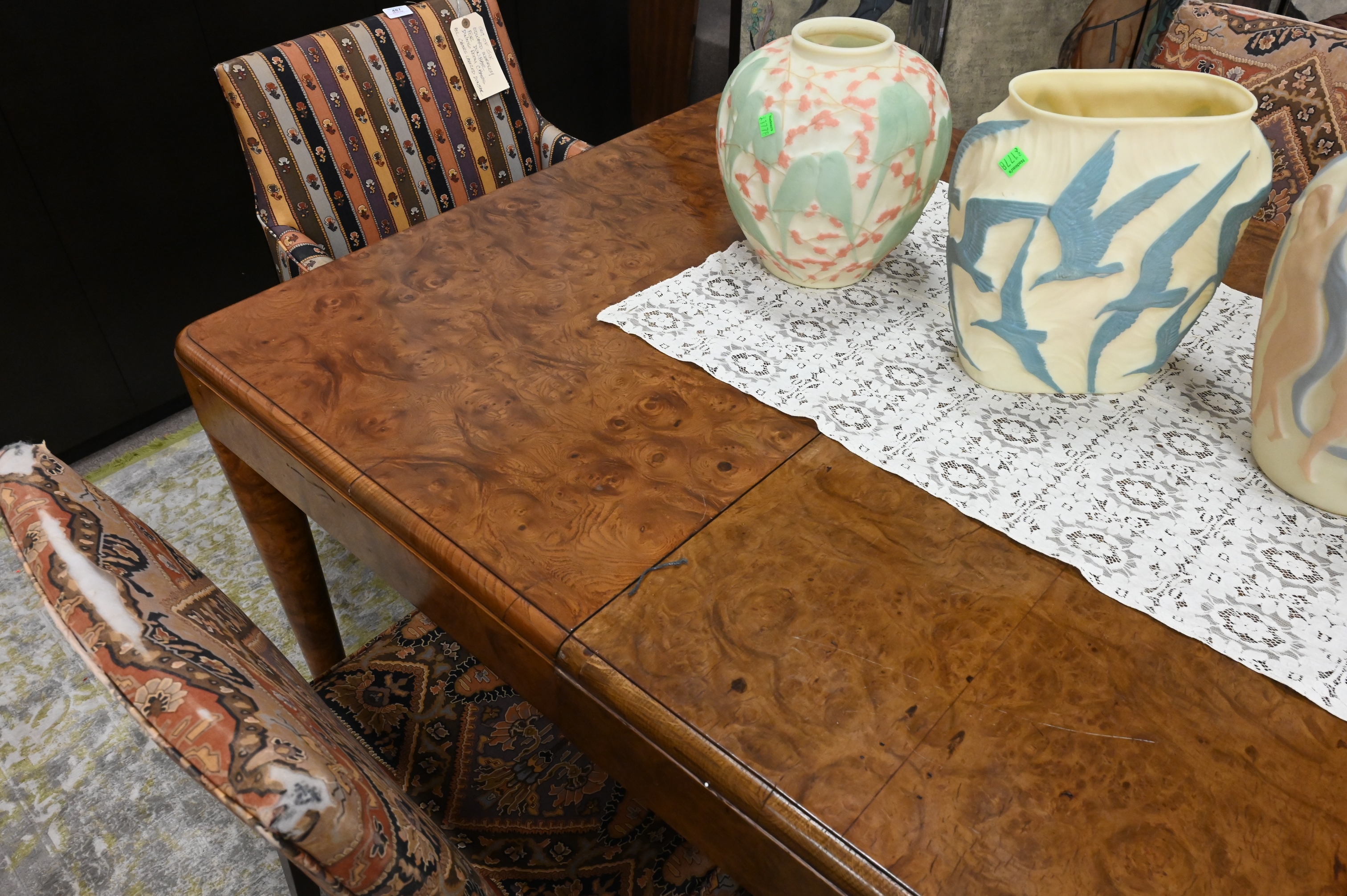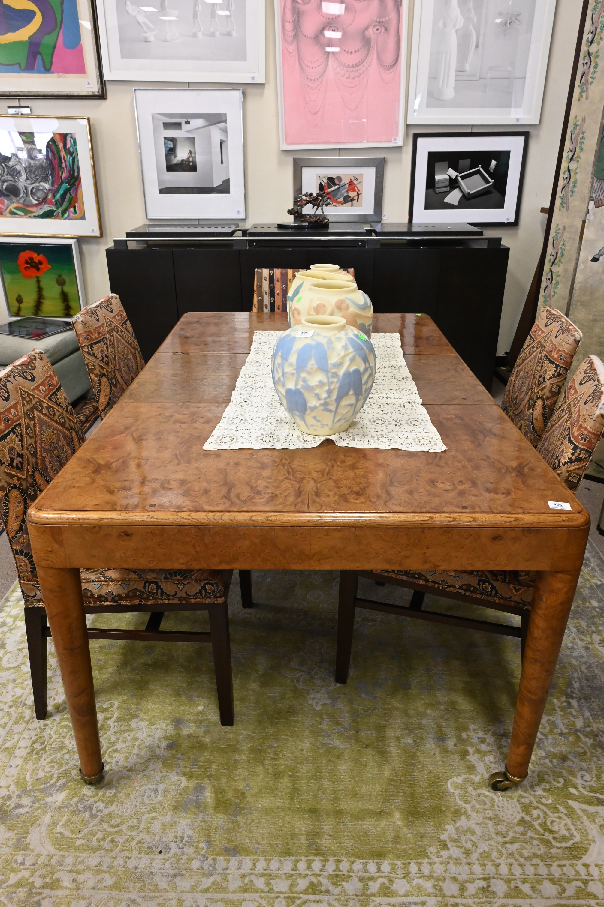 on simple turned legs, having two leaves and drop down center support legs and brass capped feet, with brass label, Waring and Gillow Paris, Madrid et. Bruxelles