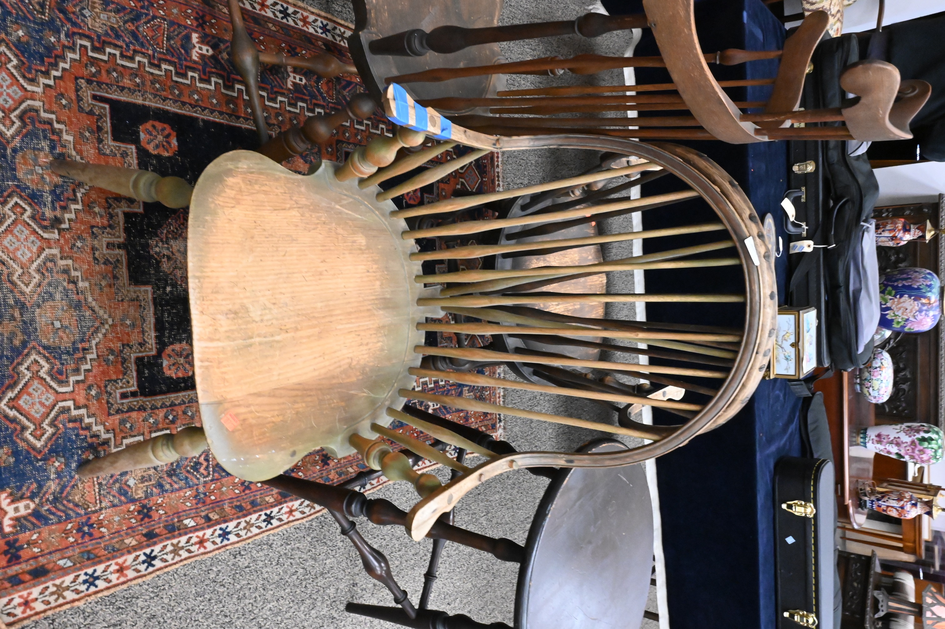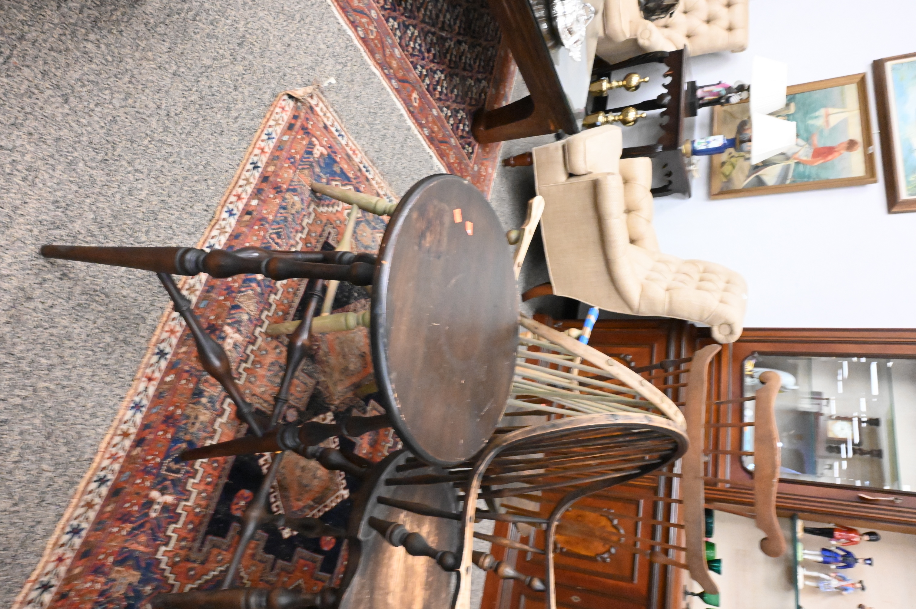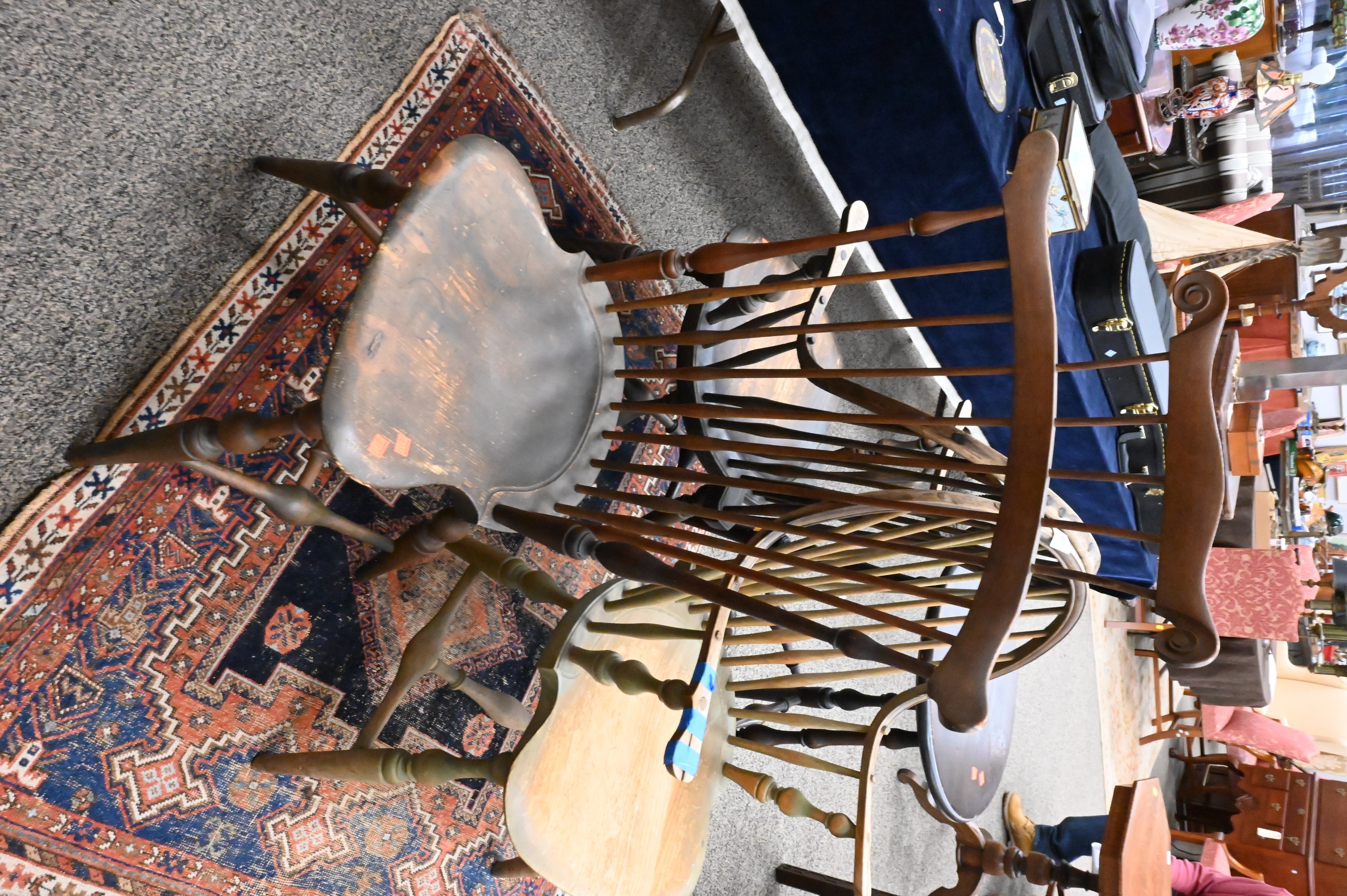 to include one Wallace Nutting chair, three windsor style chairs one of which is marked in script, one having remnants of paper label, along with one having stand with paper label