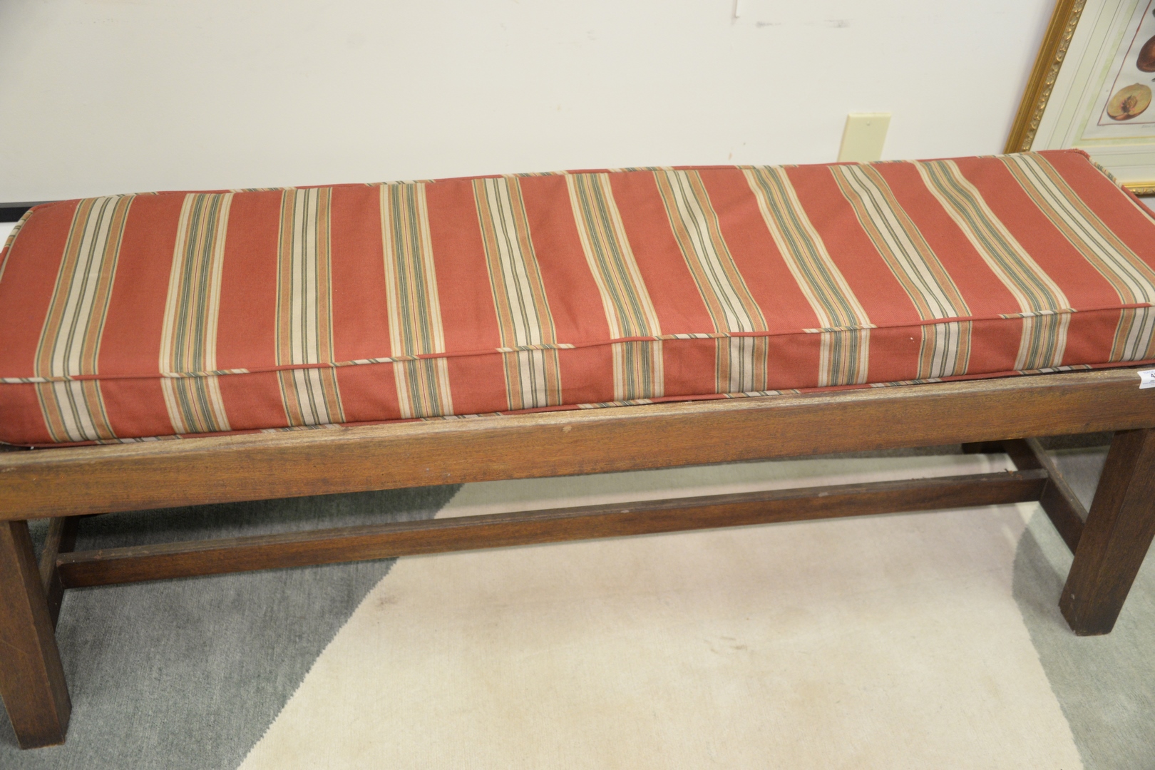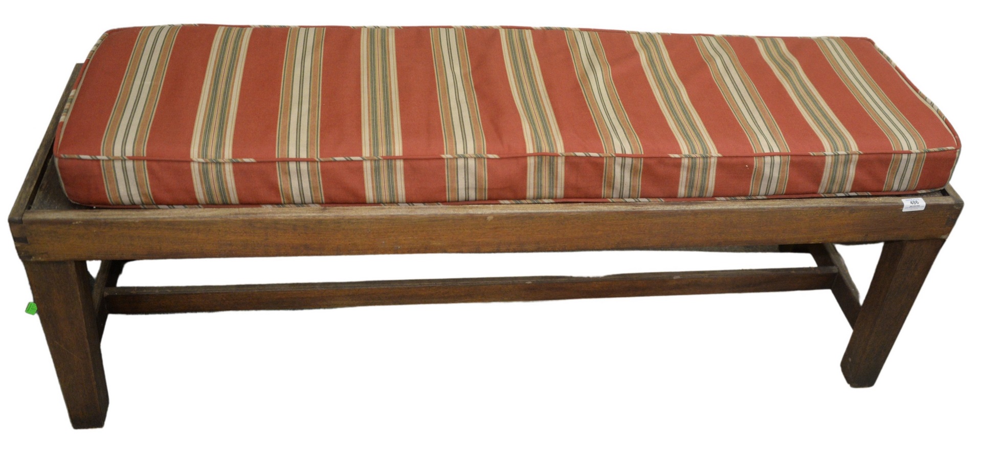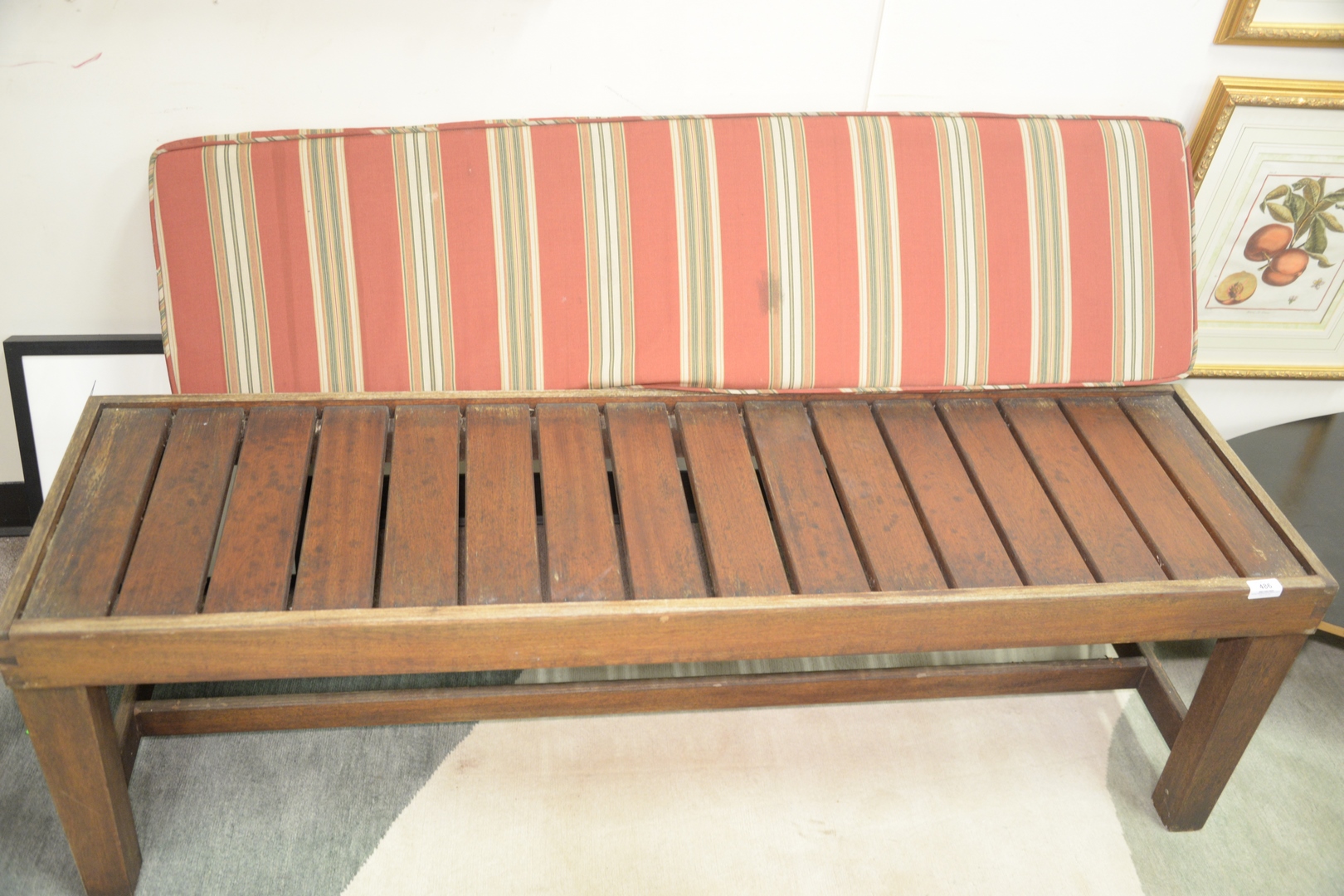 Lot 486: Outdoor teak bench having red cushion, height 18 inches, width 56 inches, depth 16 inches. Provenance: David and Cynthia Kim, 22 Stoney Wylde Lane, Greenwich, Connecticut. View home by visiting: https://www.zillow.com/homedetails/22-Stoney-Wylde-Ln-Greenwich-CT-06830/177238281_zpid/