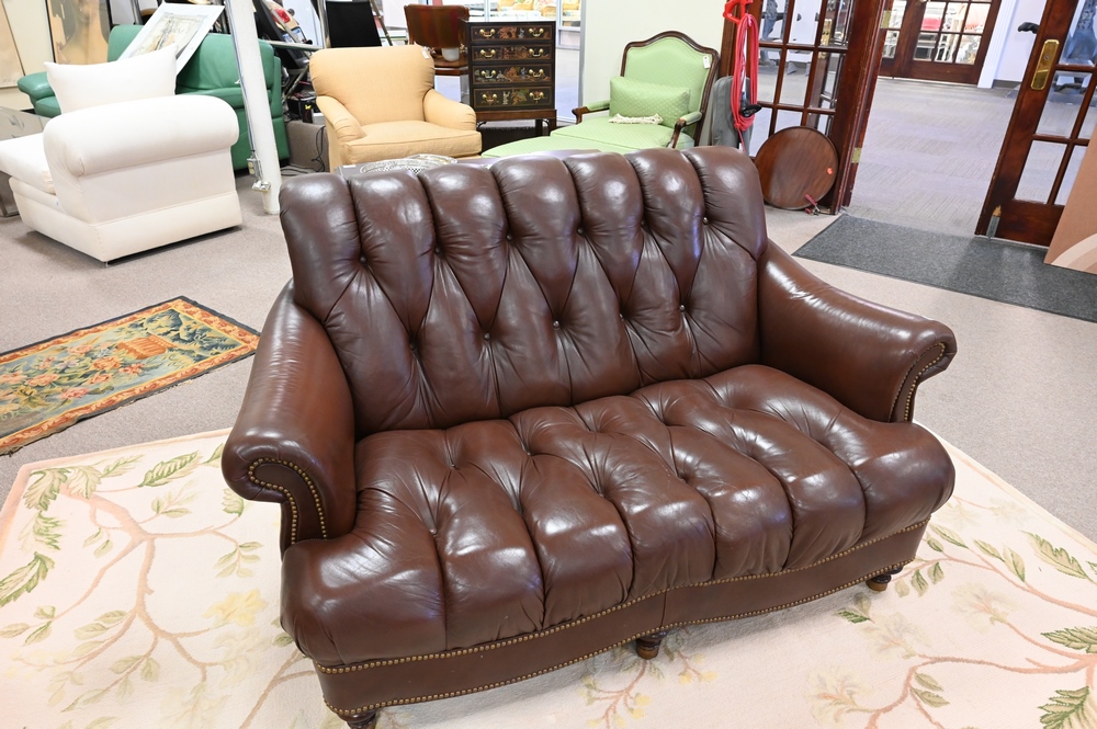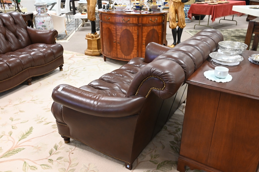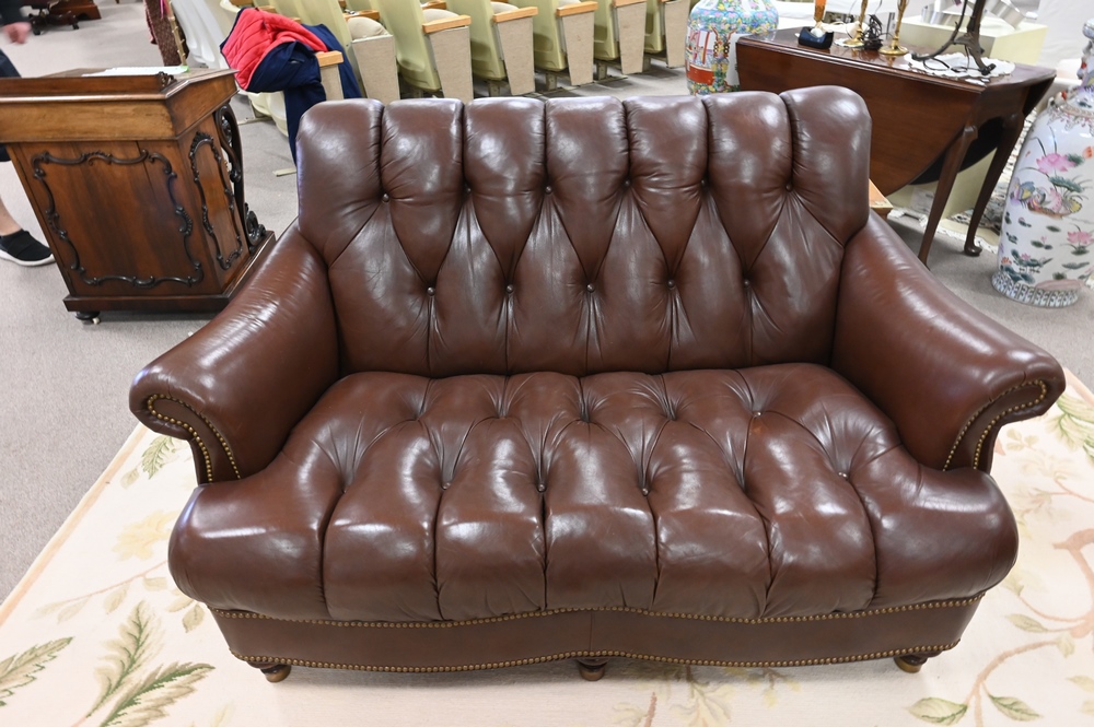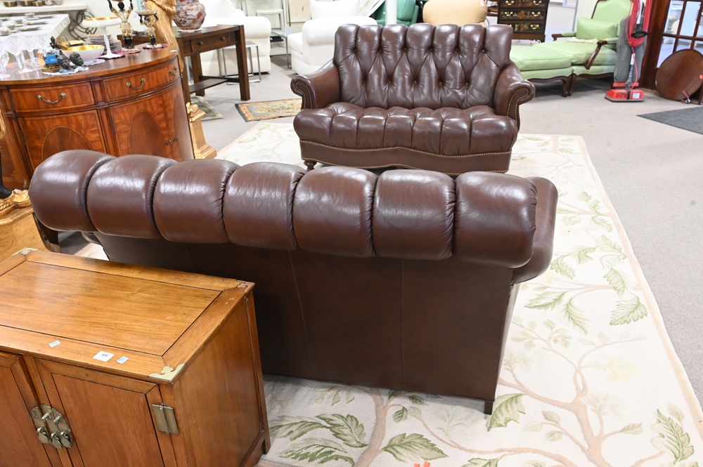 Lot 486: Pair of Hancock and Moore Brown Leather Loveseats, having tufted backs and seats, (very clean condition), height 35 inches, length 6…