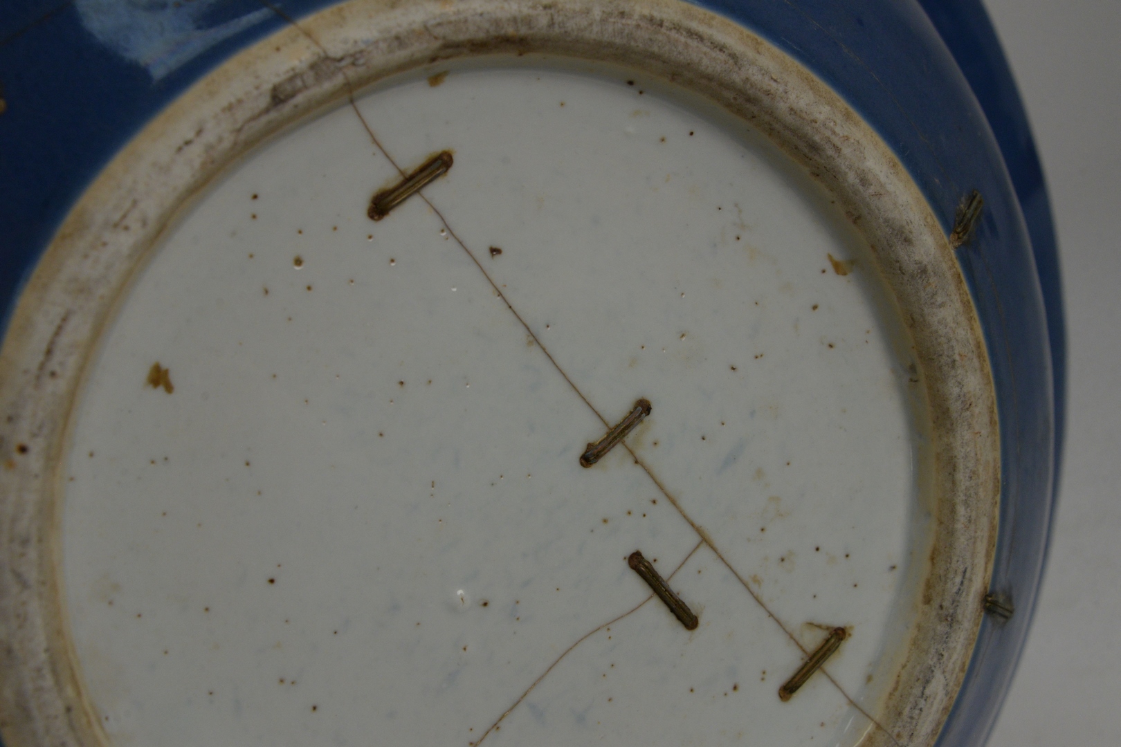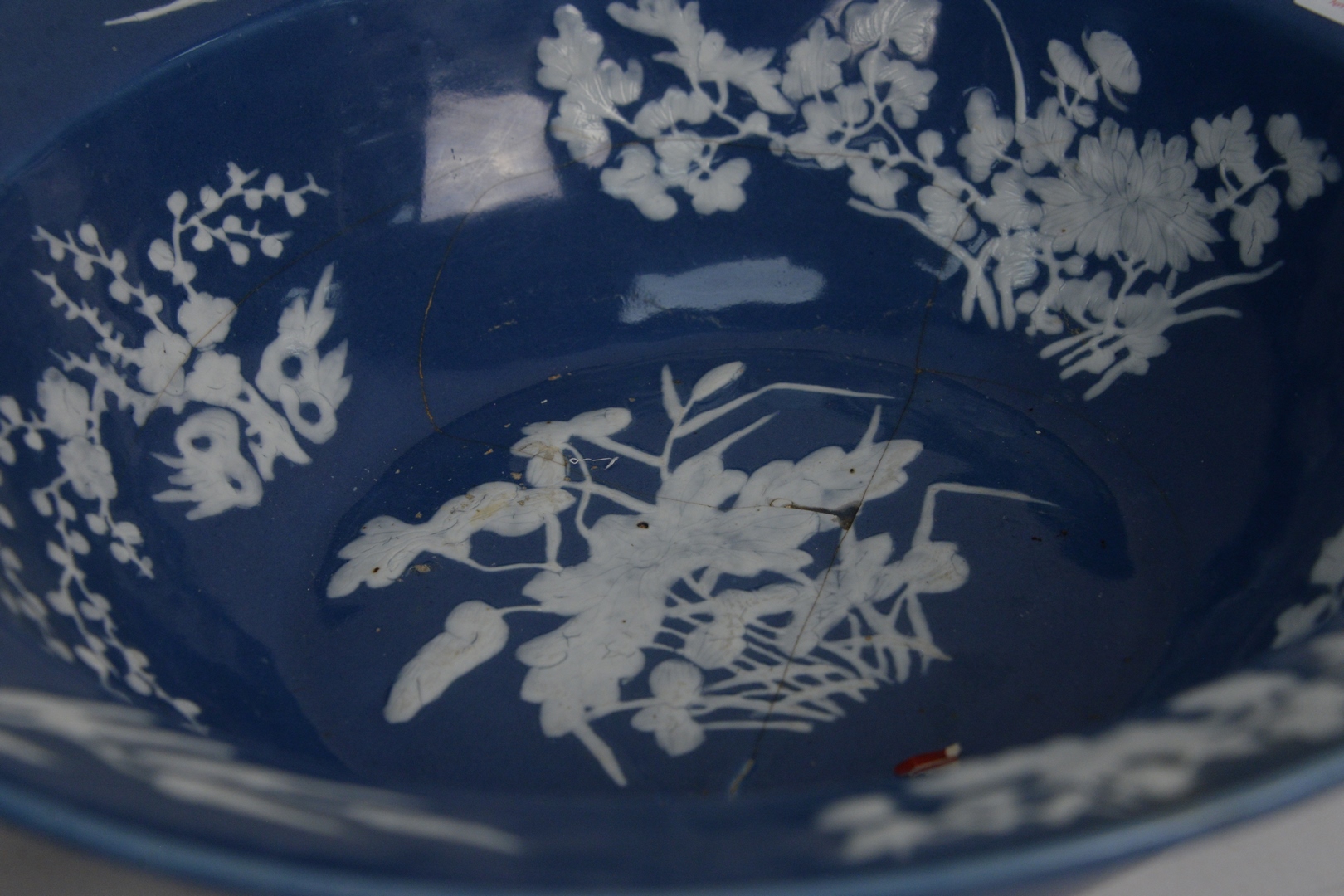 Lot 486: Pate Sur Pate Porcelain Wash Bowl and Urn with Cover having powder blue with raised white decoration, bowl diameter 16 inches, urn height 13 inches as is, repaired. Provenance: From a Newport, Rhode Island historic home, in the same family since