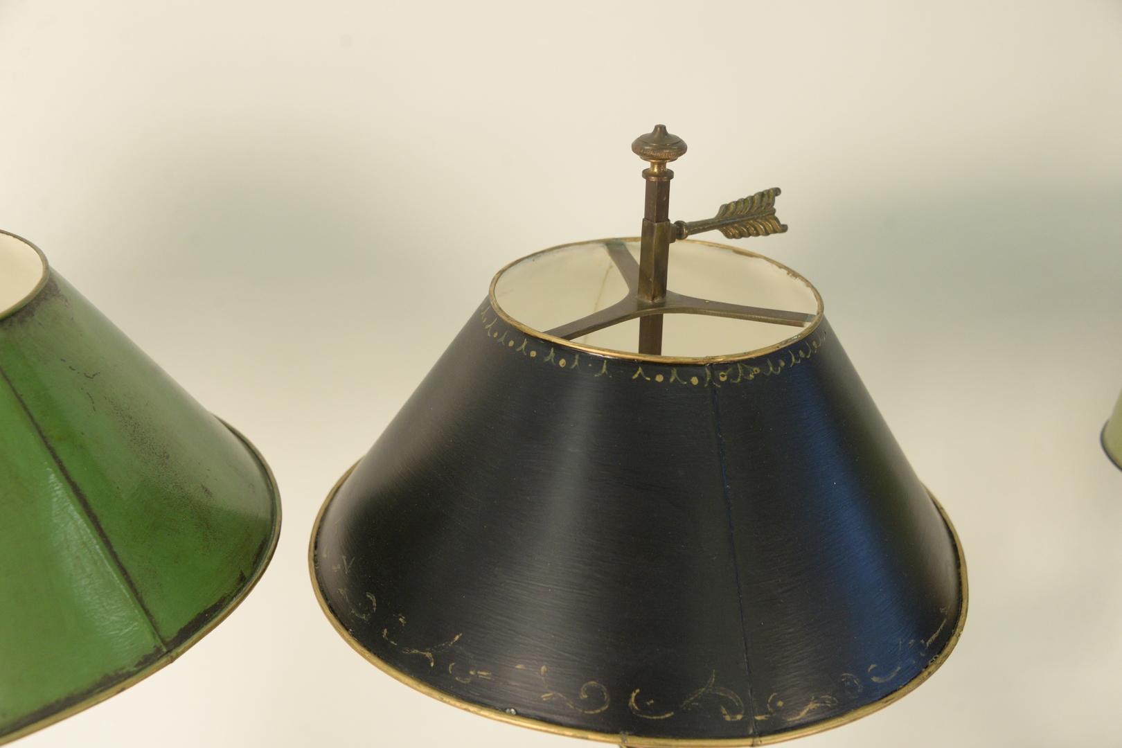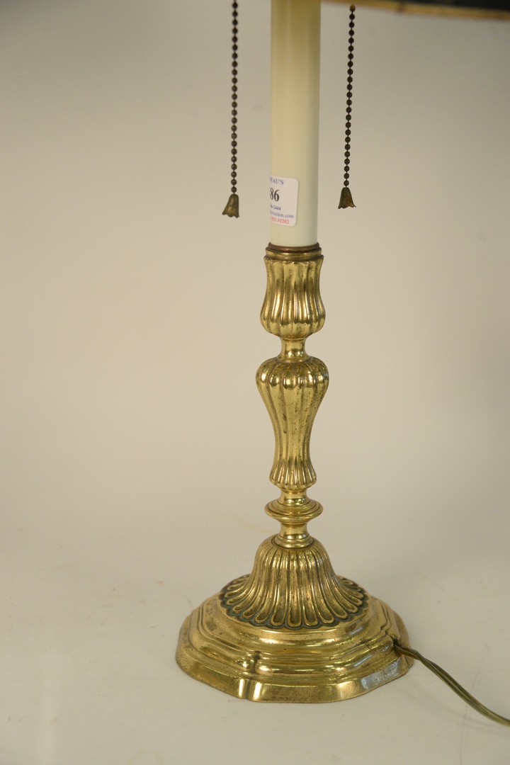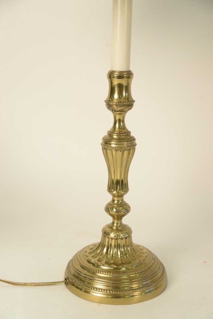 Lot 486: Two French Brass Candlesticks, made into lamps, with adjustable tole shades, height 24 inches.