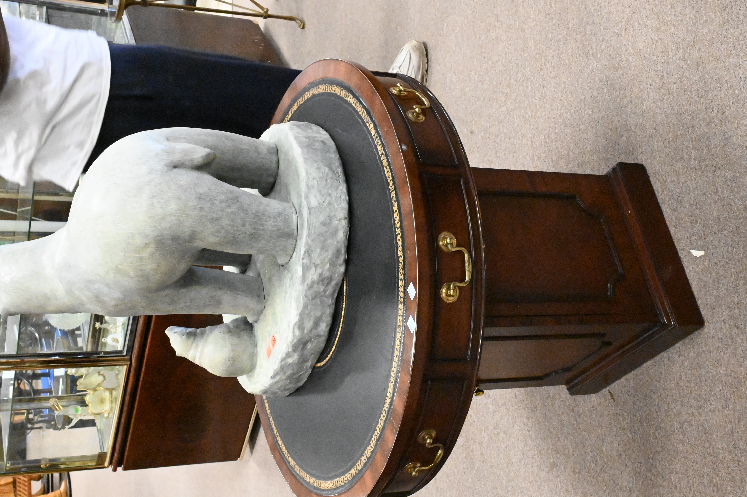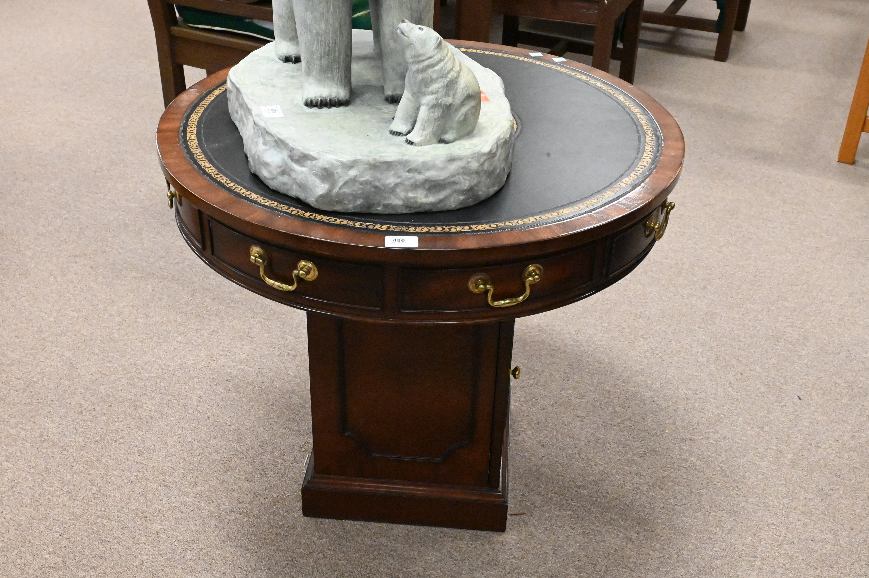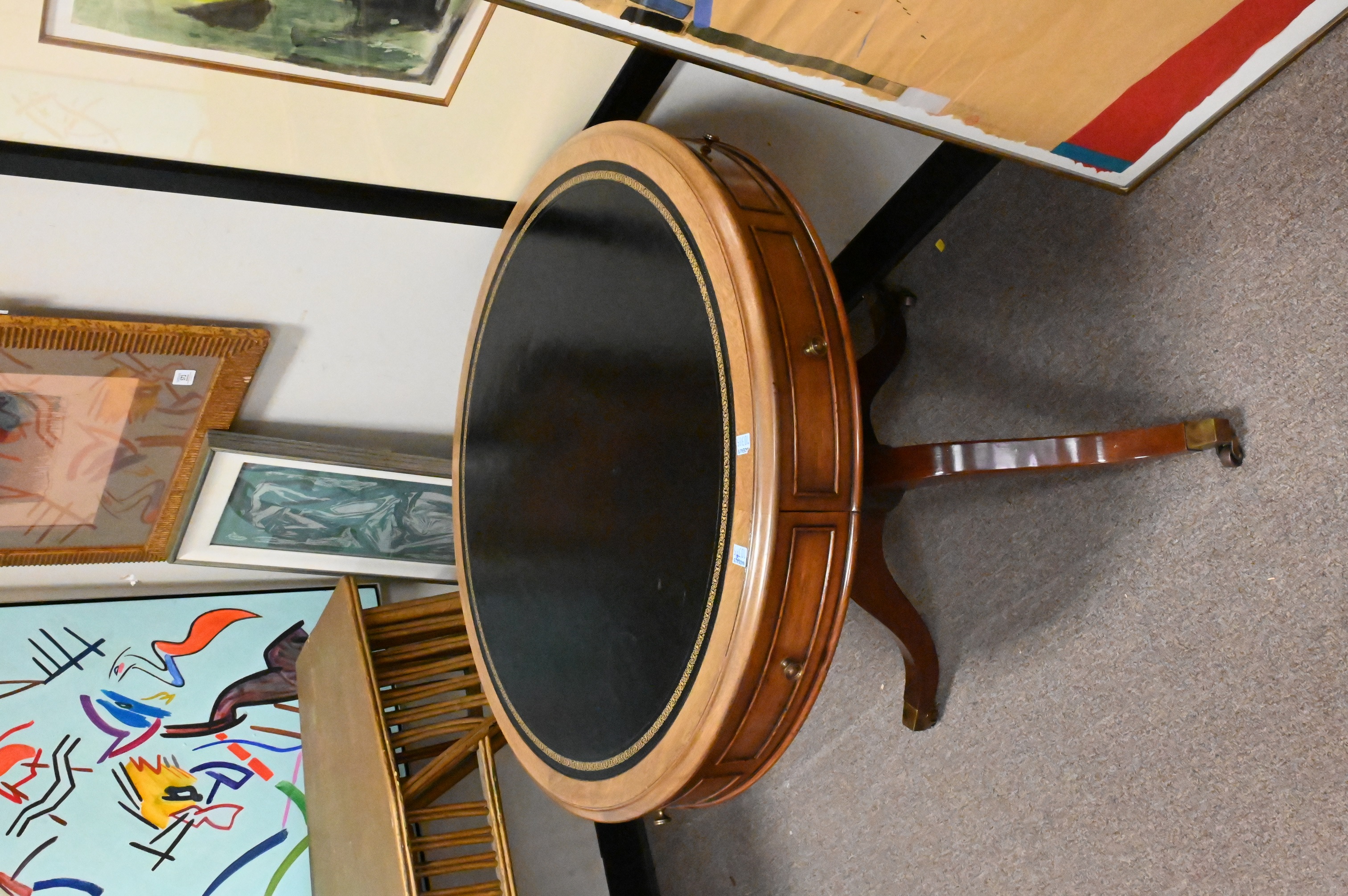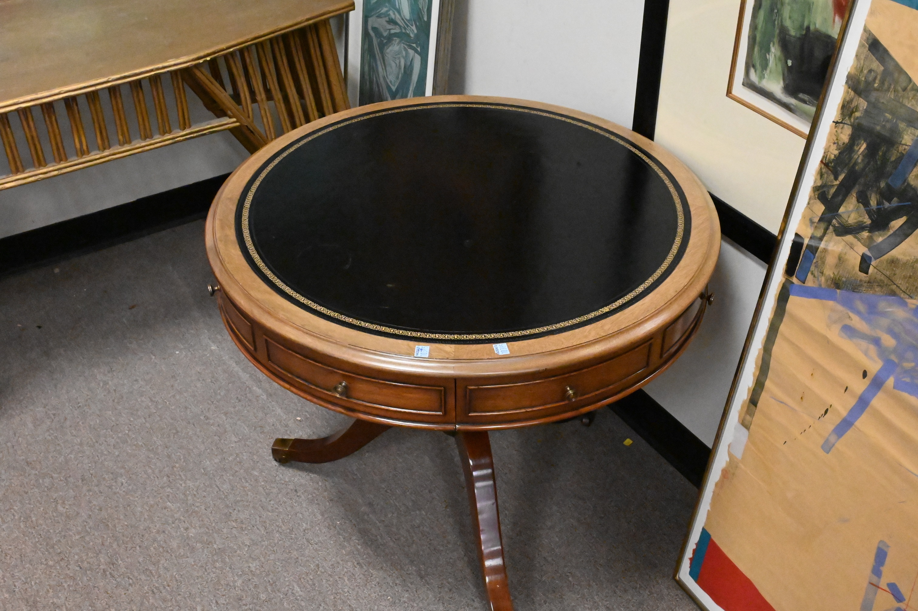 having tooled leather top with square base having door, along with one tooled leather top having tripod base