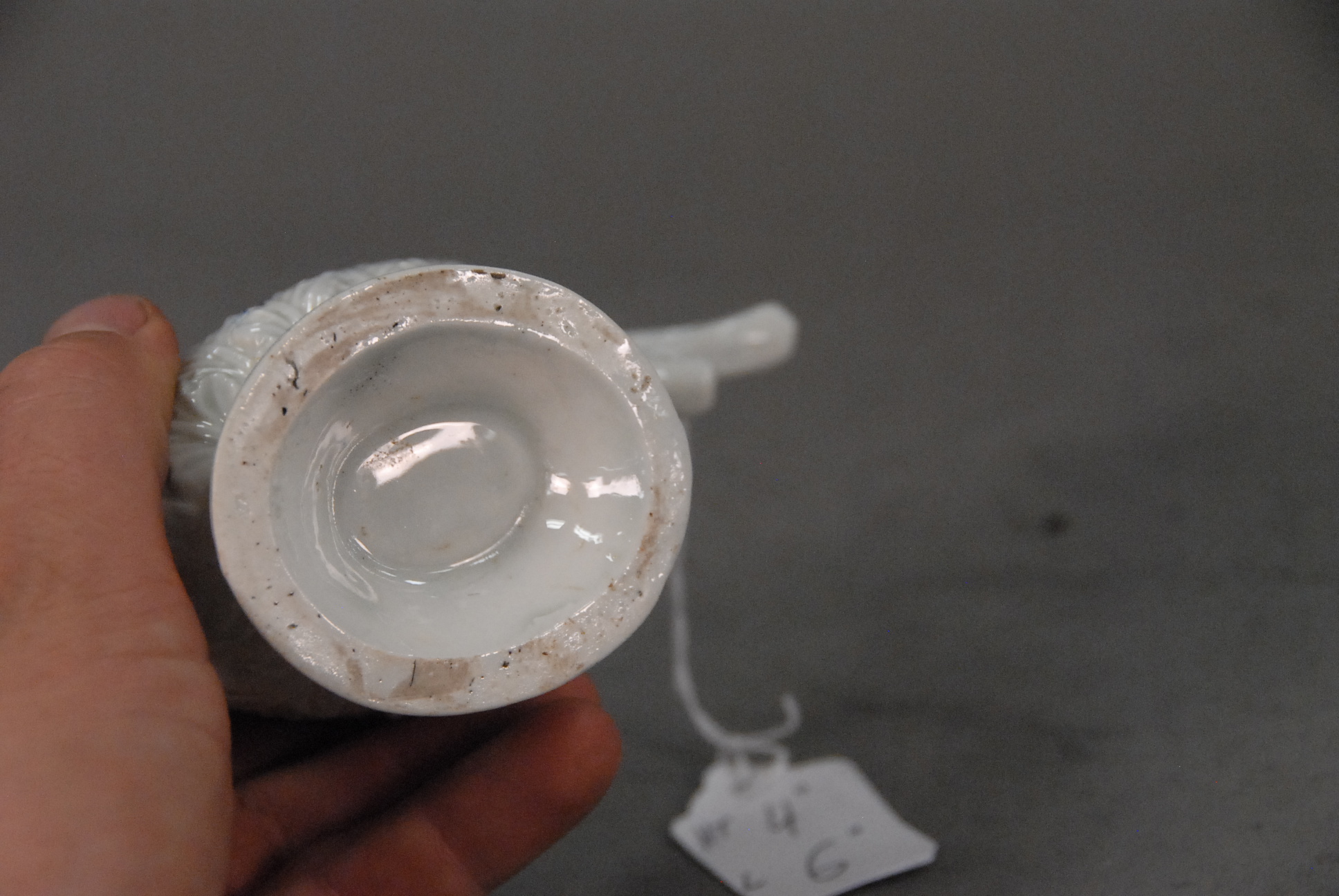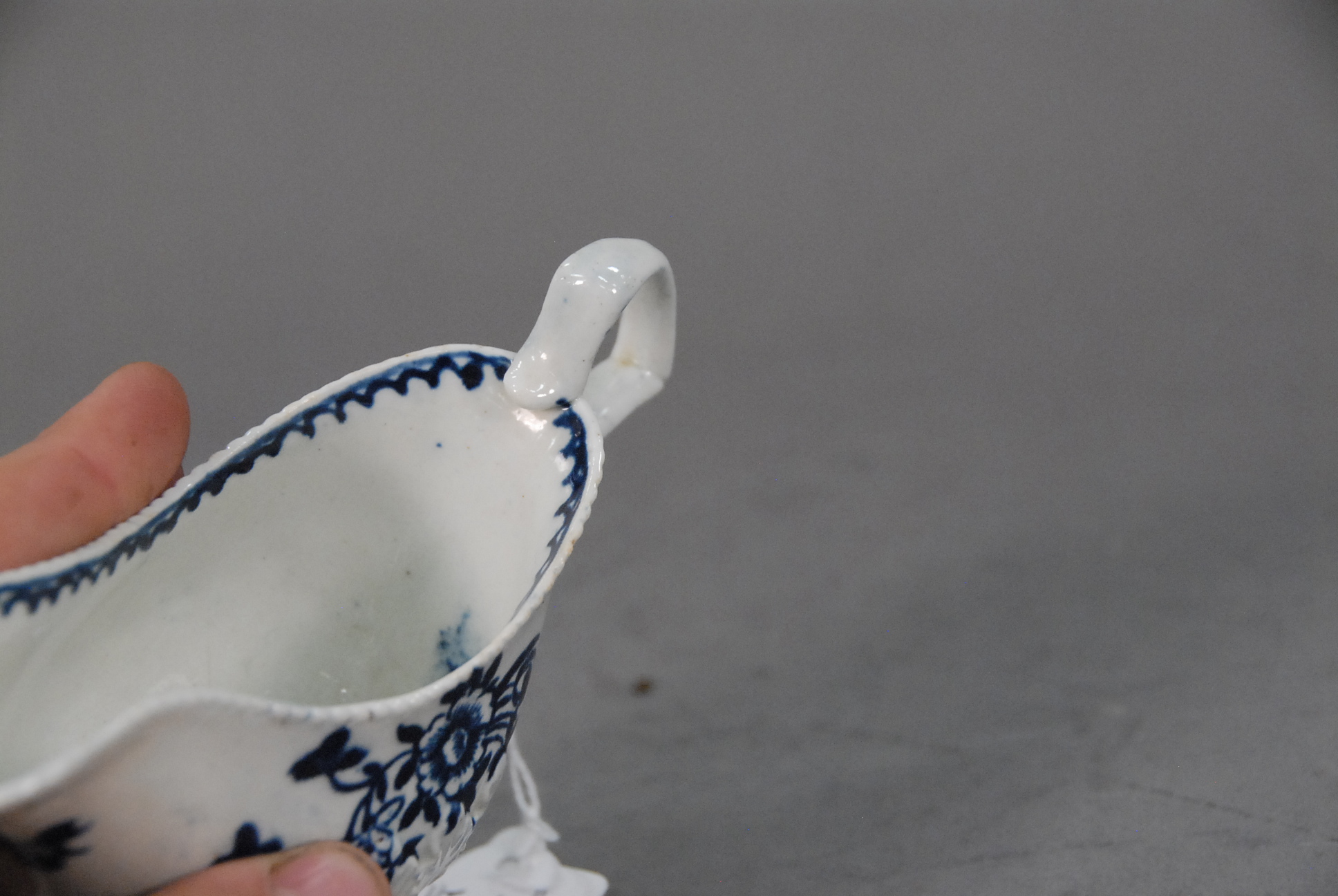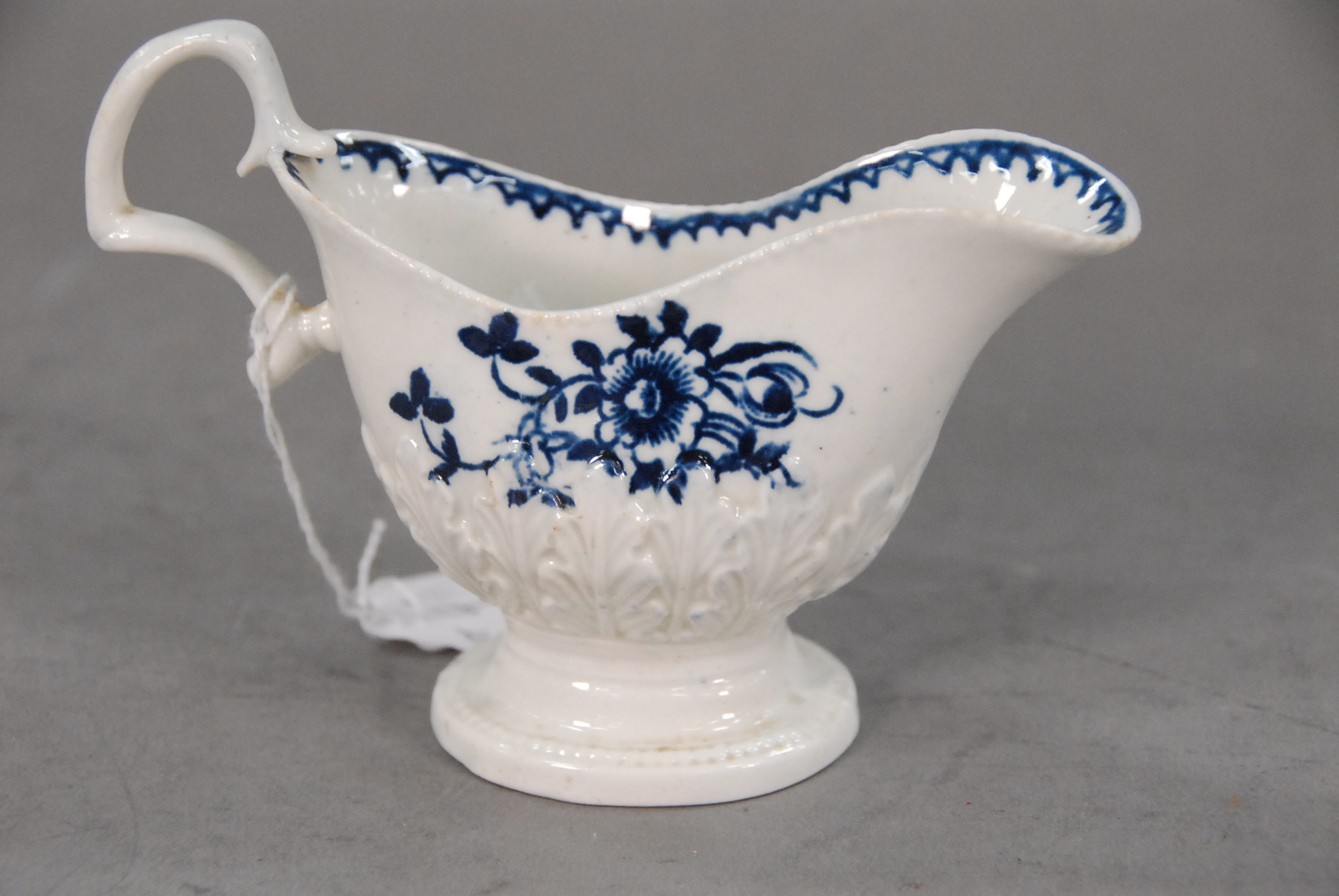A Liverpool porcelain cream jug,probably Pennington, with blue decoration and applied flowers to base. Circa 1780.
