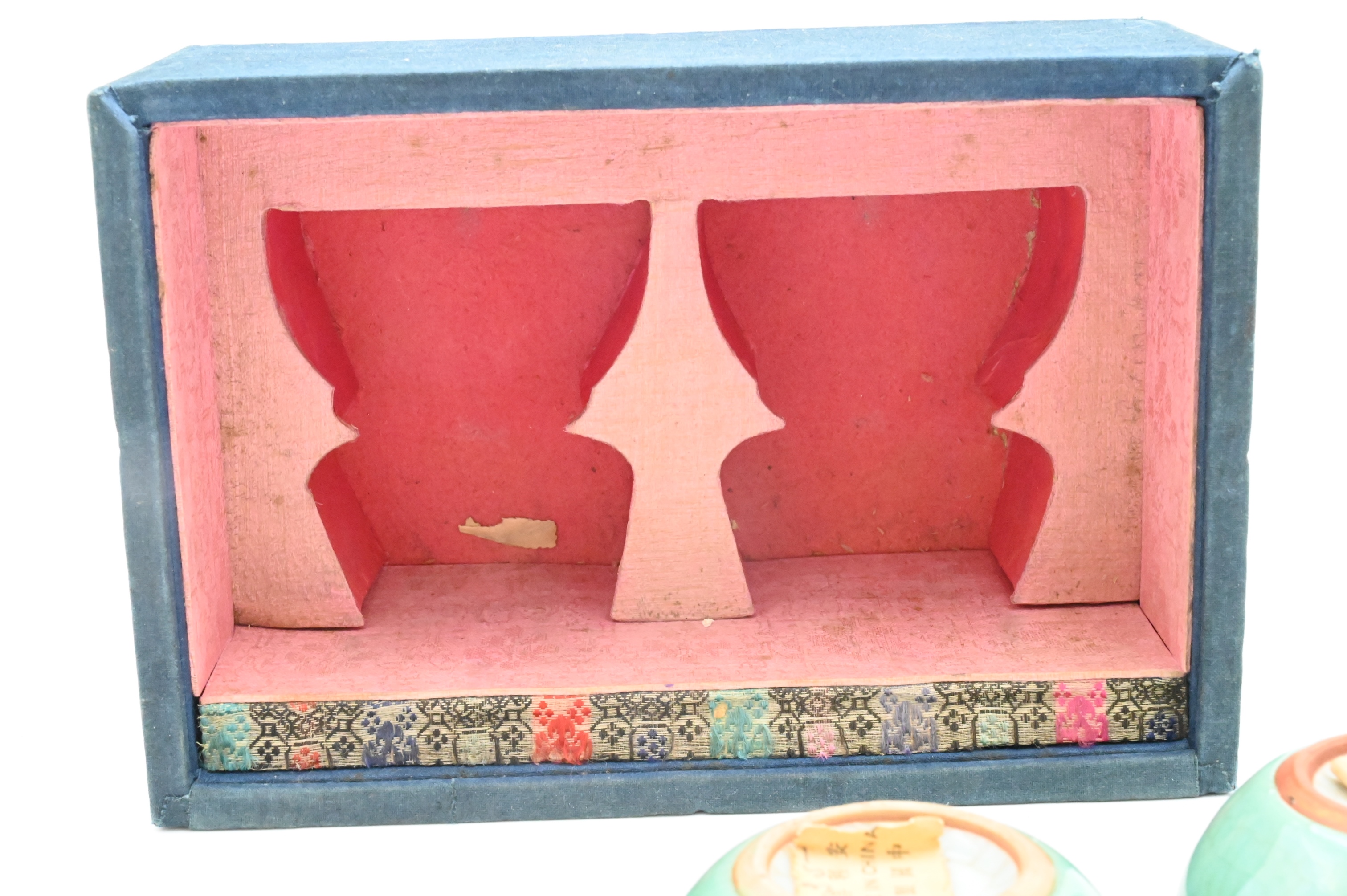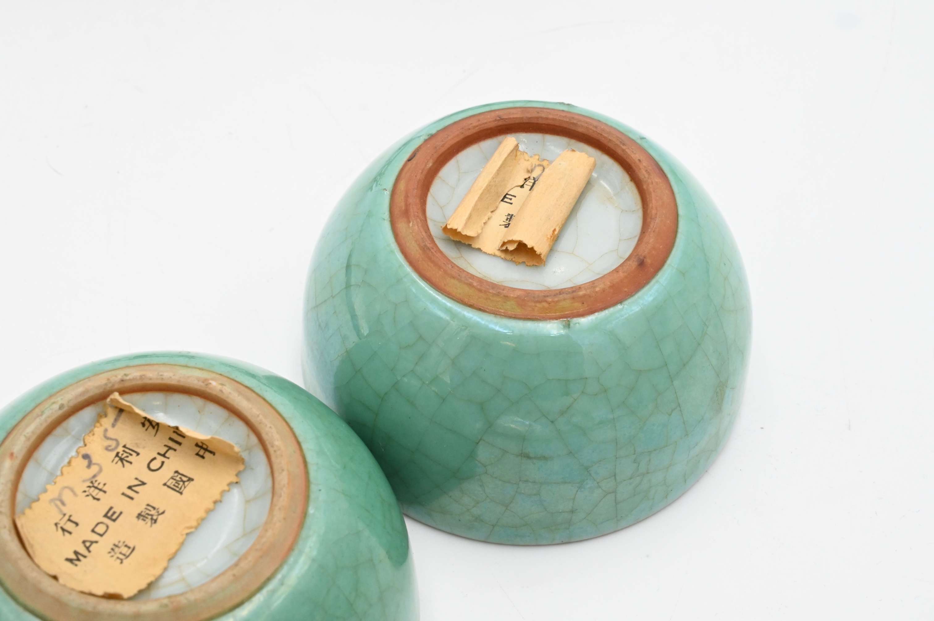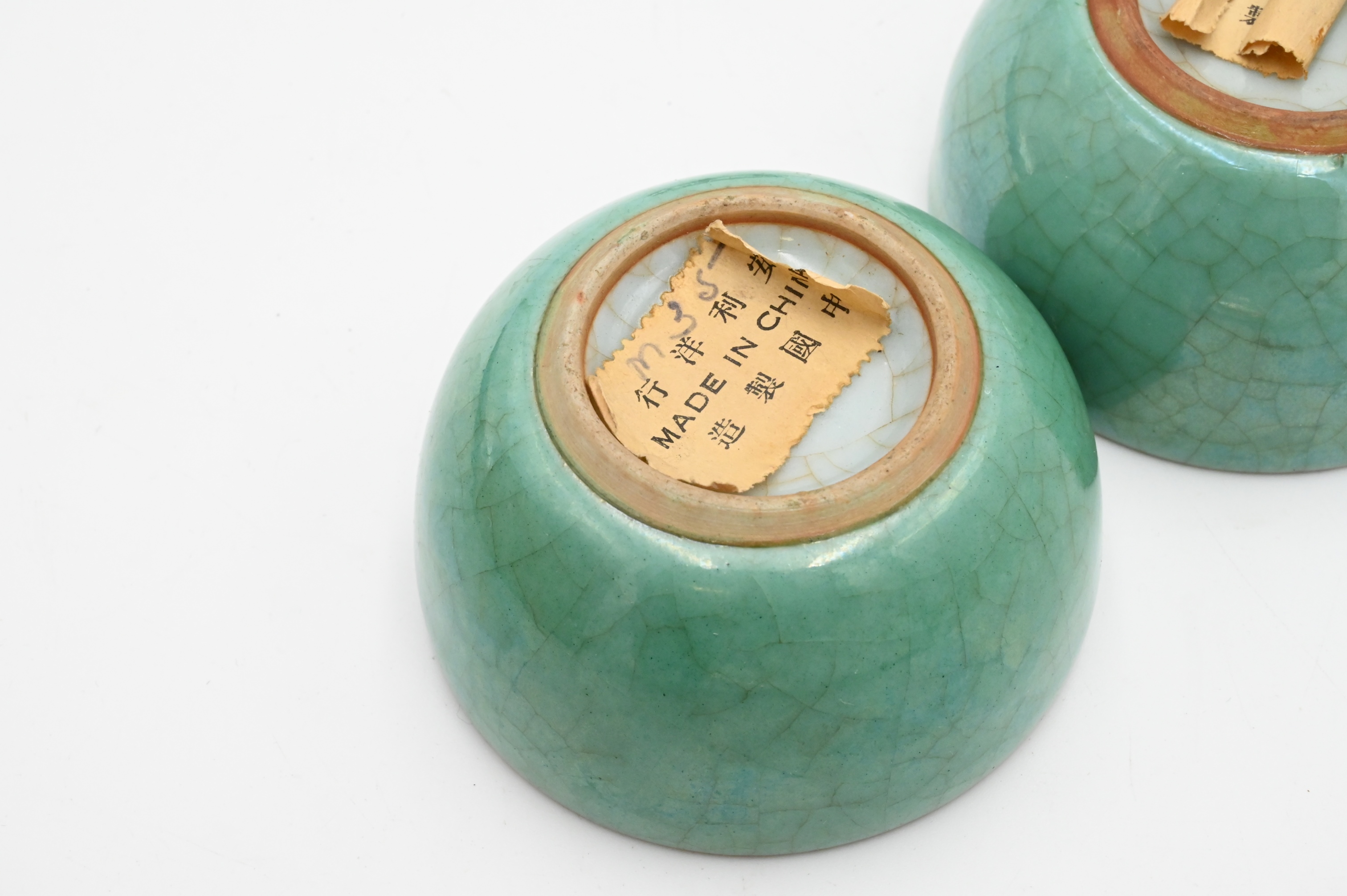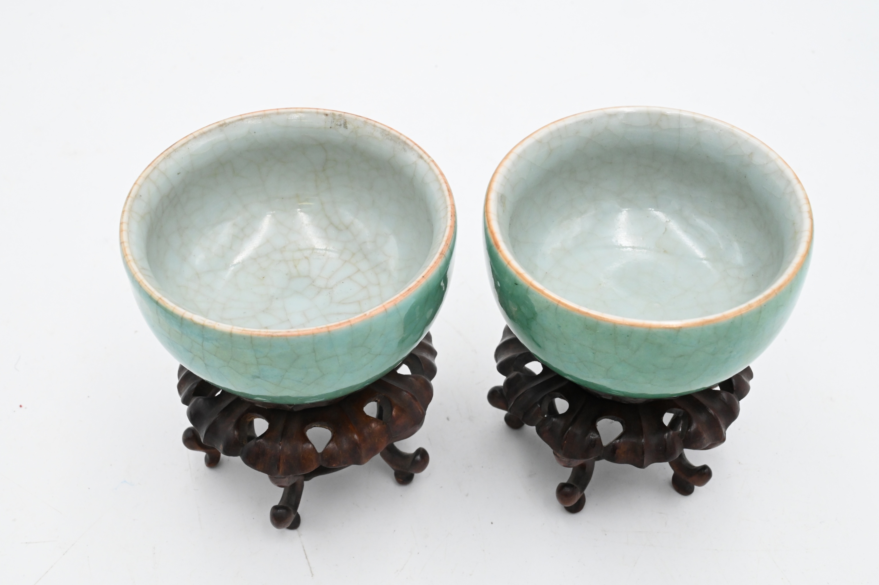 A Pair of Green Crackle Glaze Tea Cups, on wood stands in a fitted box, height 2 inches with wooden stand, diameter 3 inches.