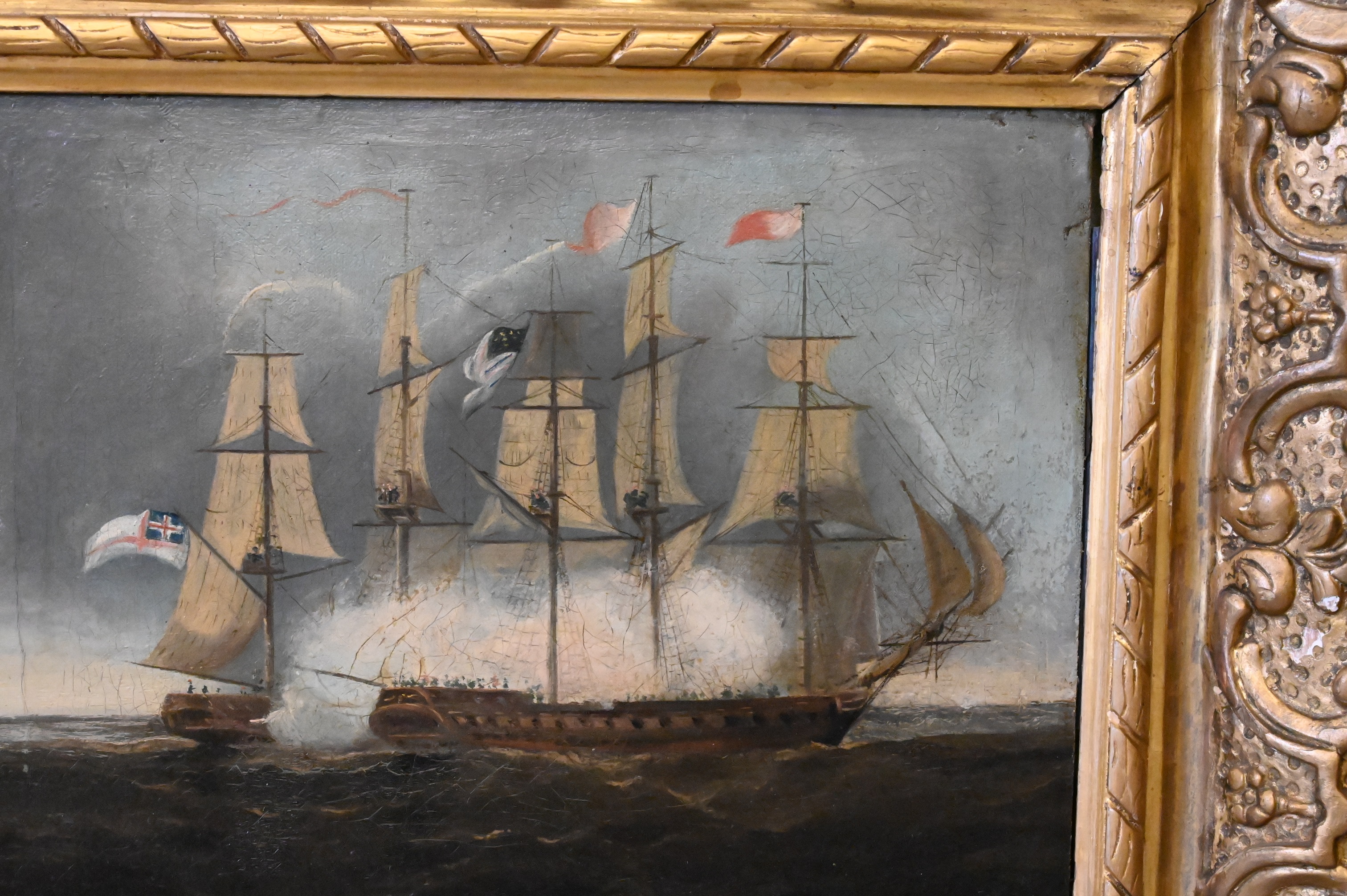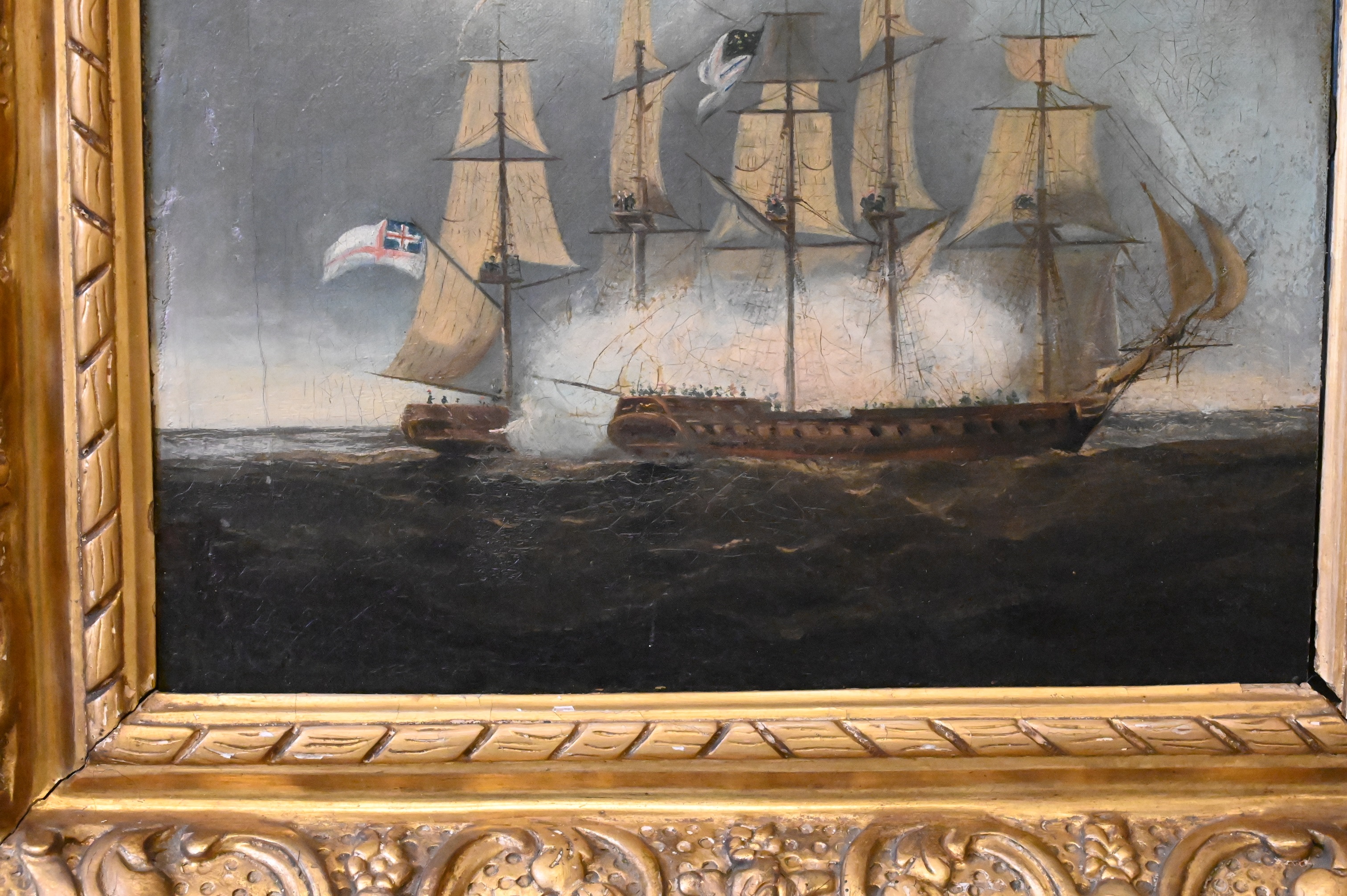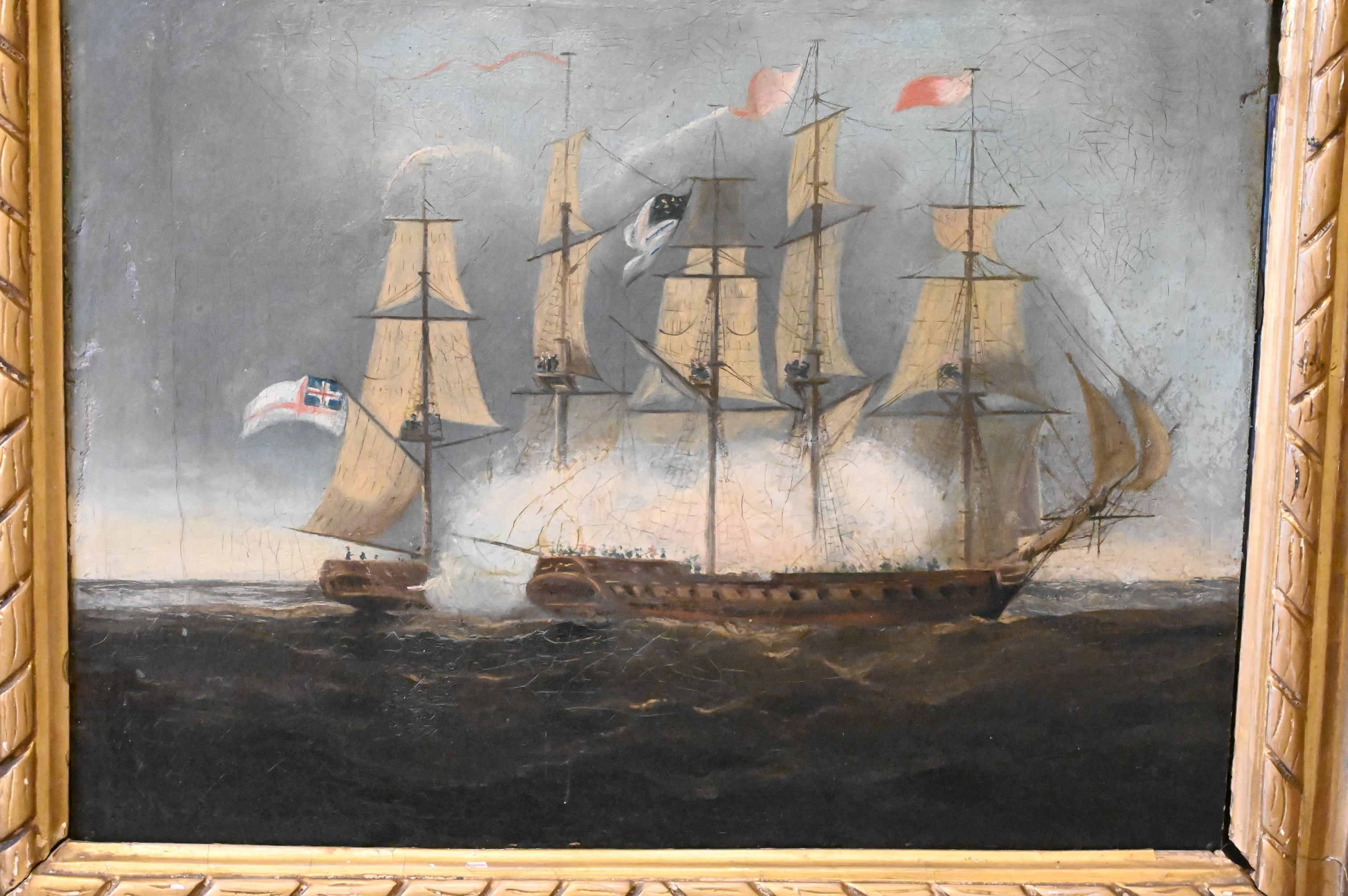 Depicting the American and British warships at sea in the early morning