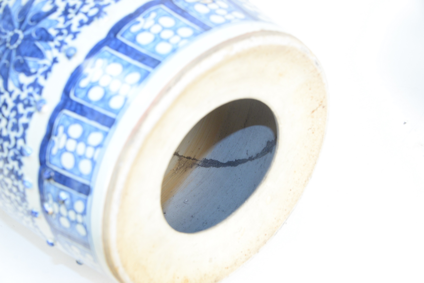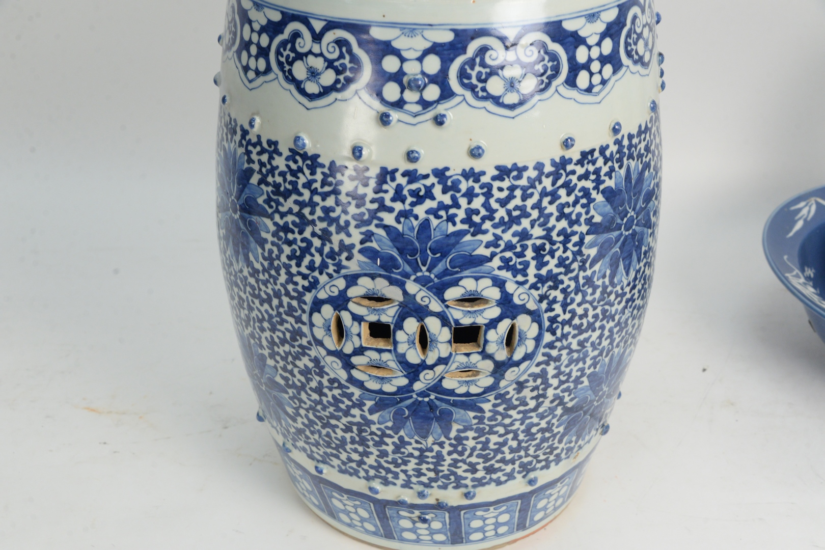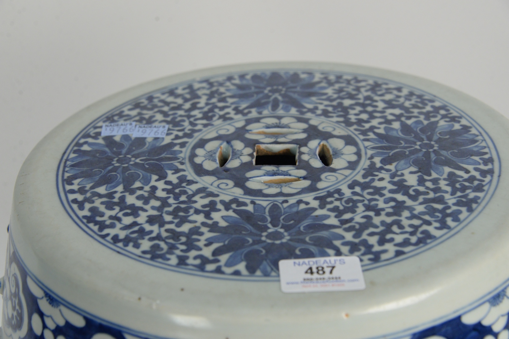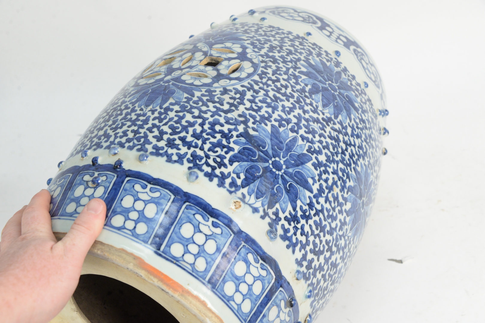 Lot 487: Chinese Blue and White Barrel Garden Seat with floral decoration throughout having double coin reticulated handles, 19th/20th century, height 19 inches.