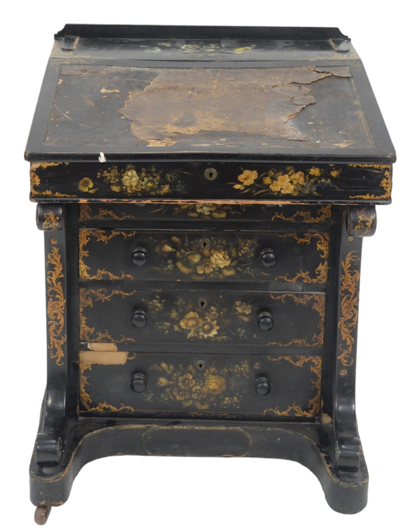 Lot 487: Chinoiserie Decorated Davenport Style Desk, height 32 1/2 inches, width 25 1/4 inches, depth 24 inches, (wear, chips).