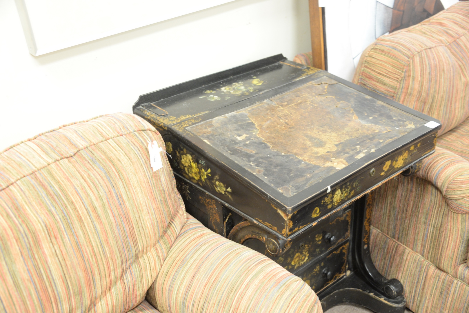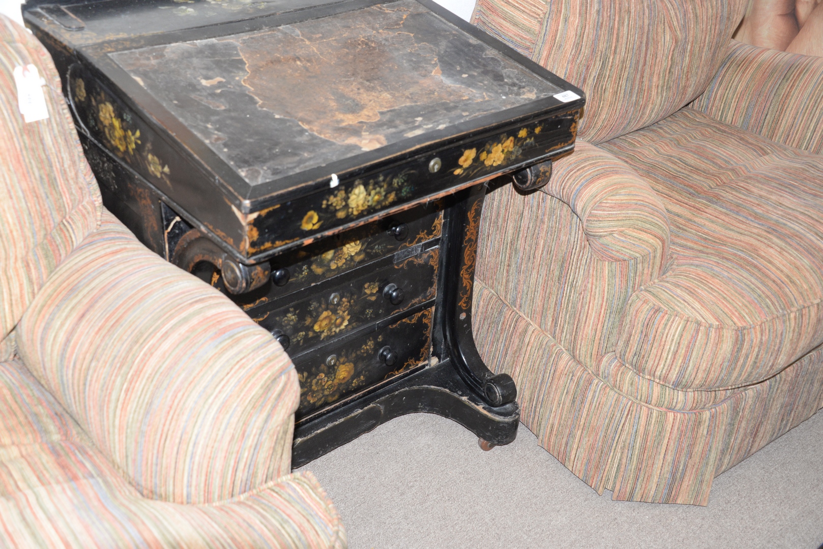 Lot 487: Chinoiserie Decorated Davenport Style Desk, height 32 1/2 inches, width 25 1/4 inches, depth 24 inches, (wear, chips).