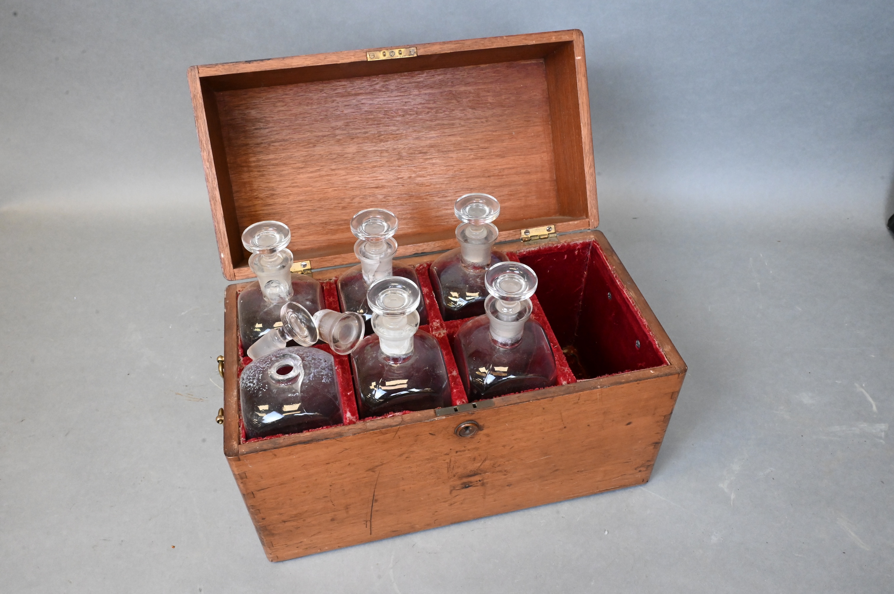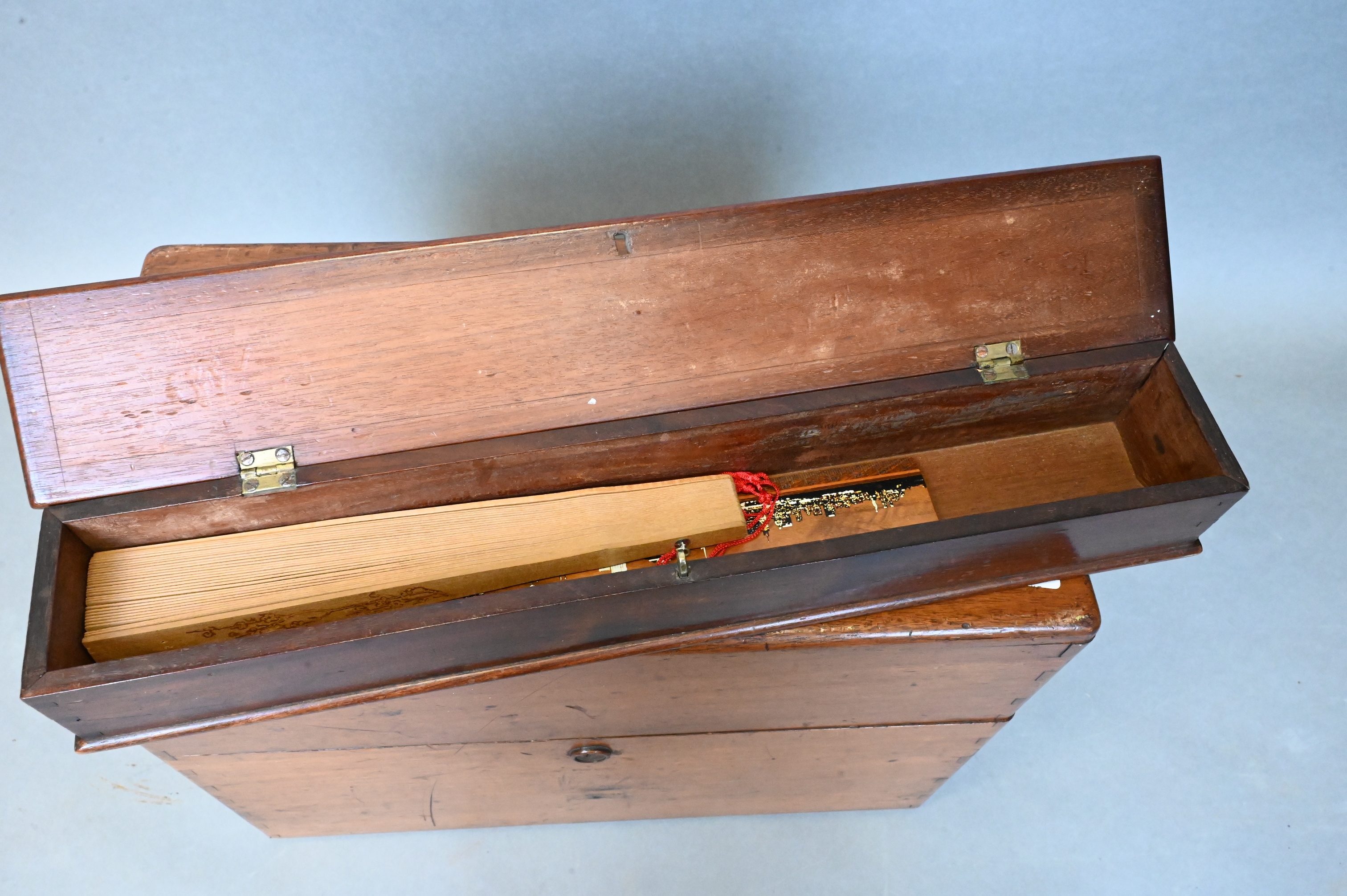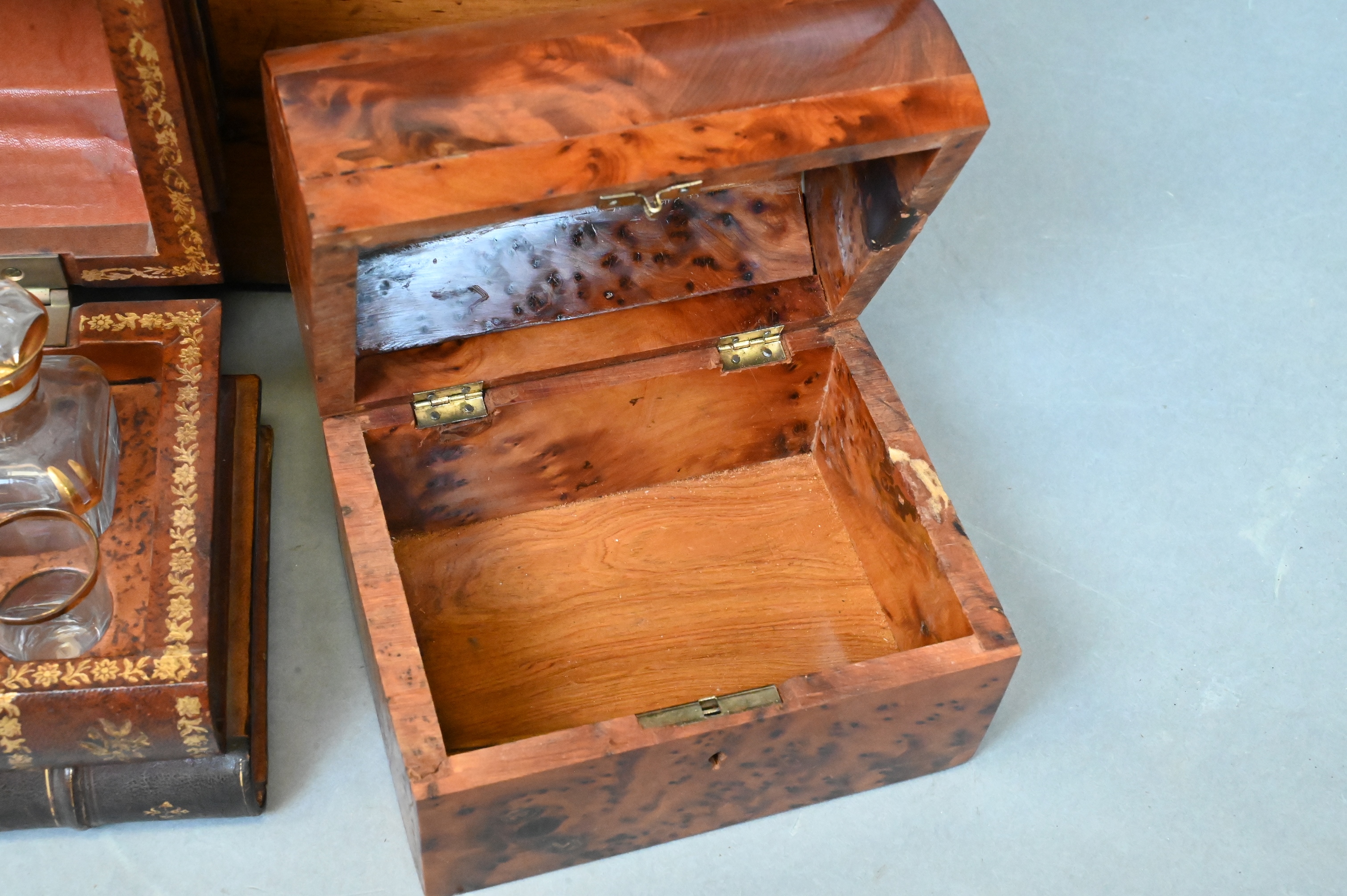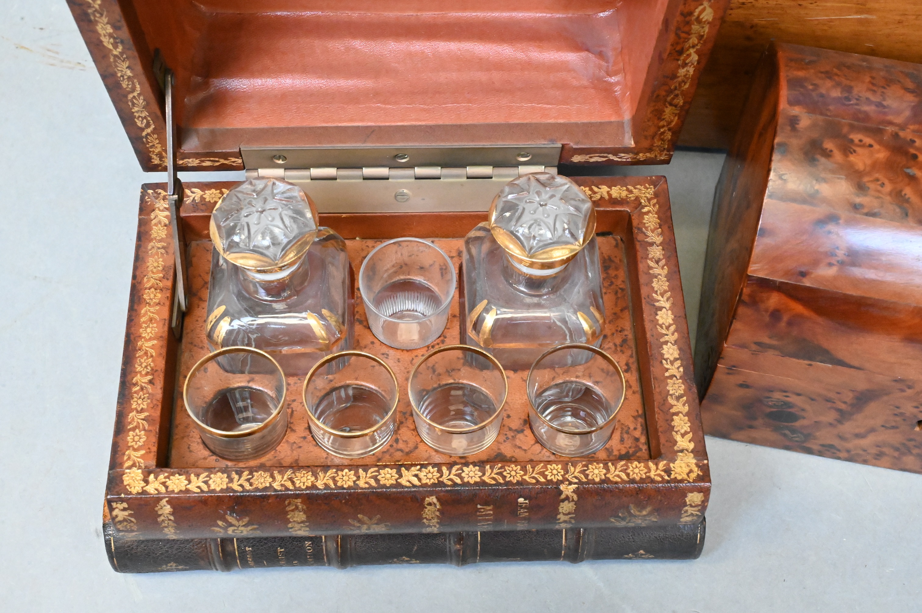 French Tantalus, hidden decanter book box having two small decanters along with five gilt rimmed shot glasses, small burlwood veneer dome top chest, long rectangular wooden storage box
