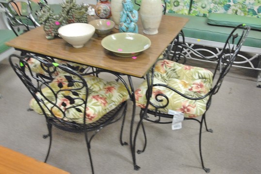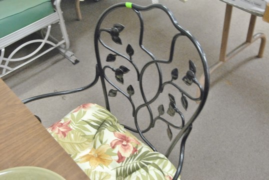 Iron table and four chairs, table: ht. 30 in. top: 34 x 34.