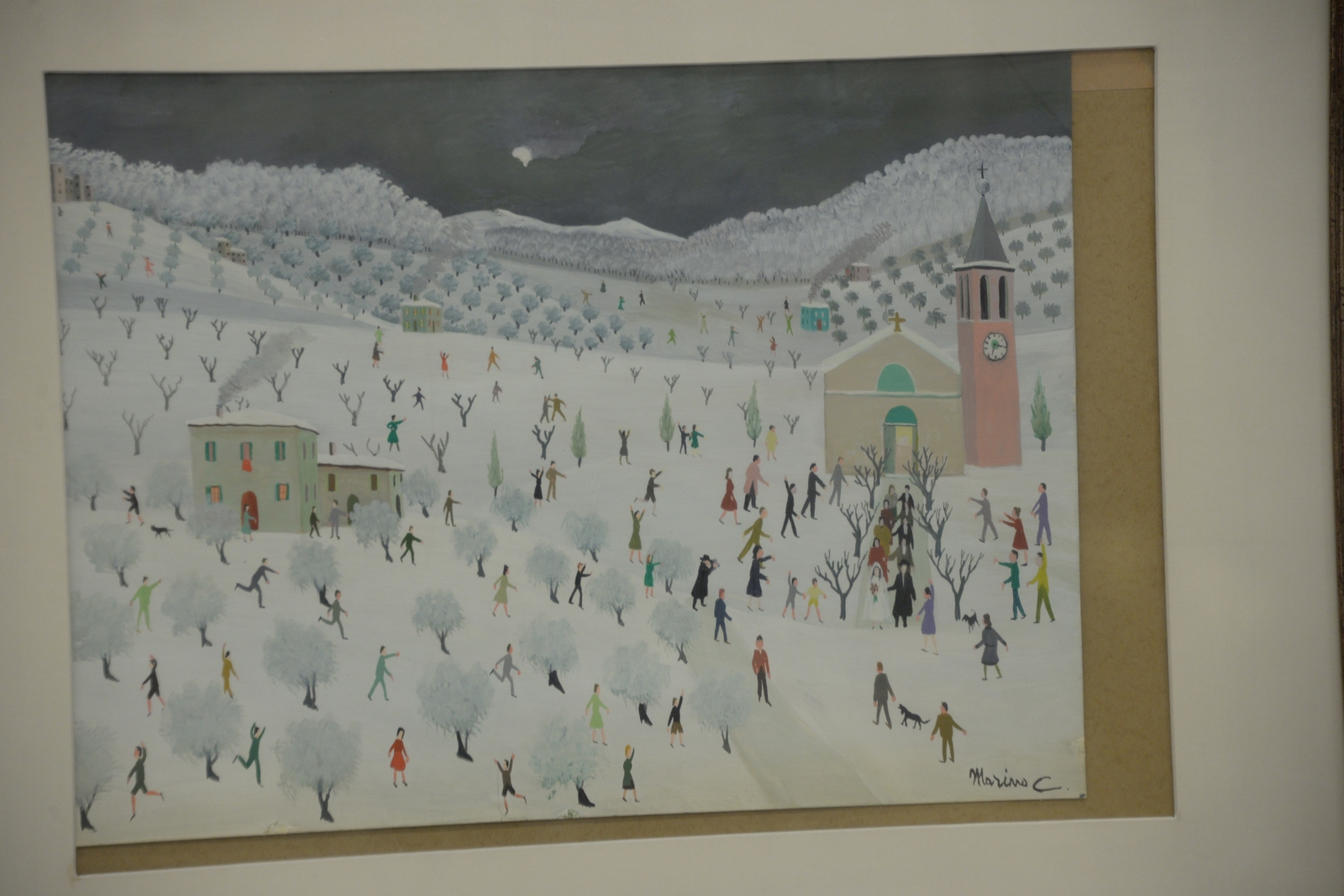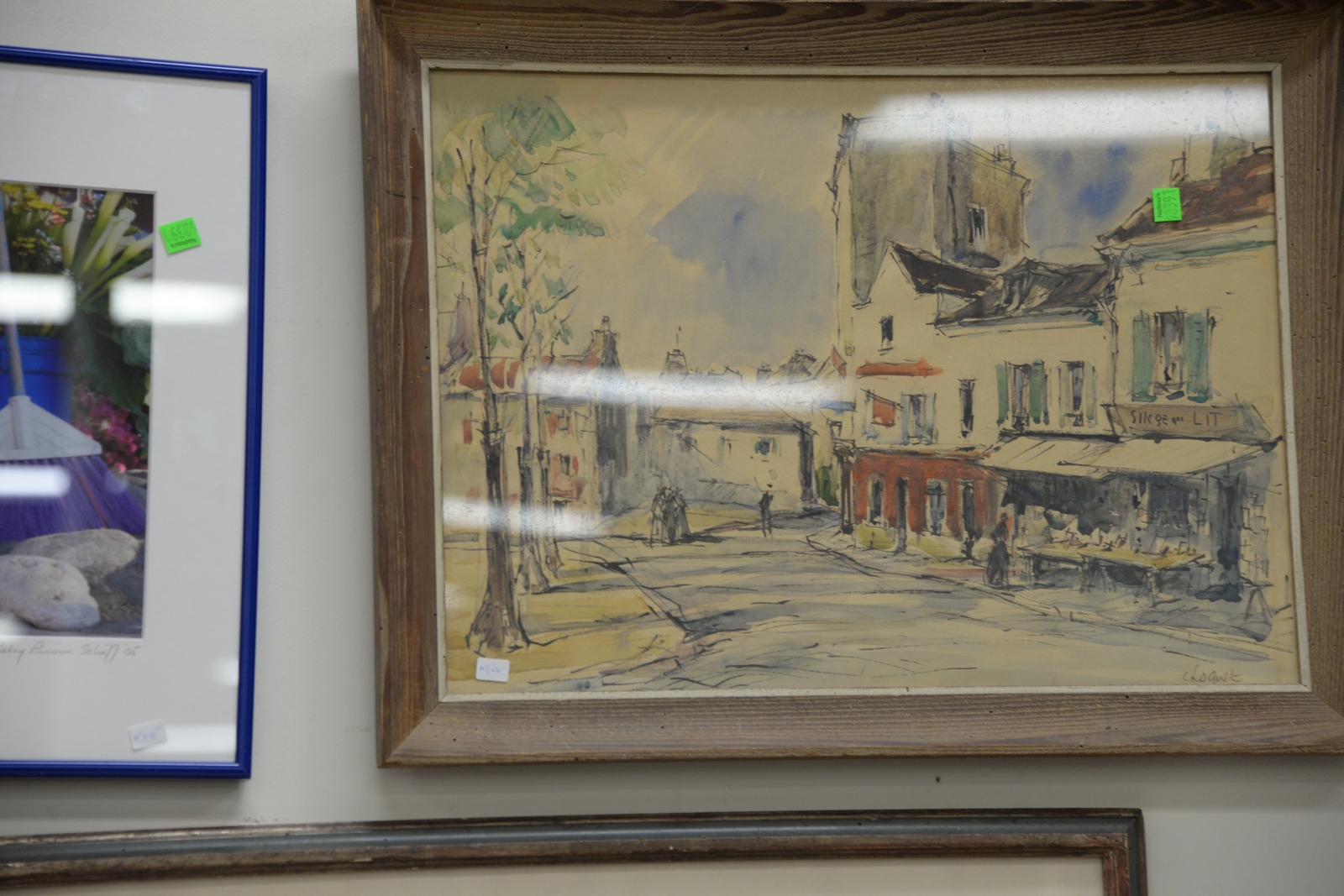 Lot 487: Nine framed pieces to include watercolor French market signed Choquet, oil on paper winter landscape scene signed Marino C., Betsy P…