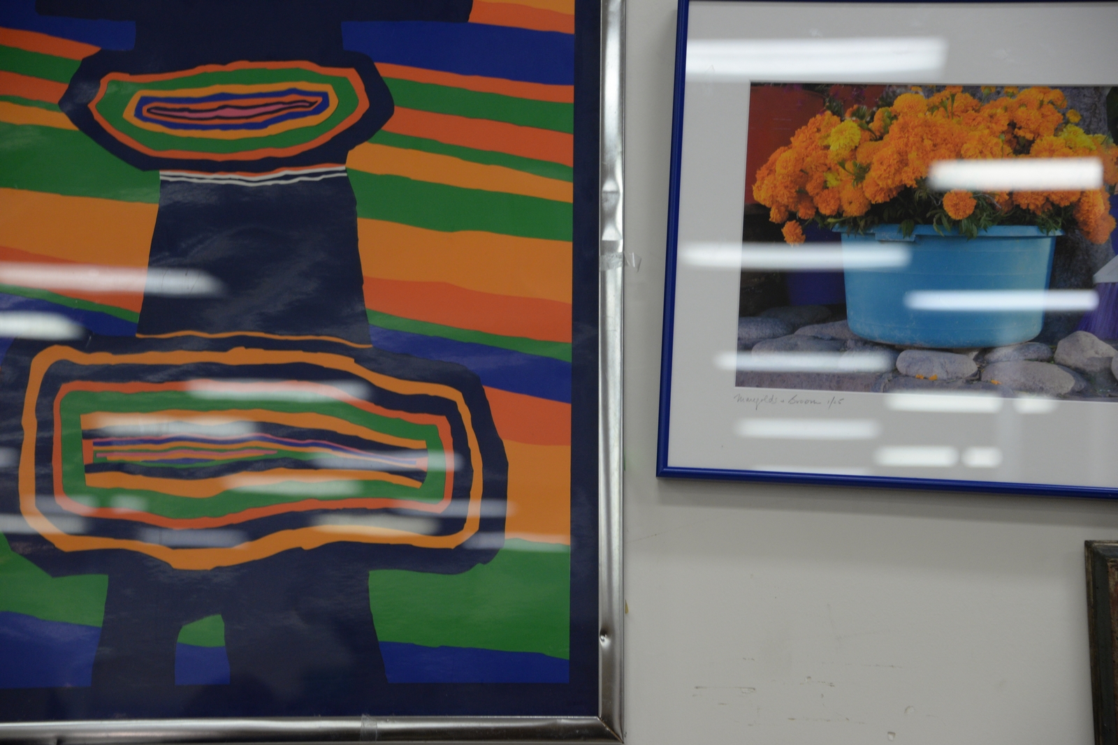 Nine framed pieces to include watercolor French market signed Choquet, oil on paper winter landscape scene signed Marino C., Betsy Pinover Schiff photograph Marigolds & Broom signed, two oil on canvas abstracts unsigned, and four prints.